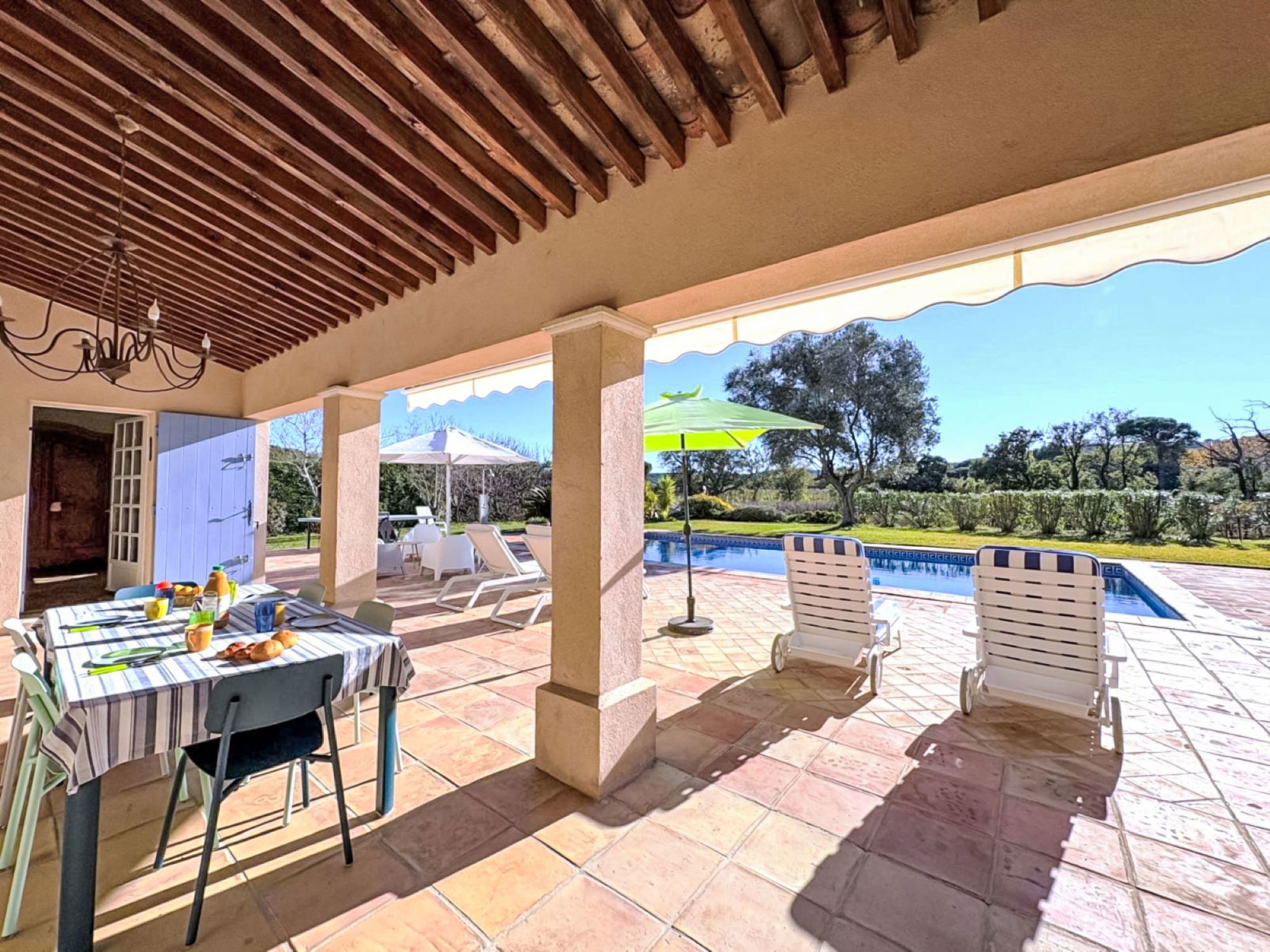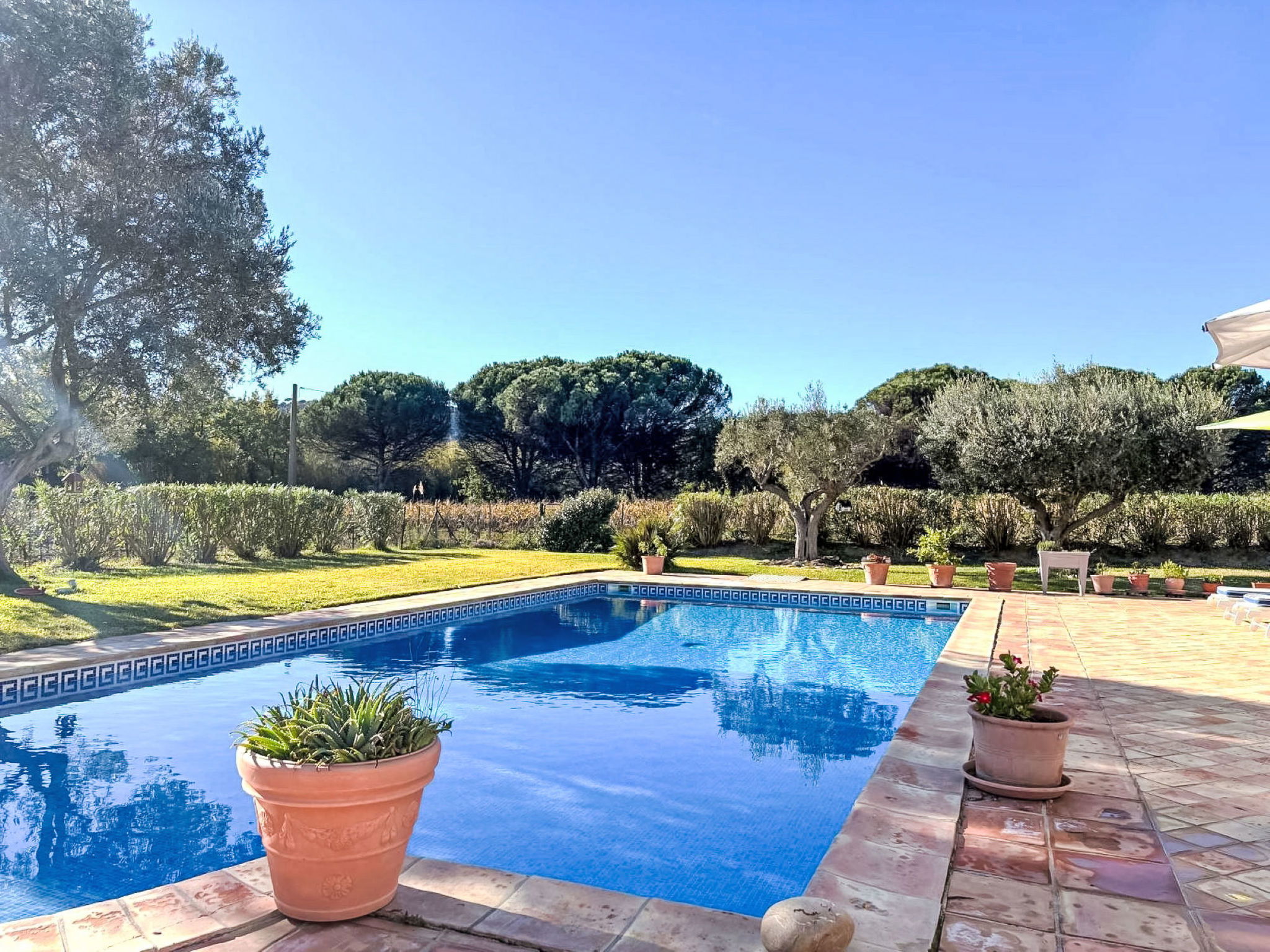 Ramatuelle: Single-family house "Le Grand Pin", surrounded by vineyards. Outside the resort, 4 km from the centre of Ramatuelle, in a quiet position, 3 km from the sea, 3 km from the beach. Private: well-kept garden 800 m2 (fenced), swimming pool angular (12 x 6 m, depth 100 - 180 cm, seasonal availability: 01.May. - 30.Sep.). Shop 4 km, grocery 4 km, supermarket 10 km, restaurant 3 km, bus stop "Les Combes Jauffret" 700 m, sandy beach "L'Escalet" 3 km. Sports harbour 9 km, sailing school 12 km, tennis 2 km, minigolf 10 km. Nearby attractions: Plages de Pampelonne 5 km, Saint-Tropez 10 km, Parc d'atractions Azur Park 10 km, Port Grimaud 12 km, Cannes 92 km, Nice 110 km. Please note: car recommended. The keys‘ handover takes place by the agency in Gassin, 9 km.