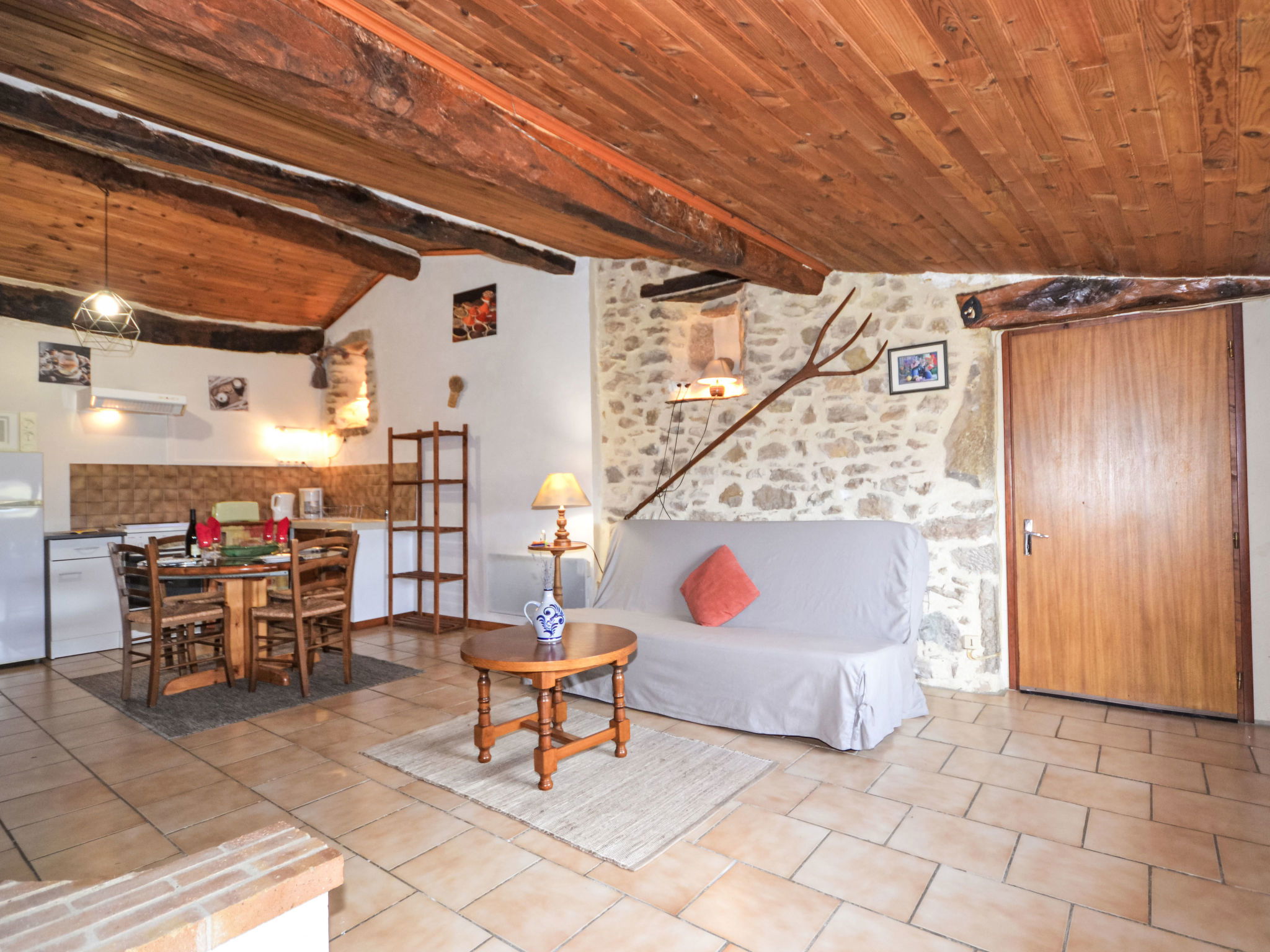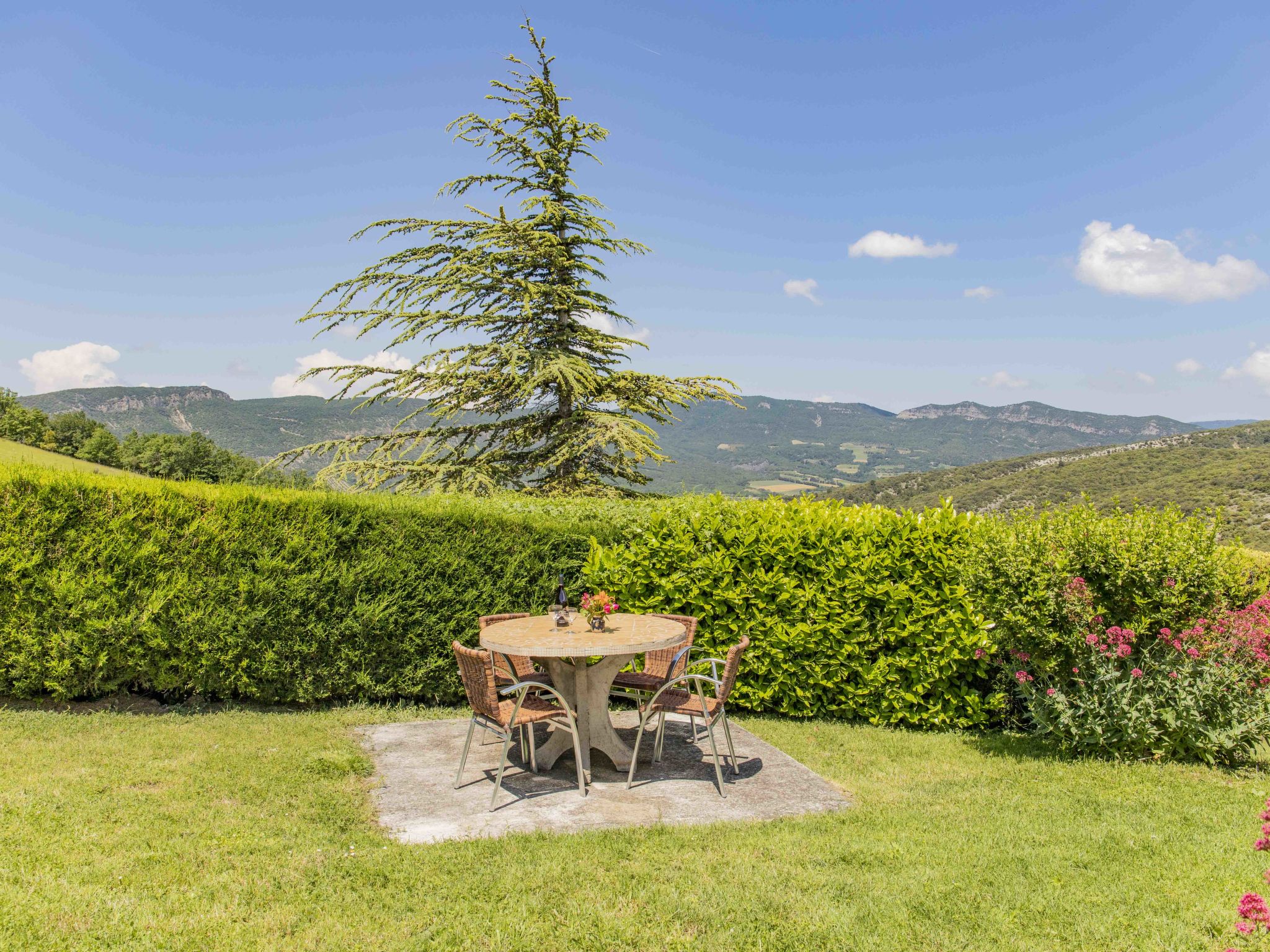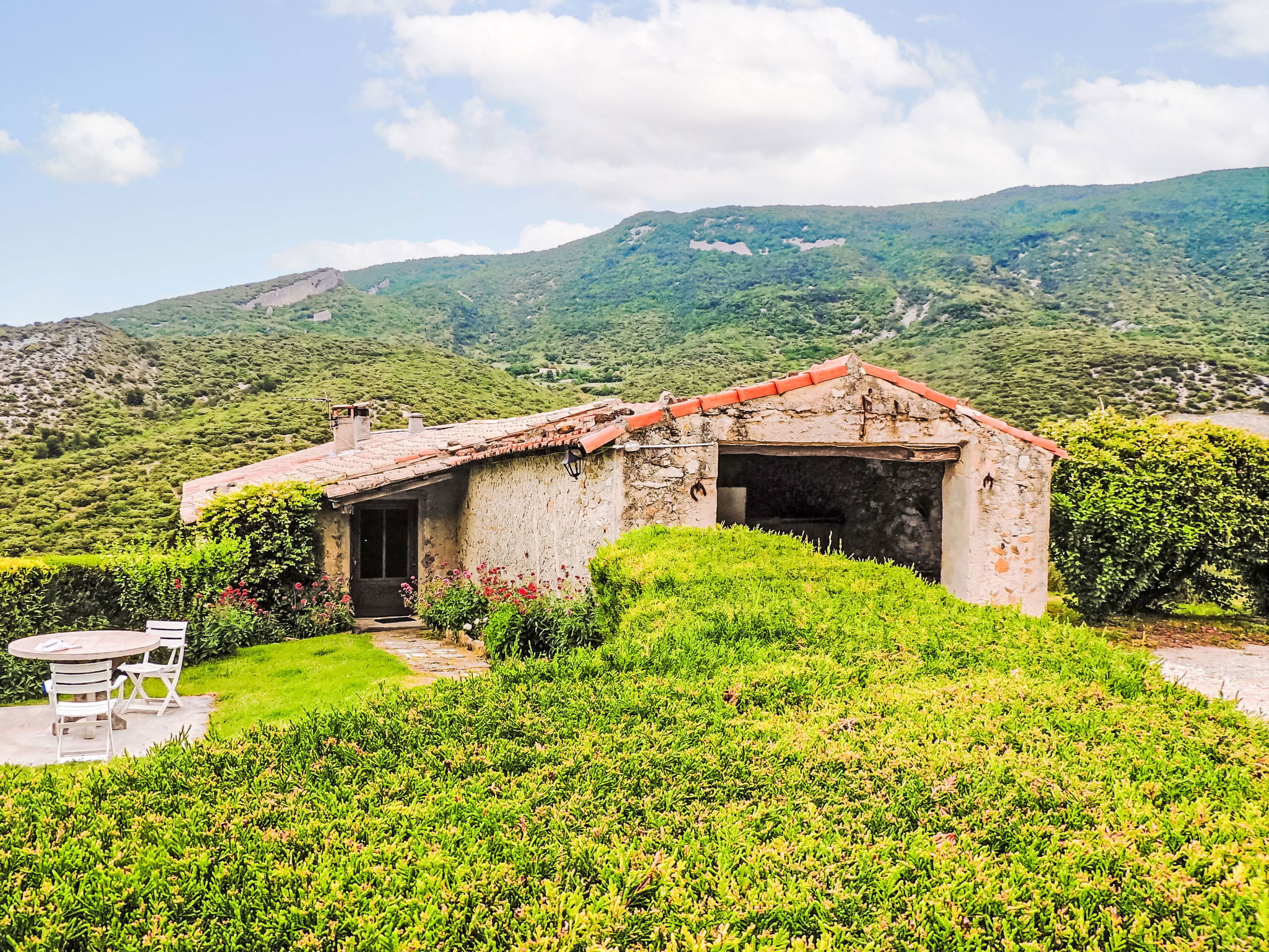 "Le Cèdre", 2-room terraced house 70 m2. Practical and rustic furnishings: living/sleeping room with 1 double sofabed (140 cm, length 190 cm), open-hearth fireplace, dining table and TV. 1 room with 1 french bed (140 cm, length 190 cm), TV. Small, open kitchen (oven, 4 gas rings, toaster, kettle, microwave, freezer, electric coffee machine). Shower/WC. Electric heating. Terrace roofed, small garden 50 m2. Terrace furniture, barbecue (portable), deck chairs (4). Beautiful panoramic view of the mountains and the countryside. Facilities: washing machine, iron, children's high chair, baby cot. Internet (WiFi, free). Parking (2 cars). Please note: maximum 1 pet/ dog allowed. Smoke alarm, fire extinguisher.
