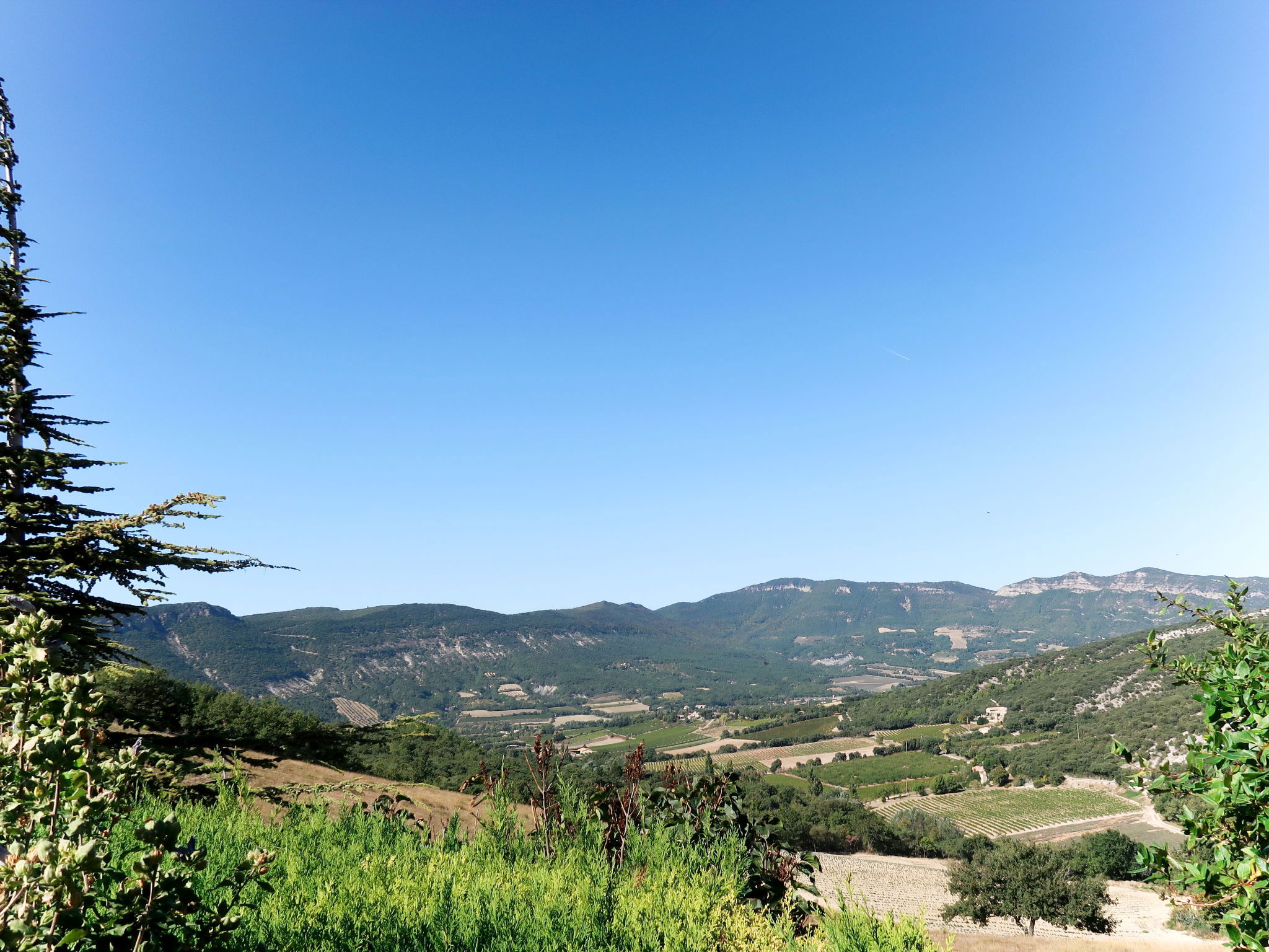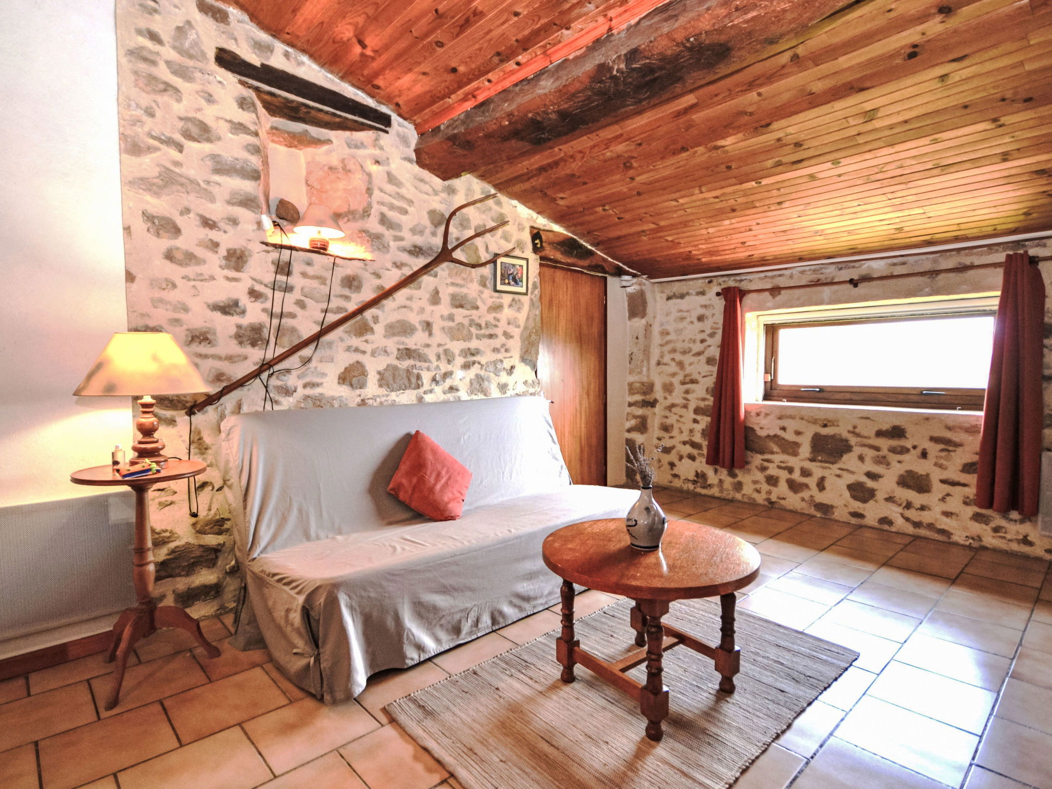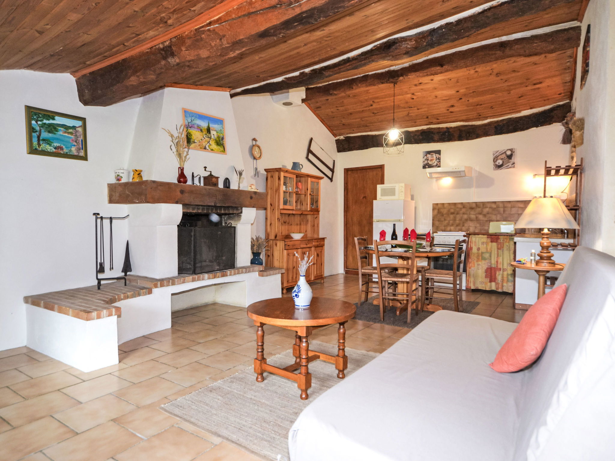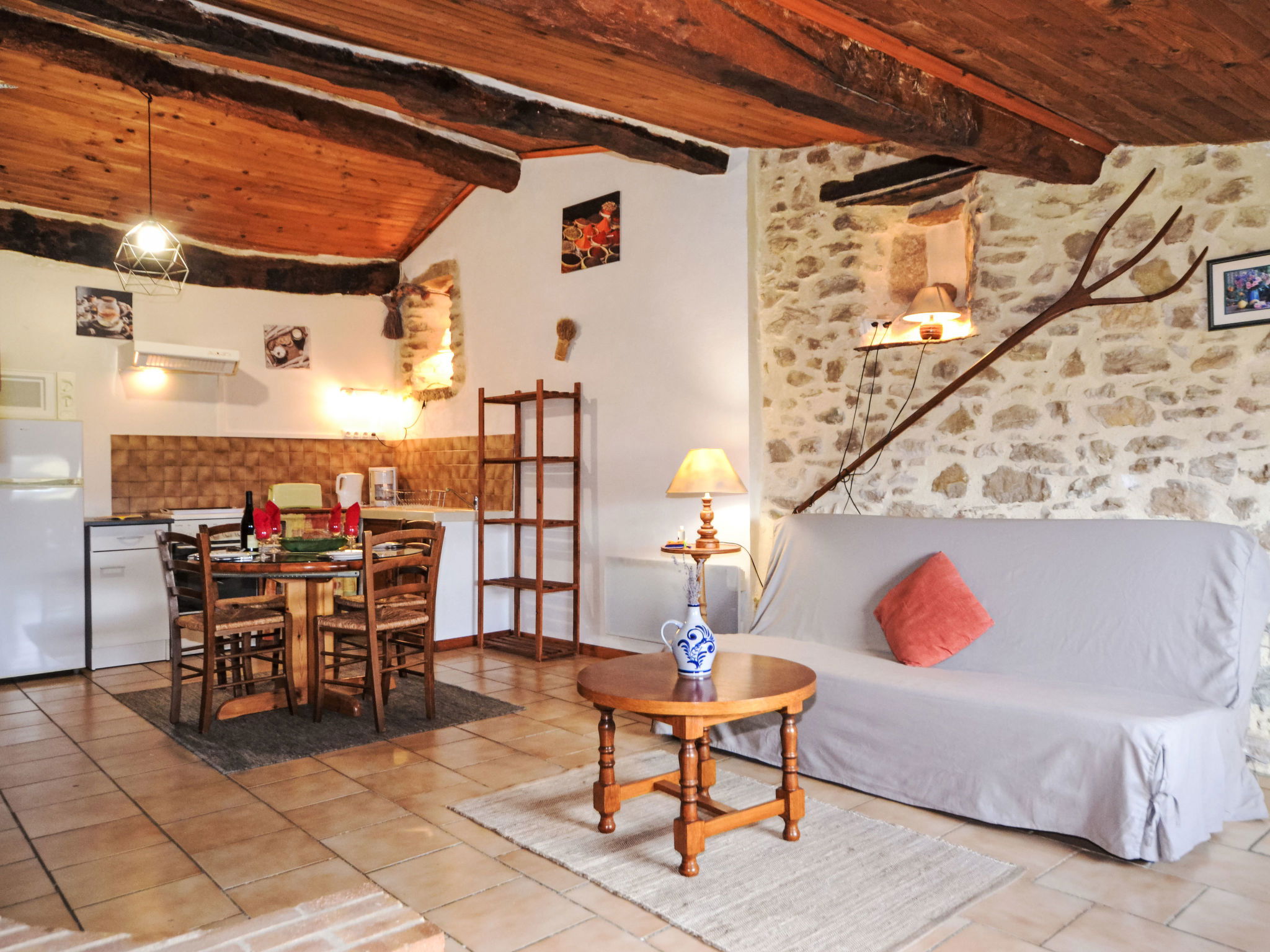 "Le Cèdre", 2-room terraced house 70 m2. Practical and rustic furnishings: living/sleeping room with 1 double sofabed (140 cm, length 190 cm), open-hearth fireplace, dining table and TV. 1 room with 1 french bed (140 cm, length 190 cm), TV. Small, open kitchen (oven, 4 gas rings, toaster, kettle, microwave, freezer, electric coffee machine). Shower/WC. Electric heating. Terrace roofed, small garden 50 m2. Terrace furniture, barbecue (portable), deck chairs (4). Beautiful panoramic view of the mountains and the countryside. Facilities: washing machine, iron, children's high chair, baby cot. Internet (WiFi, free). Parking (2 cars). Please note: maximum 1 pet/ dog allowed. Smoke alarm, fire extinguisher.