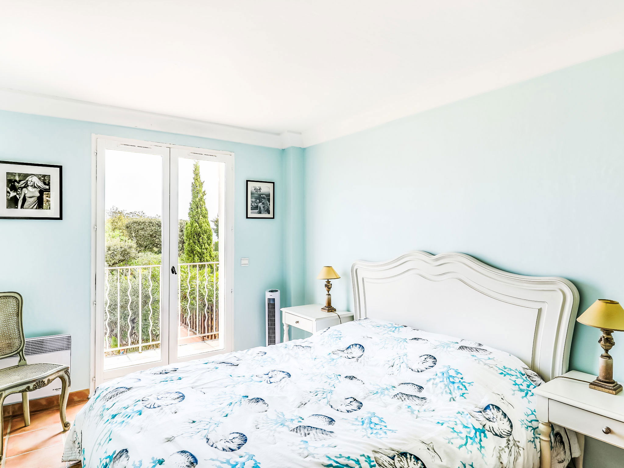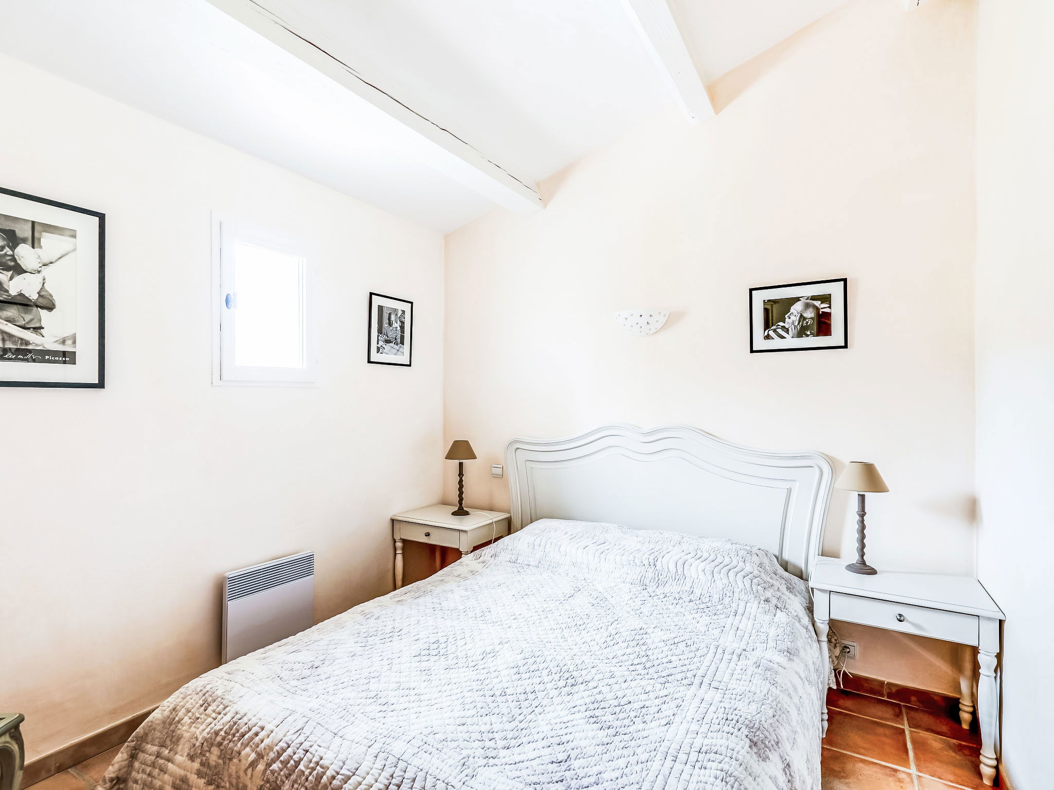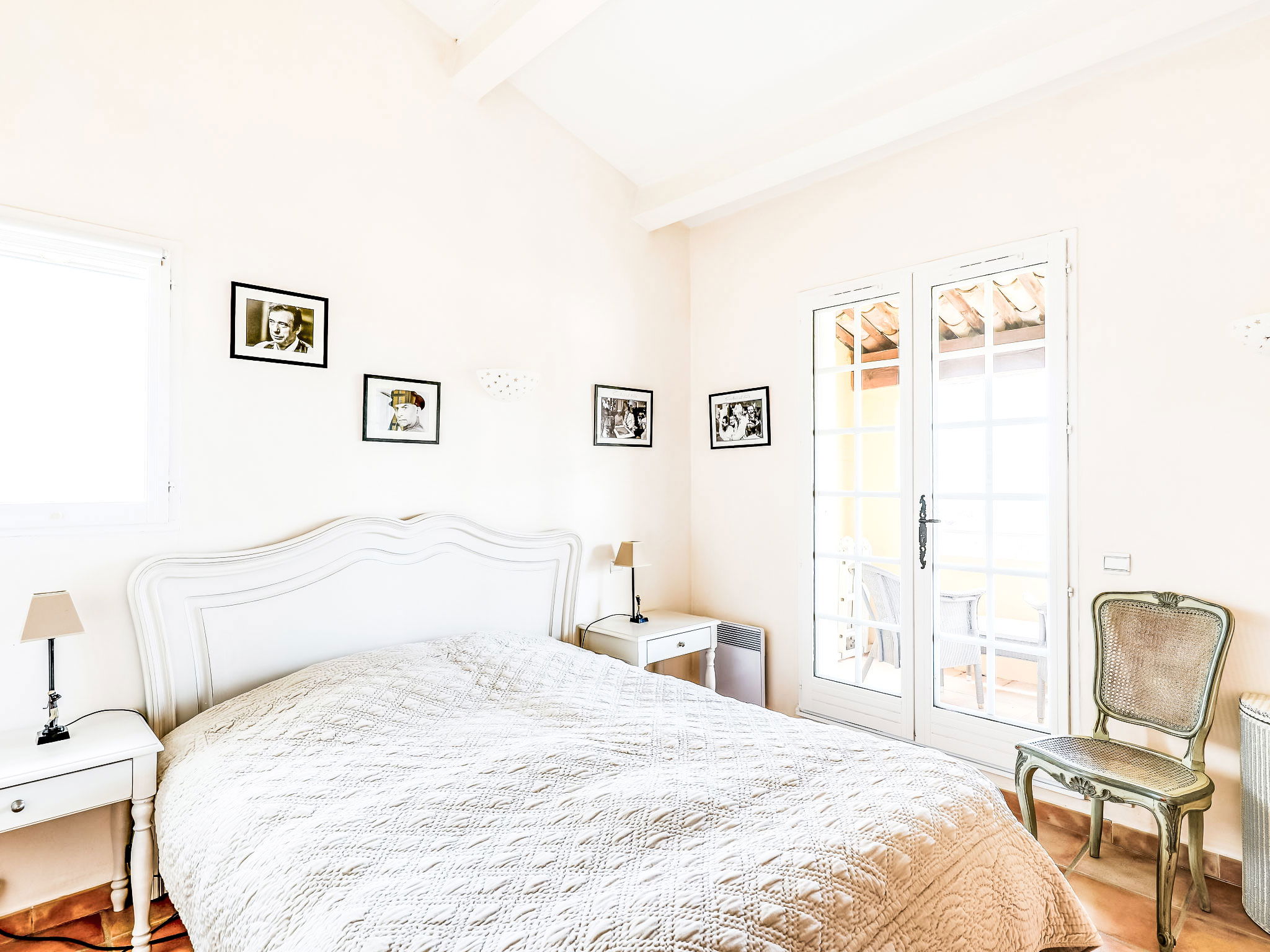 5-room terraced house 130 m2 on 3 levels. Comfortable and beautiful furnishings: living/dining room with TV (flat screen), air conditioning. Exit to the garden, to the terrace. Open kitchen (oven, dishwasher, 4 ceramic glass hob hotplates, toaster, kettle, microwave, freezer, electric coffee machine). Sep. WC. Upper floor: 1 room with 1 french bed (1 x 160 cm, length 200 cm), fan. Exit to the balcony. 1 room with 1 french bed (1 x 160 cm, length 200 cm), shower/WC. Bathroom. 2nd upper floor: 1 room with 1 french bed (1 x 160 cm, length 200 cm), shower/WC and fan. 1 room with 1 french bed (1 x 160 cm, length 200 cm), shower/WC. Exit to the terrace. Balcony 2 m2, terrace 9 m2, roofed terrace 18 m2, roofed, patio 40 m2. Terrace furniture, barbecue, deck chairs (2). View of the sea. Facilities: washing machine, iron, hair dryer. Internet (WiFi, free). Please note: 1 pet/ dog allowed. Smoke alarm. 83107000272MM