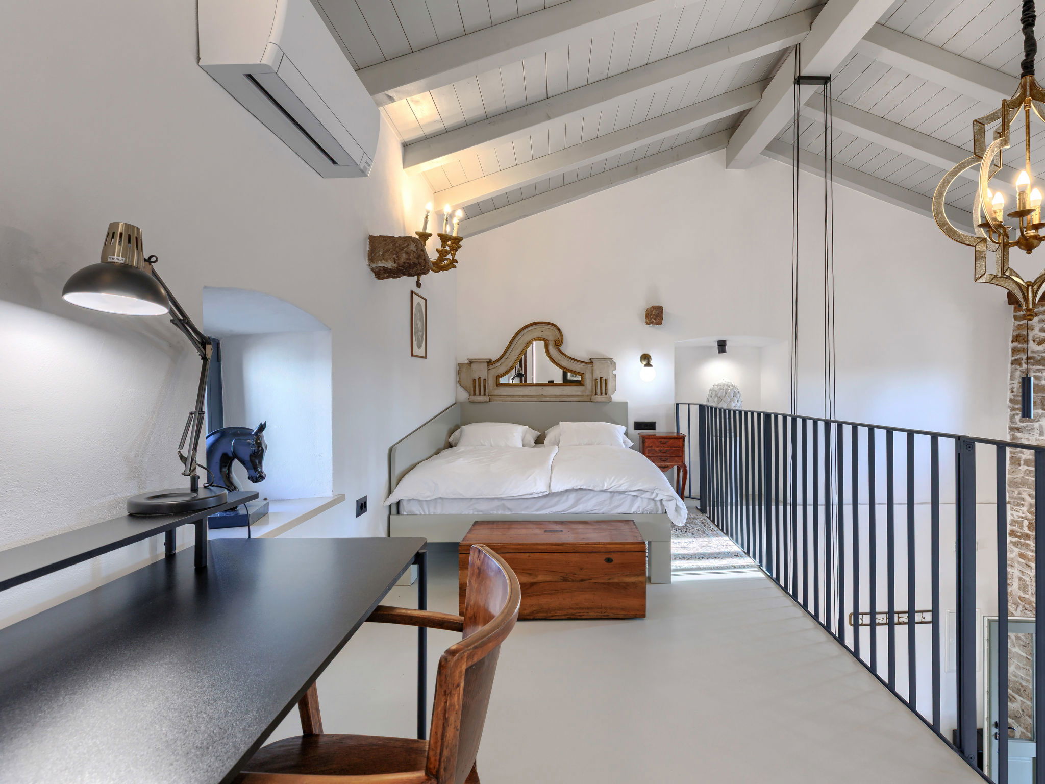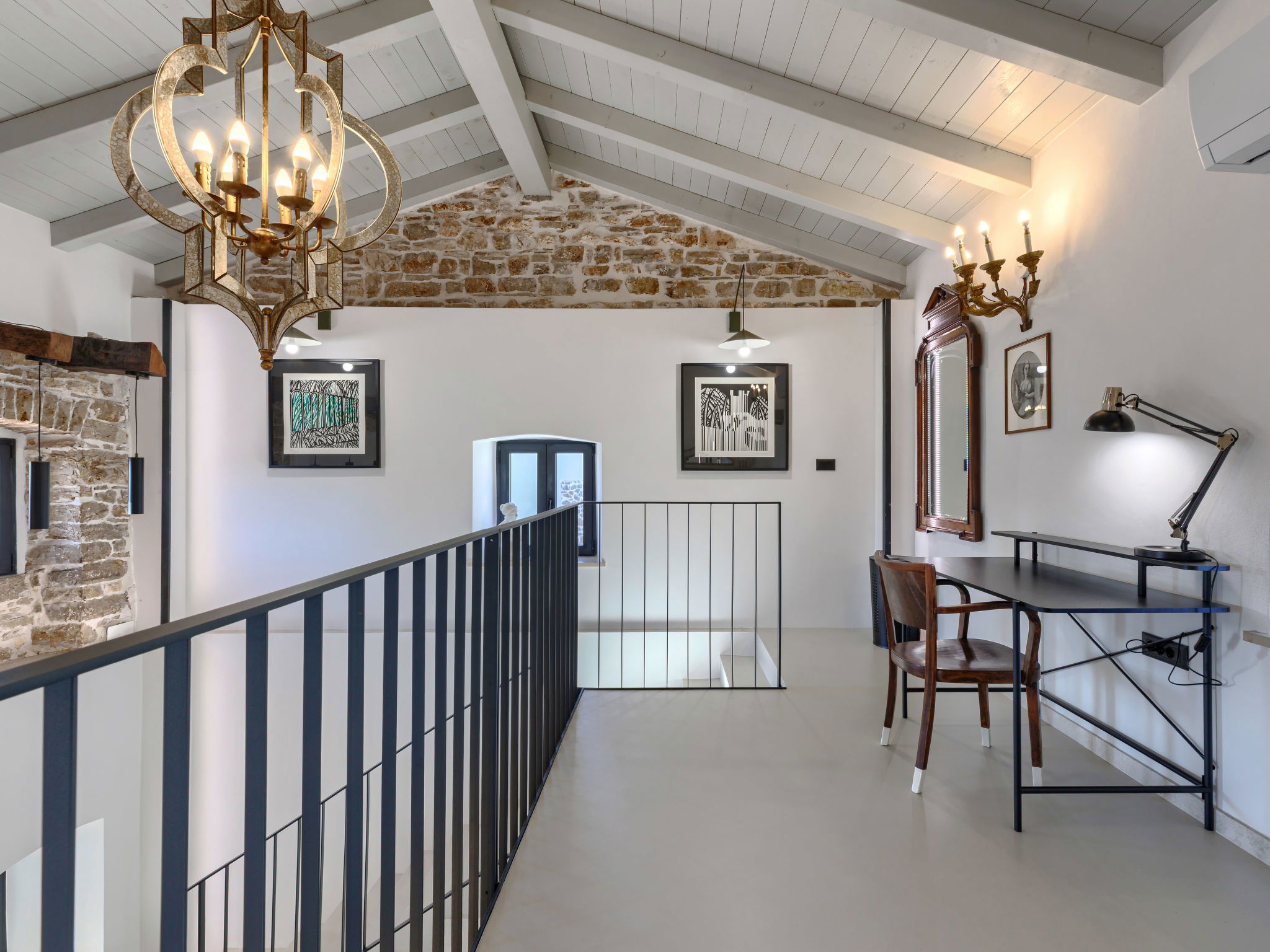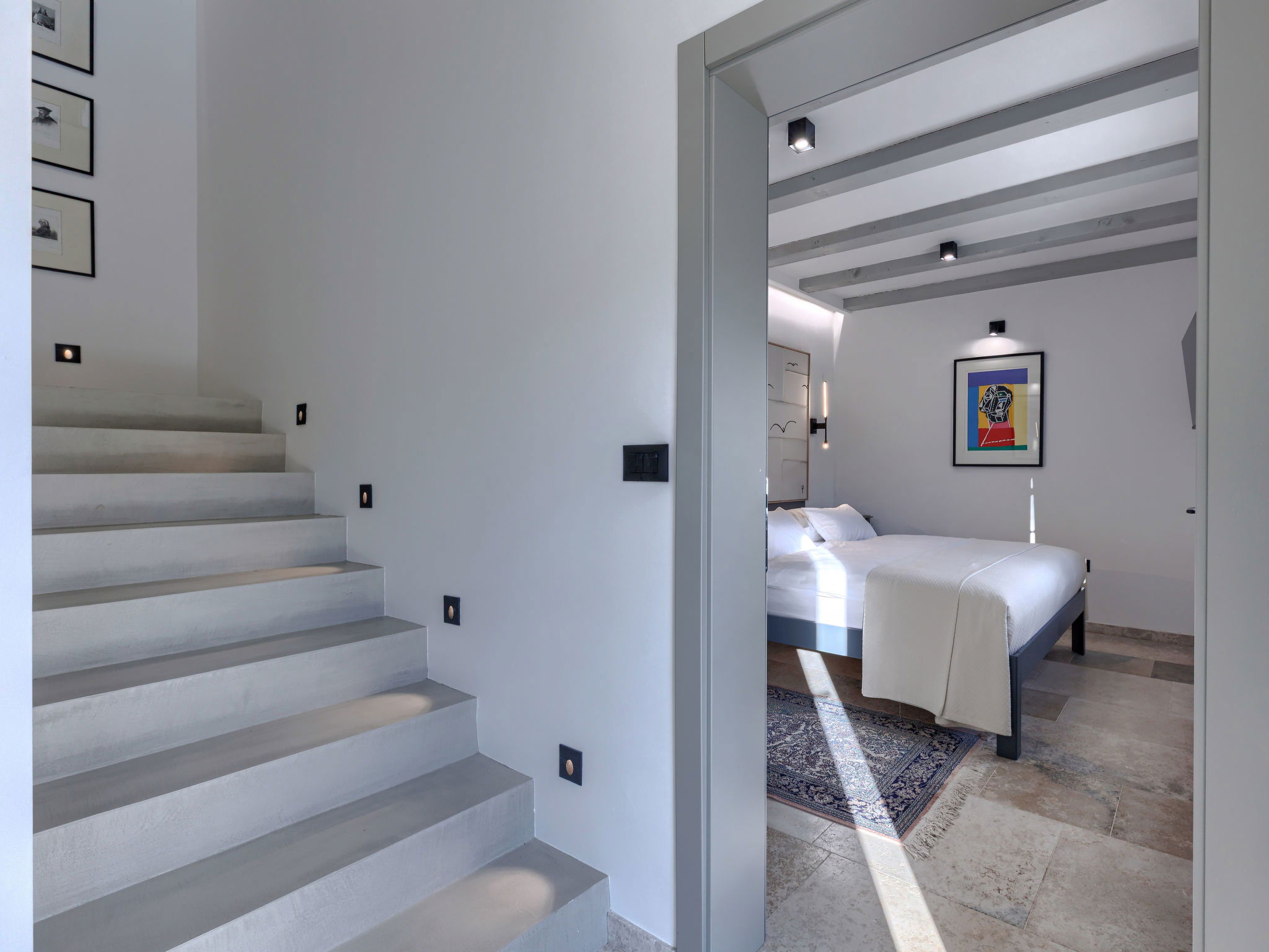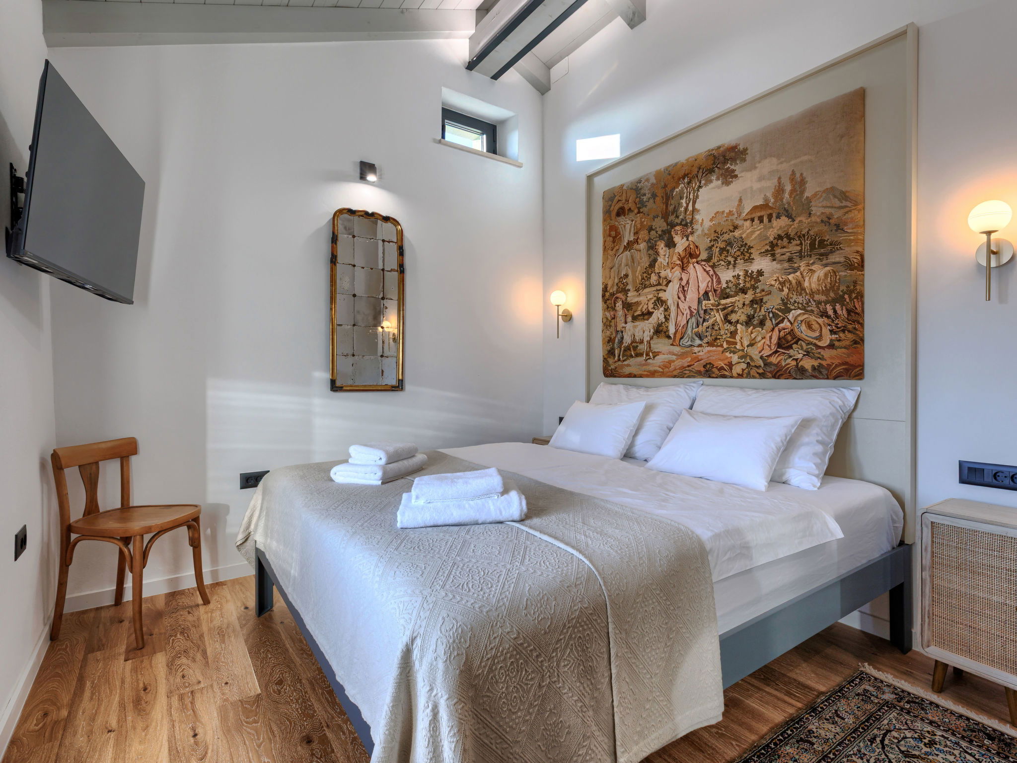 5-room house 220 m2 on 2 levels. Very tasteful and stylish furnishings: living/dining room with open-hearth fireplace (only for decoration), kitchen corner and satellite TV (flat screen). Exit to the terrace, to the swimming pool. Living/dining room with satellite TV (flat screen). Exit to the terrace, to the swimming pool. 1 room with 1 french bed (180 cm, length 200 cm), shower/WC. Open kitchen (oven, dishwasher, 4 gas rings, freezer, electric coffee machine). Shower/WC, sep. WC. Upper floor: 2 rooms, each room with 1 french bed (180 cm, length 200 cm), shower/WC and satellite TV (flat screen). Exit to the terrace, to the swimming pool. Open gallery with 1 french bed (160 cm, length 200 cm). Forced-air heating. Terrace furniture, deck chairs. Facilities: Internet (WiFi, free). 2 pets/ dogs allowed. No internal connecting door between the separated properties. One house with living/dining area and open kitchen and one bedroom on the ground floor, 2 bedrooms on the floor. The other house with living/dining area and open kitchen on the ground floor, open gallery on the floor. Instead of an enclosed bedroom, some sleeping areas are located in an open-plan area (gallery, alcove, etc.).