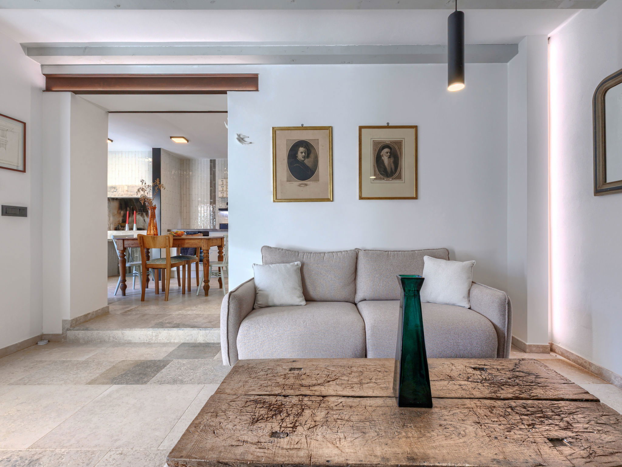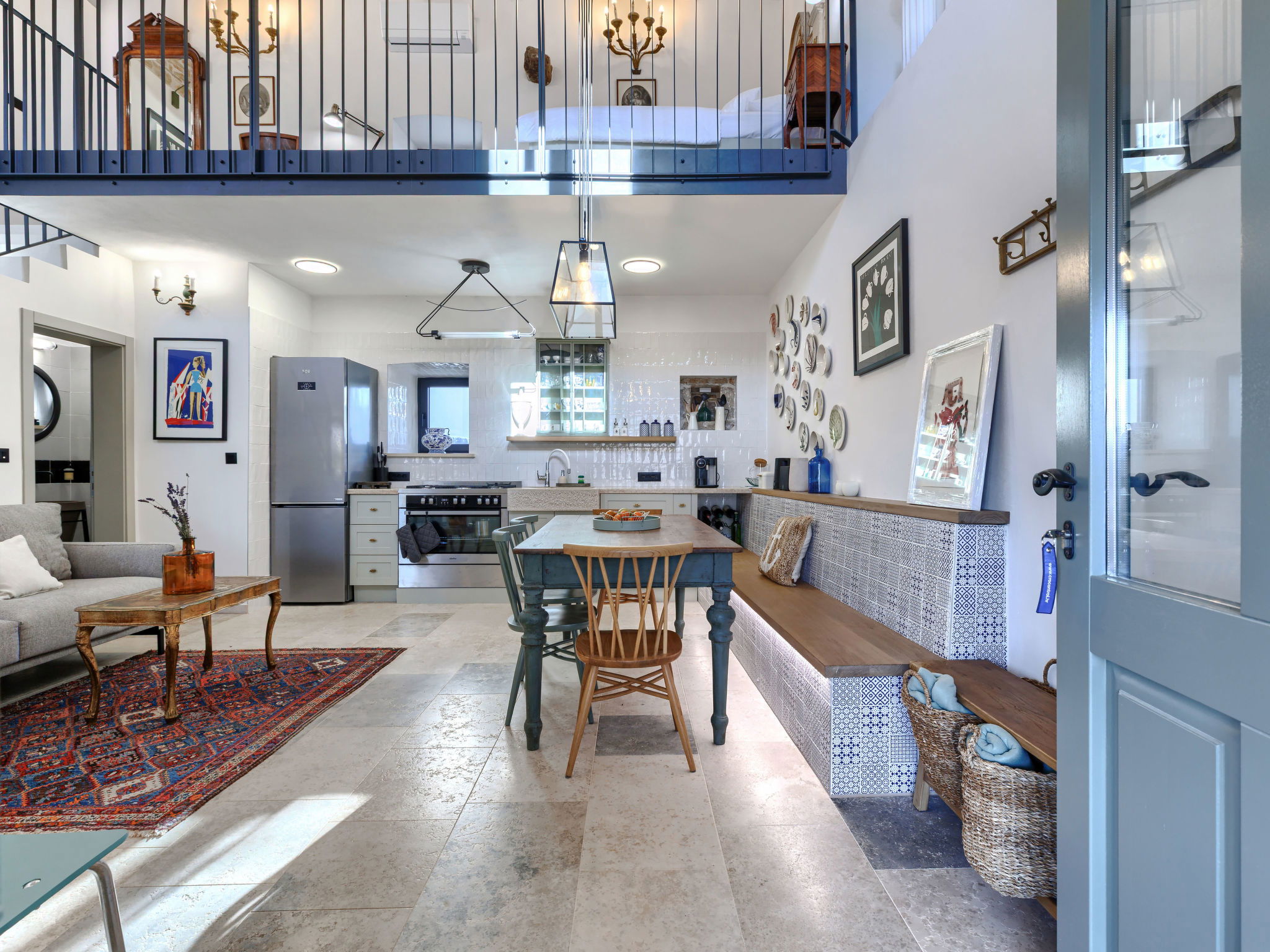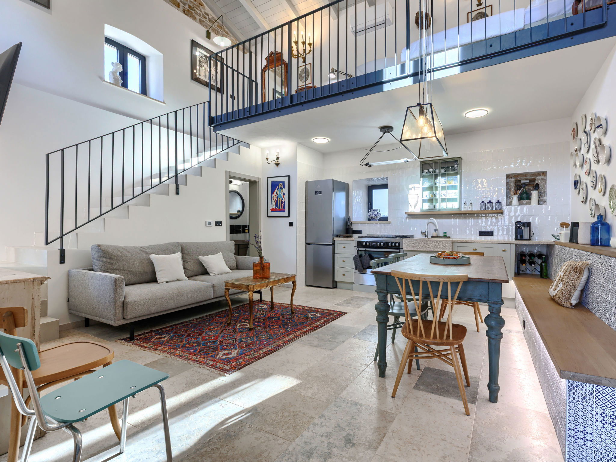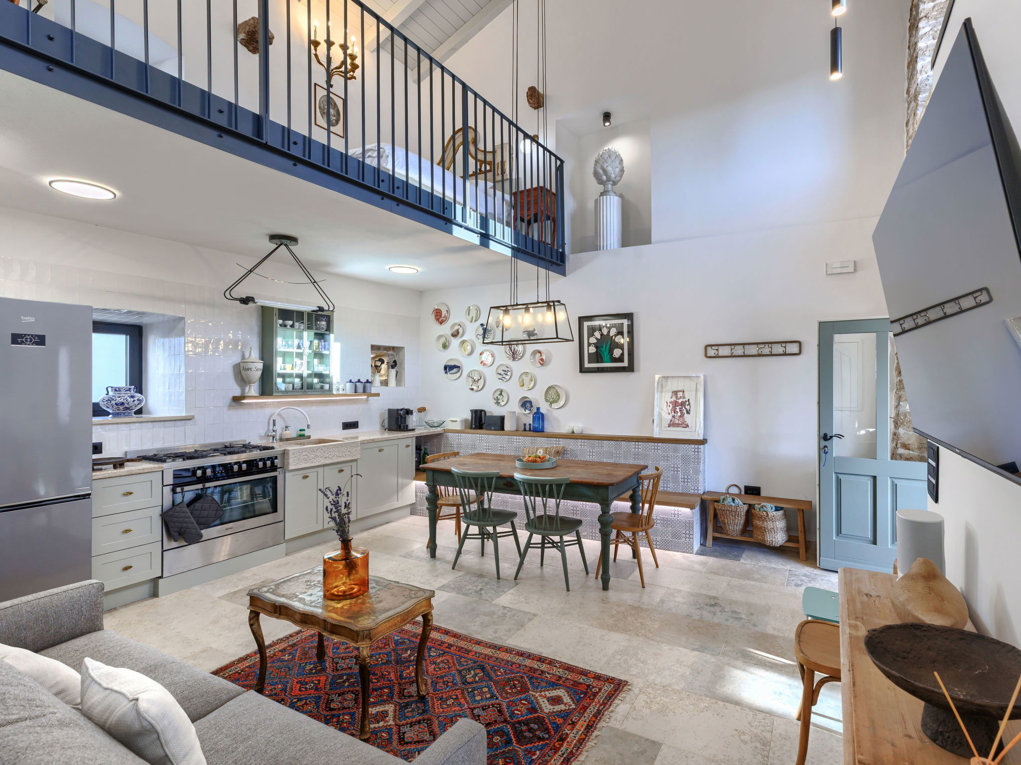 5-room house 220 m2 on 2 levels. Very tasteful and stylish furnishings: living/dining room with open-hearth fireplace (only for decoration), kitchen corner and satellite TV (flat screen). Exit to the terrace, to the swimming pool. Living/dining room with satellite TV (flat screen). Exit to the terrace, to the swimming pool. 1 room with 1 french bed (180 cm, length 200 cm), shower/WC. Open kitchen (oven, dishwasher, 4 gas rings, freezer, electric coffee machine). Shower/WC, sep. WC. Upper floor: 2 rooms, each room with 1 french bed (180 cm, length 200 cm), shower/WC and satellite TV (flat screen). Exit to the terrace, to the swimming pool. Open gallery with 1 french bed (160 cm, length 200 cm). Forced-air heating. Terrace furniture, deck chairs. Facilities: Internet (WiFi, free). 2 pets/ dogs allowed. No internal connecting door between the separated properties. One house with living/dining area and open kitchen and one bedroom on the ground floor, 2 bedrooms on the floor. The other house with living/dining area and open kitchen on the ground floor, open gallery on the floor. Instead of an enclosed bedroom, some sleeping areas are located in an open-plan area (gallery, alcove, etc.).
