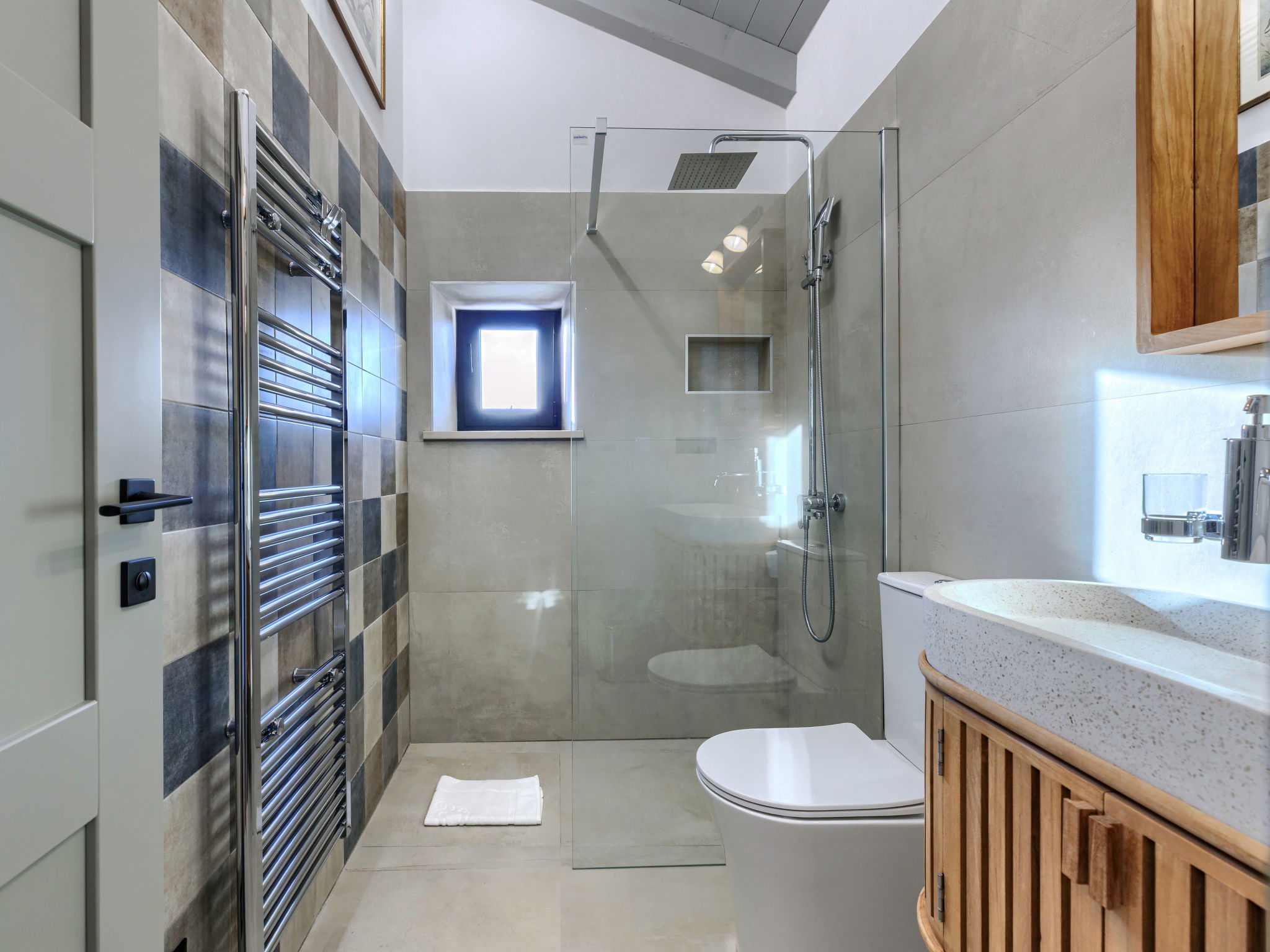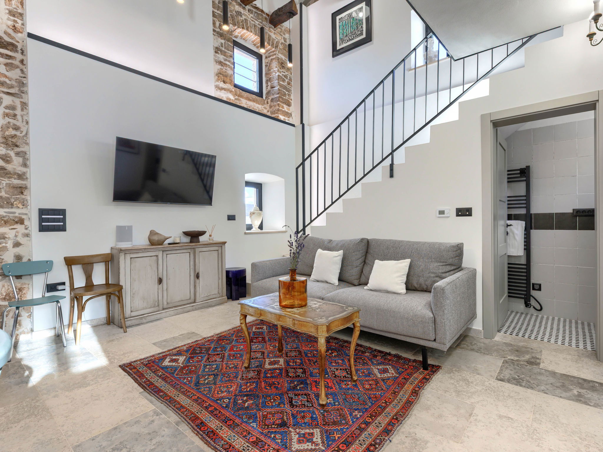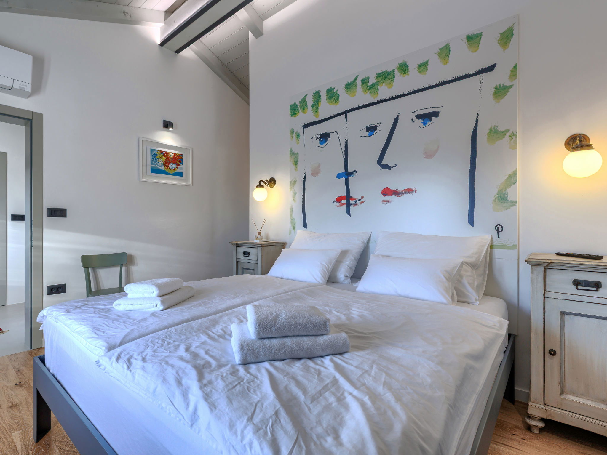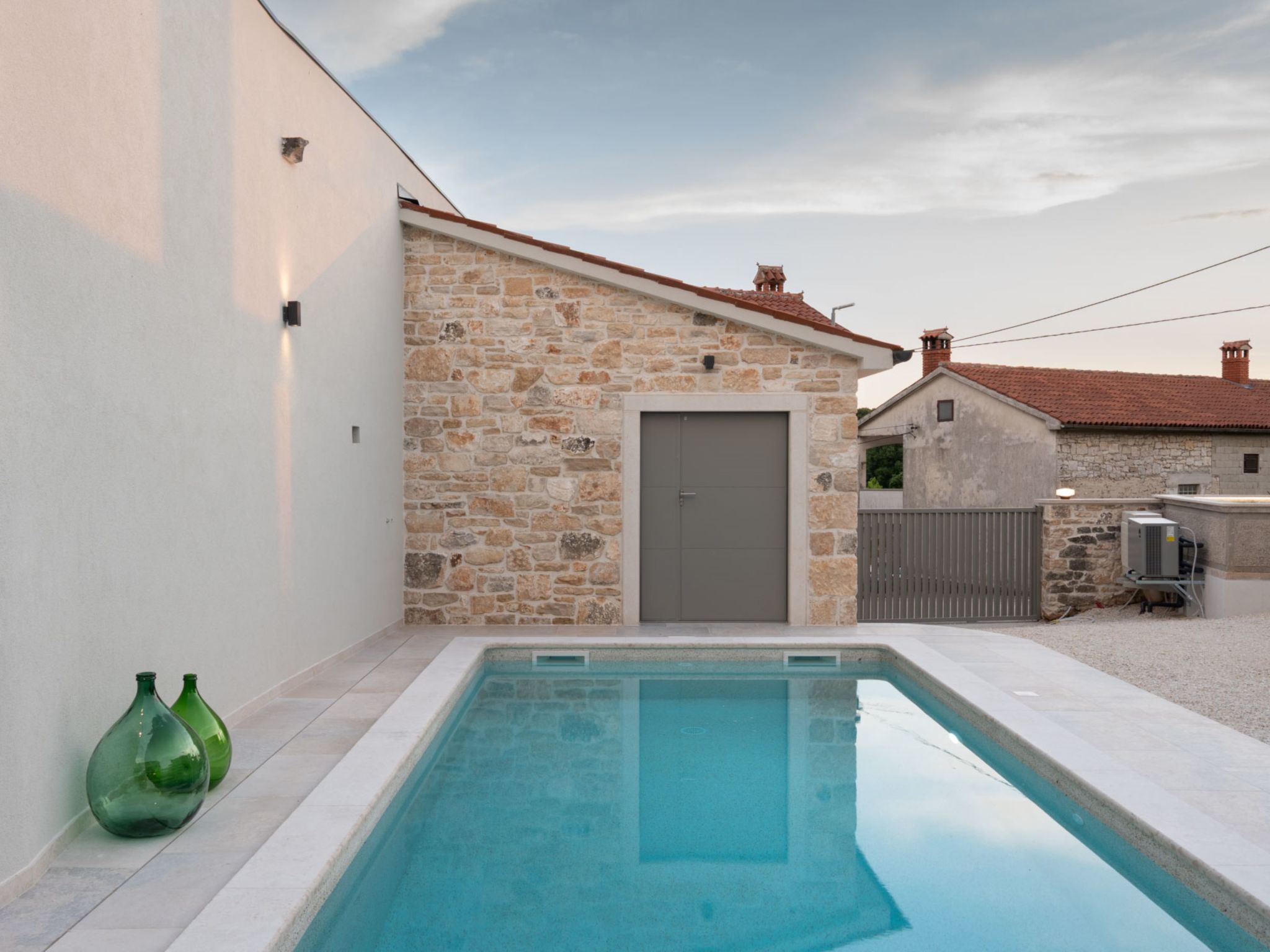 Very beautiful house "La Gioia", 2 storeys. In the hamlet Rudani 7 km from the centre of Žminj, 20 km from the sea. Private: property 750 m2 (fenced), swimming pool angular, heated (7 x 3 m, depth 140 cm, seasonal availability: 01.Apr. - 01.Nov.) with internal staircase and salt-electrolysis pool-cleaning system. Outdoor shower, terrace (20 m2), garden furniture, barbecue. In the house: internet access, air conditioning, washing machine. Parking at the house on the premises. E-charging station. Supermarket 9 km, café 7 km, internet café 7 km, bus stop 10 km, pebble beach 20 km. The owner does not accept any youth groups. Please note: airfield 32 km from the property. The unit consists of 2 houses rented as one unit. Heated swimming pool (extra). It is necessary to notify us 7 days in advance if you wish to have the pool heating turned on.