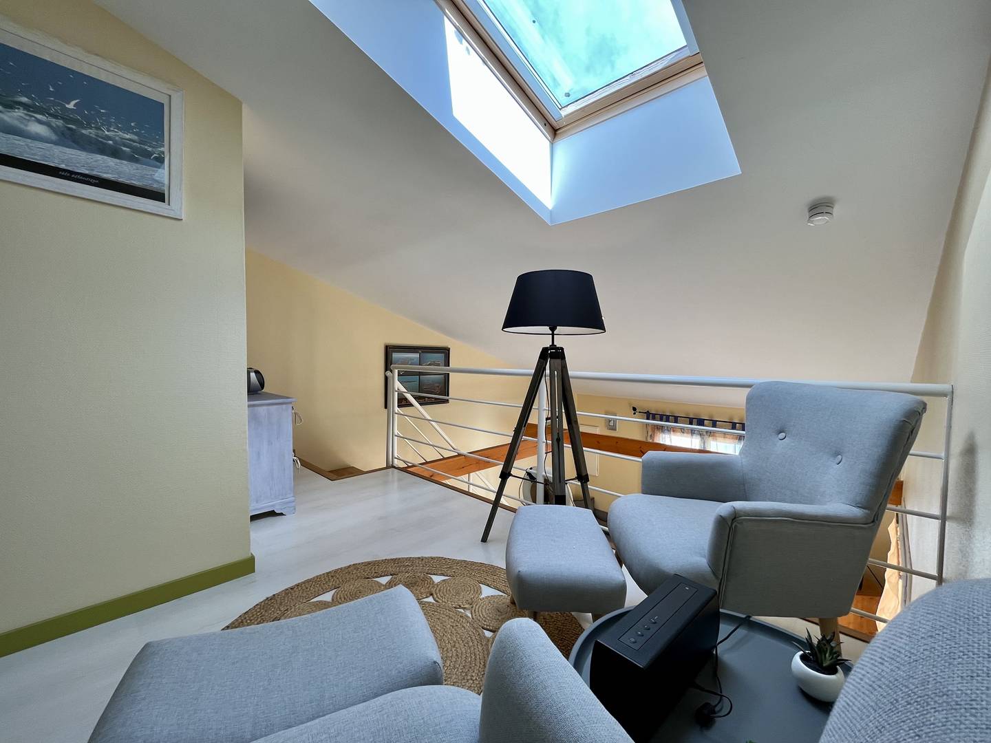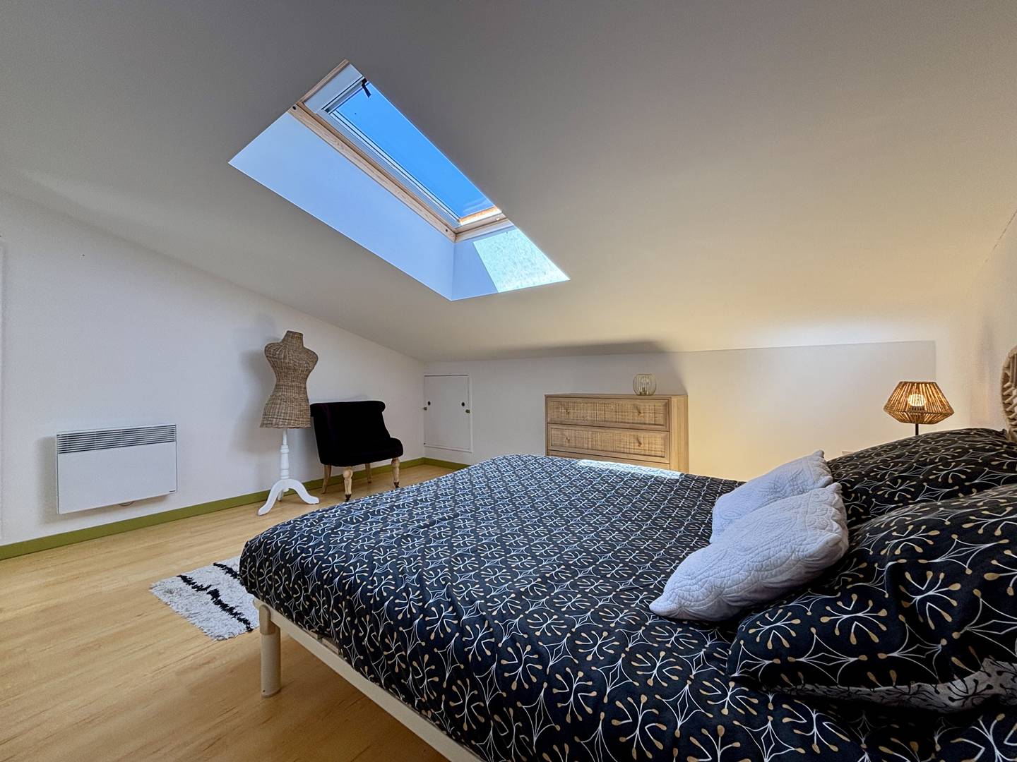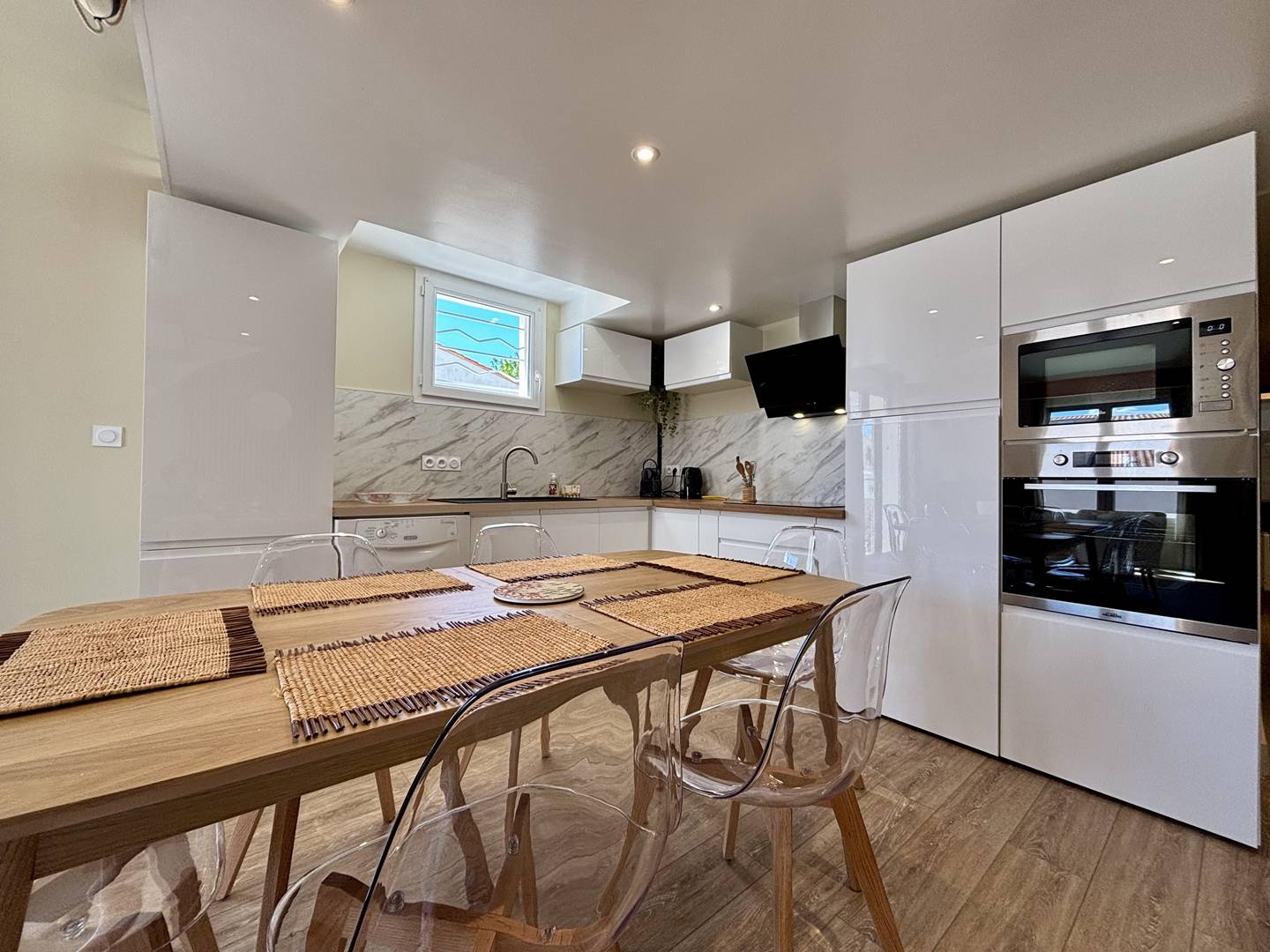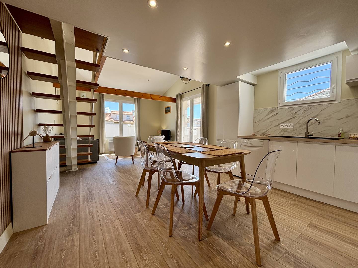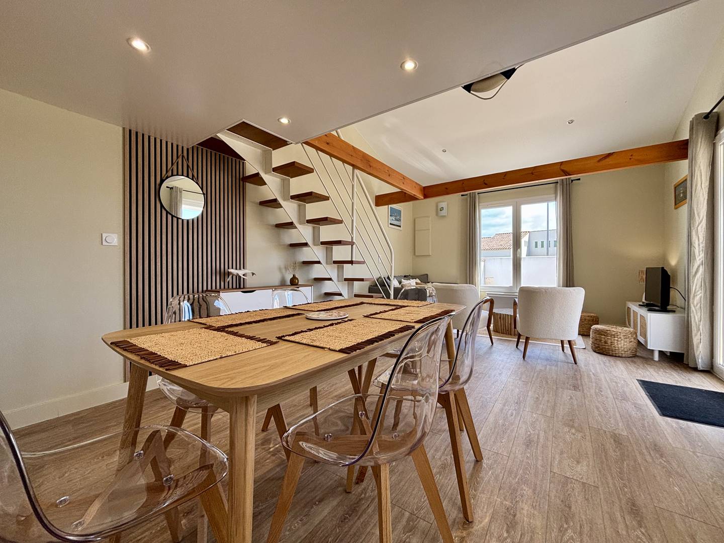 Saint Denis d'Oléron (17) - North of the island 4-room house and mezzanine - approx. 75 m² - up to 6 people Charming holiday home close to the town center and on the edge of La Boirie beach. It consists of a living room with lounge/dining room, a fitted and equipped kitchen area with dishwasher, a bedroom with a double bed (160) and dressing room, a second bedroom with a double bed (160) and dressing room, a bathroom with shower cubicle and washbasin as well as a separate toilet. Upstairs, a mezzanine with a relaxation area and storage, a third bedroom with two single beds (80x2 or 160) and a bathroom with shower, basin and WC. Outside, a beautiful terrace with a built-in barbecue and garden furniture, a garage with four bicycles, a sink, a washing machine and a freezer. Parking for several cars on the ground with secure gate. The Plus of this rental by the sea: immediate proximity to all amenities, cycle paths, beach a few meters away, parking on the ground, cleaning included.