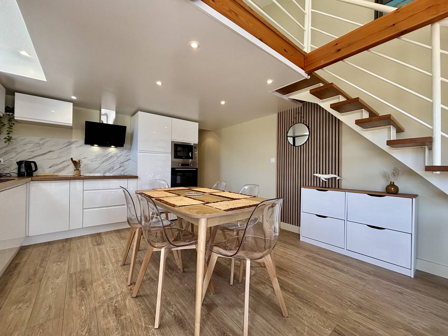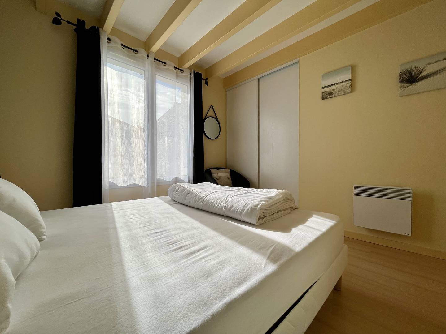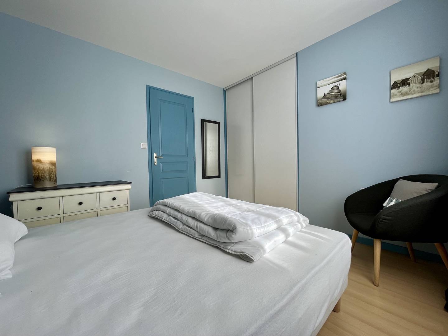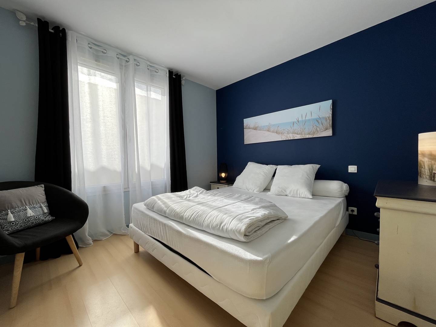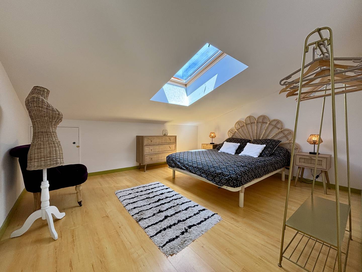 Saint Denis d'Oléron (17) - North of the island 4-room house and mezzanine - approx. 75 m² - up to 6 people Charming holiday home close to the town center and on the edge of La Boirie beach. It consists of a living room with lounge/dining room, a fitted and equipped kitchen area with dishwasher, a bedroom with a double bed (160) and dressing room, a second bedroom with a double bed (160) and dressing room, a bathroom with shower cubicle and washbasin as well as a separate toilet. Upstairs, a mezzanine with a relaxation area and storage, a third bedroom with two single beds (80x2 or 160) and a bathroom with shower, basin and WC. Outside, a beautiful terrace with a built-in barbecue and garden furniture, a garage with four bicycles, a sink, a washing machine and a freezer. Parking for several cars on the ground with secure gate. The Plus of this rental by the sea: immediate proximity to all amenities, cycle paths, beach a few meters away, parking on the ground, cleaning included.