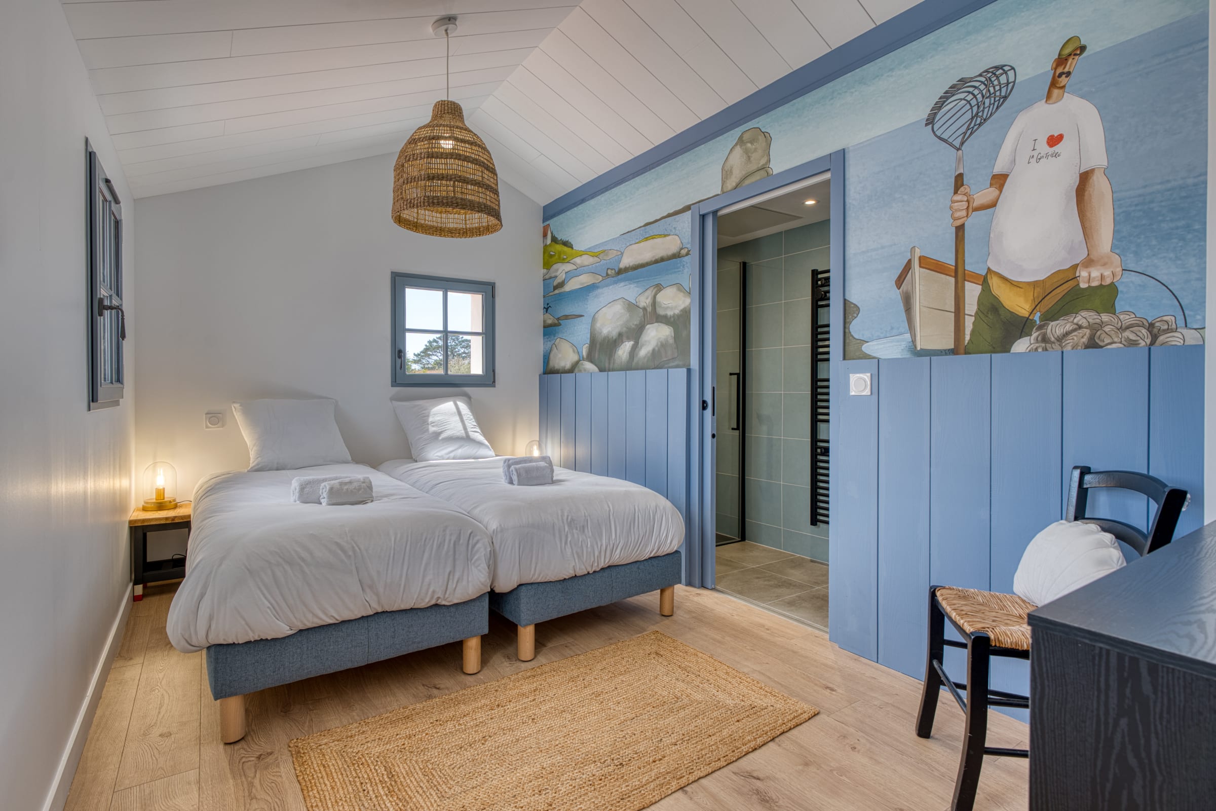 Upstairs: A charming bedroom offering two single beds (90x200 cm), also benefiting from its own private en-suite shower room.