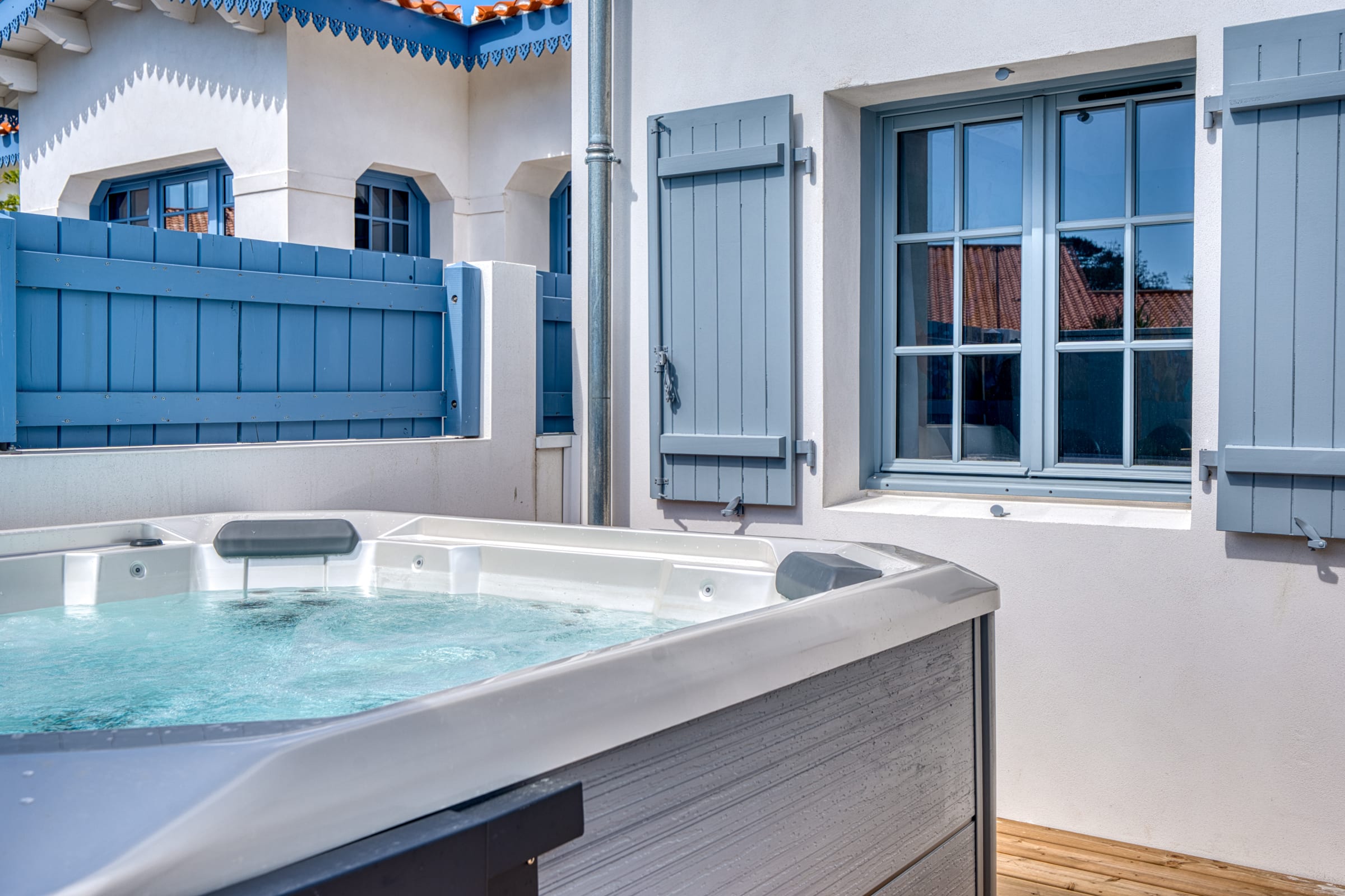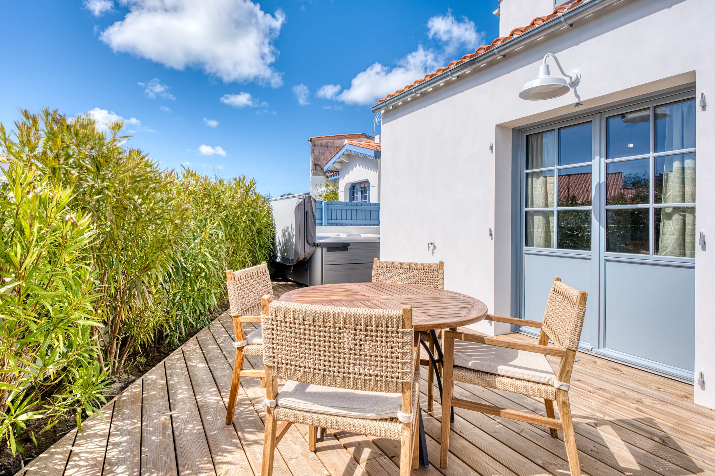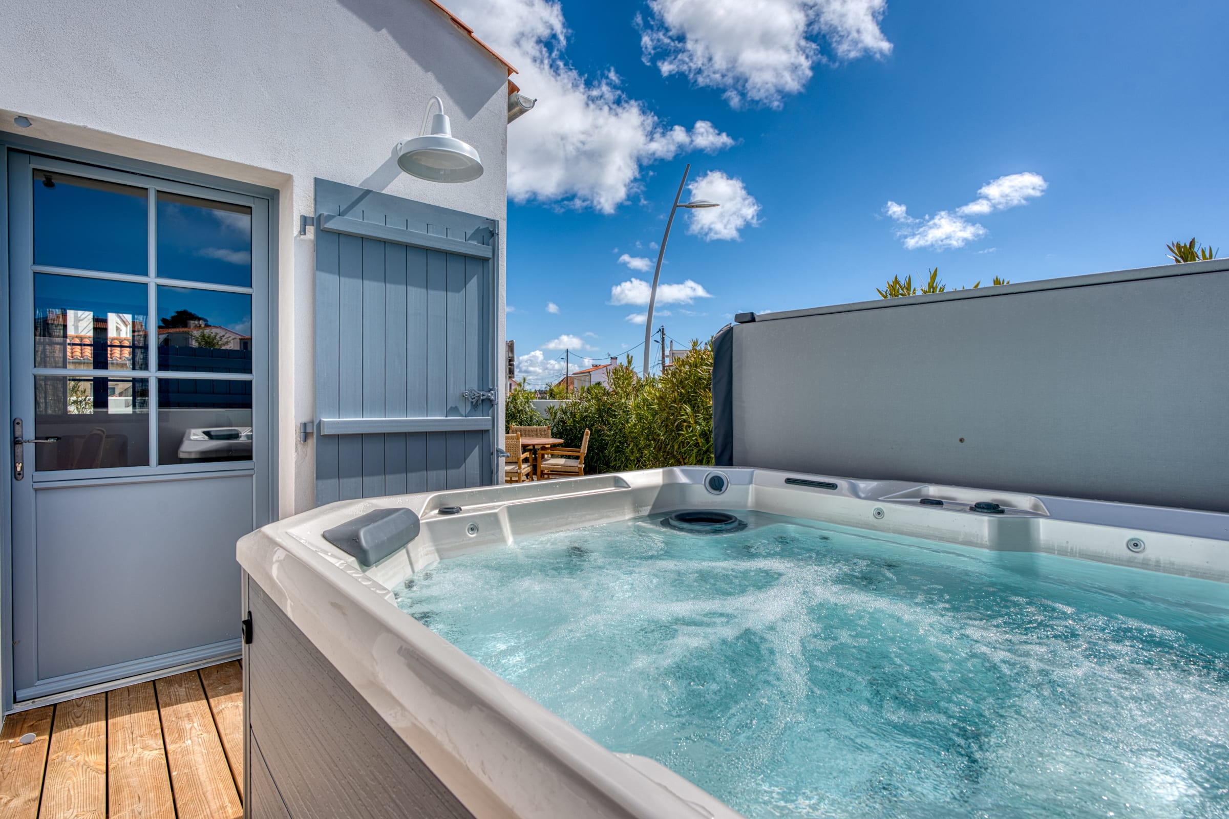 The true gem of this small townhouse is its intimate and beautifully landscaped outdoor space. You will discover a dining area to enjoy your outdoor lunches and dinners, as well as a relaxation area equipped with deckchairs and a parasol. But the absolute privilege remains its private spa (hot tub): being able to slip into it at the end of the day to relax your muscles after a long walk along the harbor is an unforgettable experience!