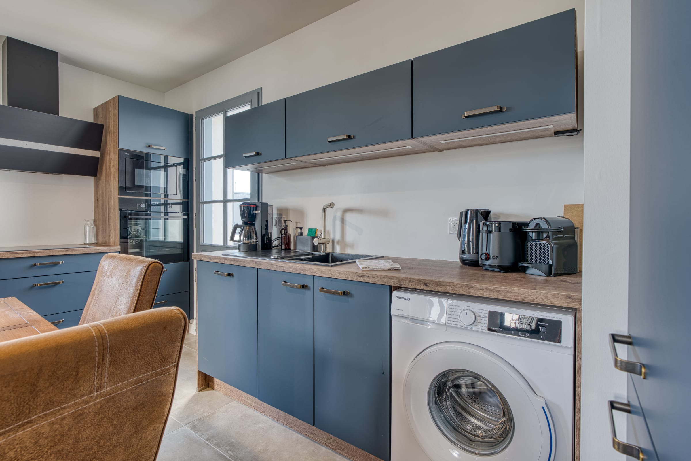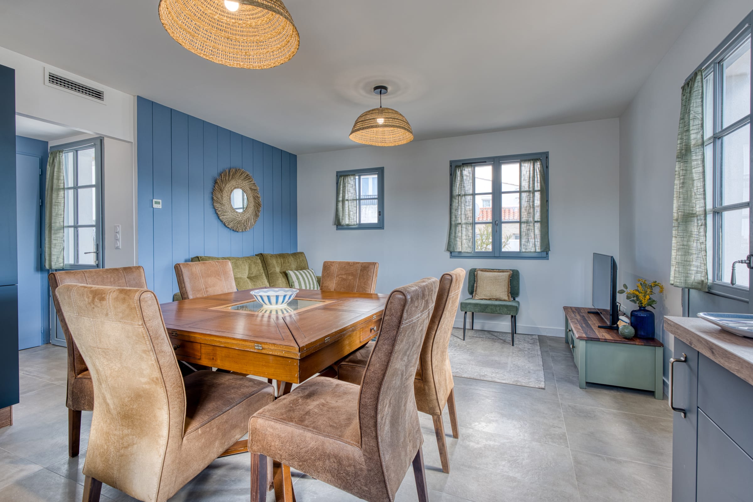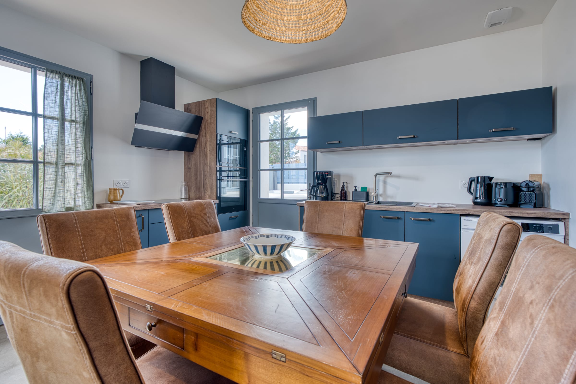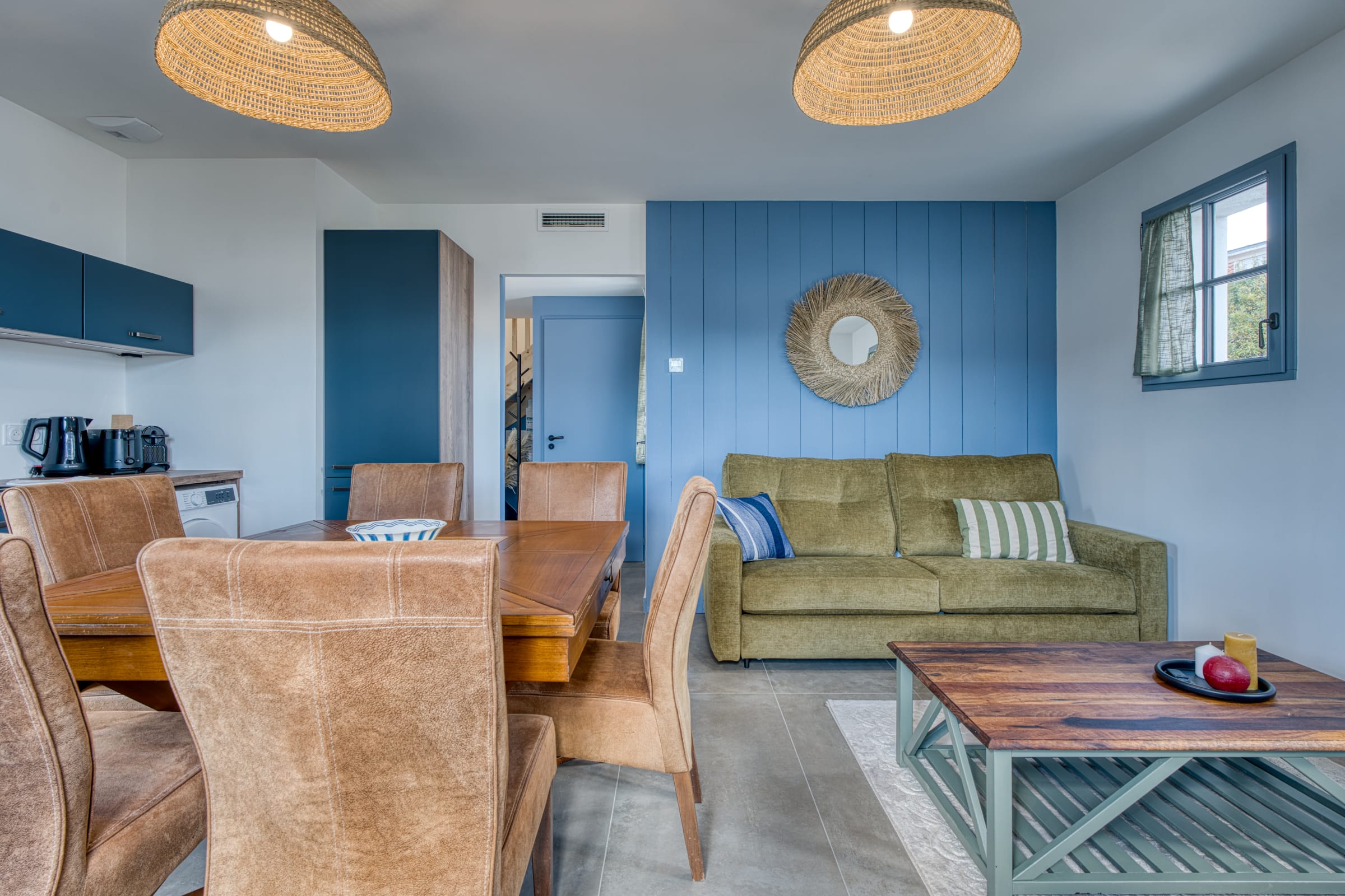 Right from the doorstep, the ground floor reveals a warm and functional living area. The living room, equipped with a smart TV and Wi-Fi connection, offers a comfortable relaxation space. It opens onto a lovely, fully equipped kitchen designed to make your stay easier: you will find everything you need for your breakfasts (Nespresso coffee machine, kettle, toaster), a dishwasher as well as a washing machine seamlessly integrated. To top it all off, raclette and fondue sets are at your disposal for gourmet and convivial evenings after a day at the beach!