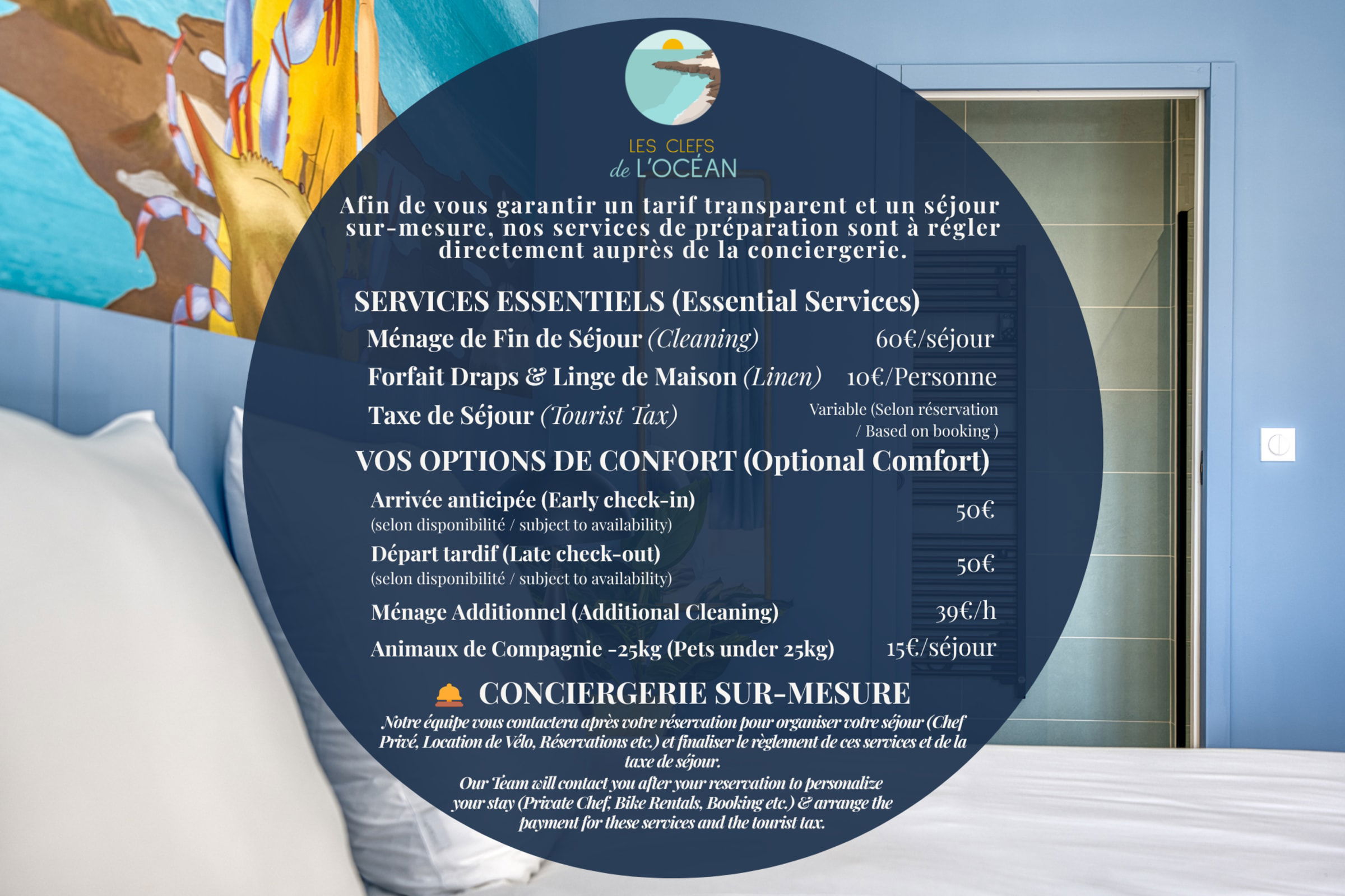 To guarantee a hotel-quality standard and absolute transparency, preparation fees are not included in the online reservation. Payment is made directly to our concierge service "Les Clefs de l'Océan" after your stay is confirmed.