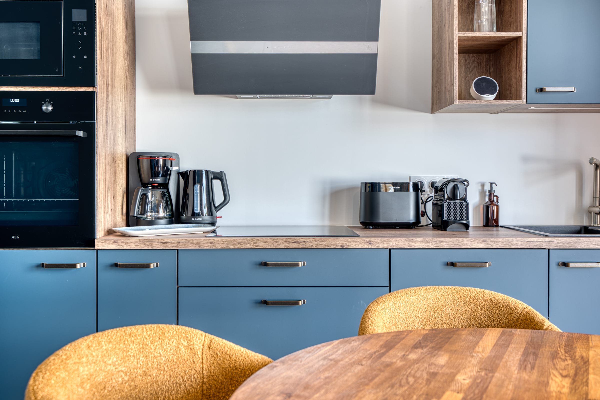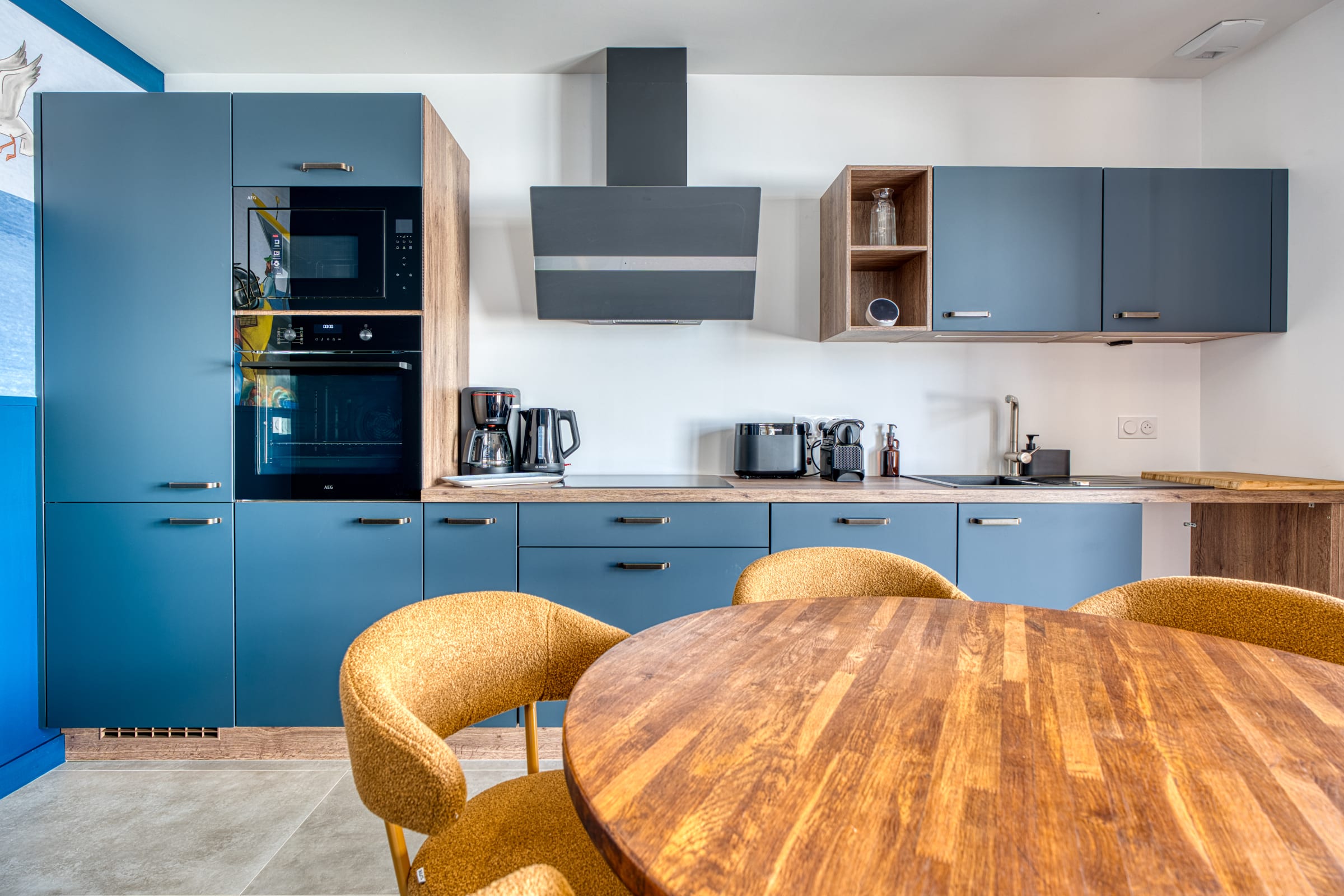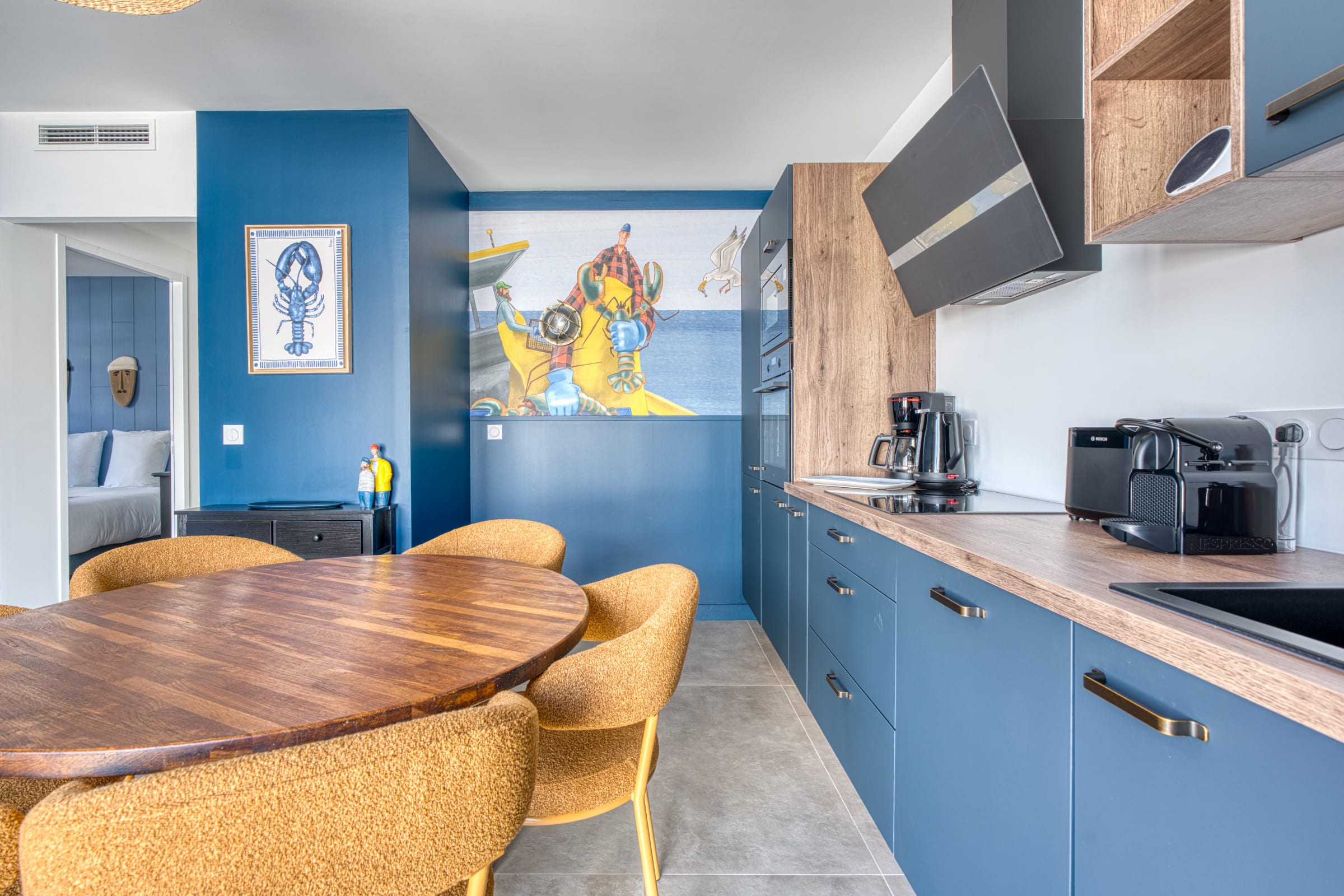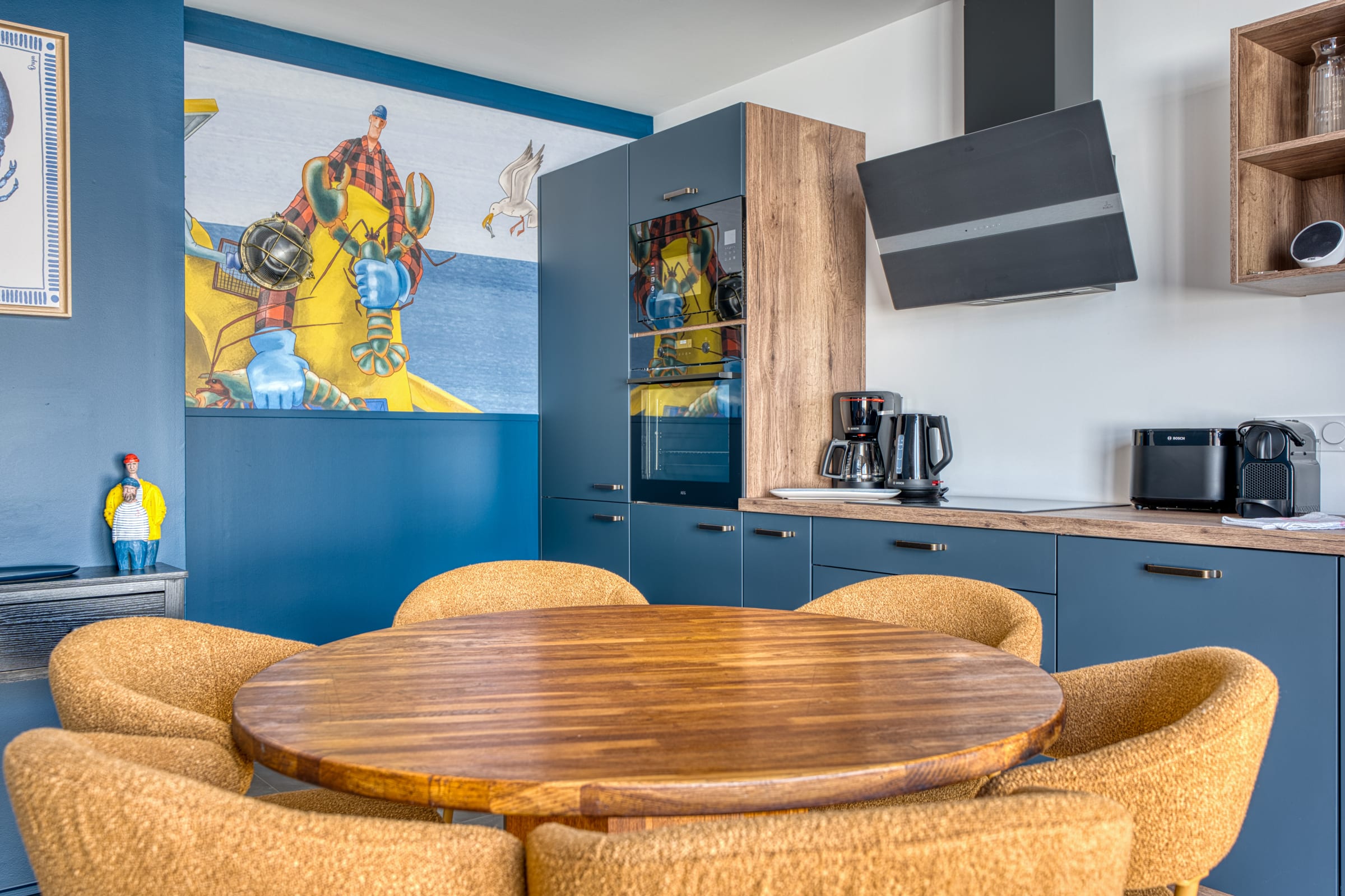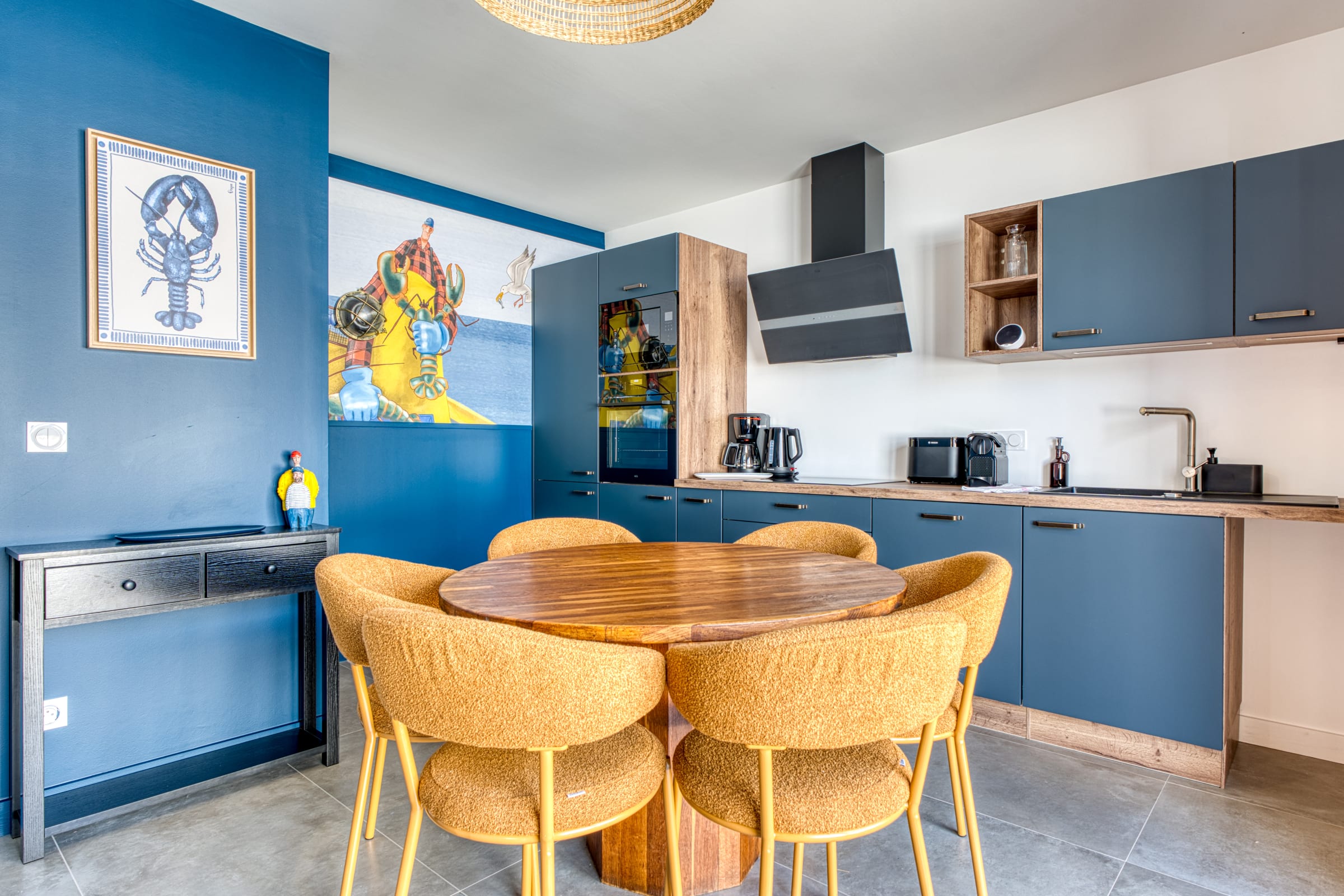 Right from the doorstep, the house reveals a living area designed to optimize every moment of your stay. The living room, equipped with a smart TV, Wi-Fi, and a comfortable sofa, wraps you in a soft and relaxing atmosphere. It perfectly connects to a lovely, fully equipped, and very cleverly designed kitchen. Nothing is missing for your everyday comfort: Nespresso coffee machine, kettle, toaster, but also a dishwasher and a washing machine discreetly integrated. The friendly little extra? Raclette and fondue sets are at your disposal to share delicious gourmet moments after a long walk on the coast.