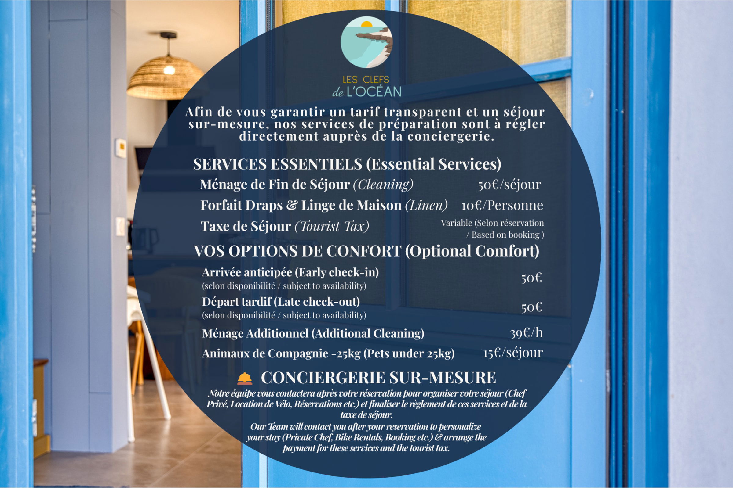 To guarantee a hotel-quality standard and absolute transparency, preparation fees are not included in the online reservation. Payment is made directly to our concierge service "Les Clefs de l'Océan" after your stay is confirmed.