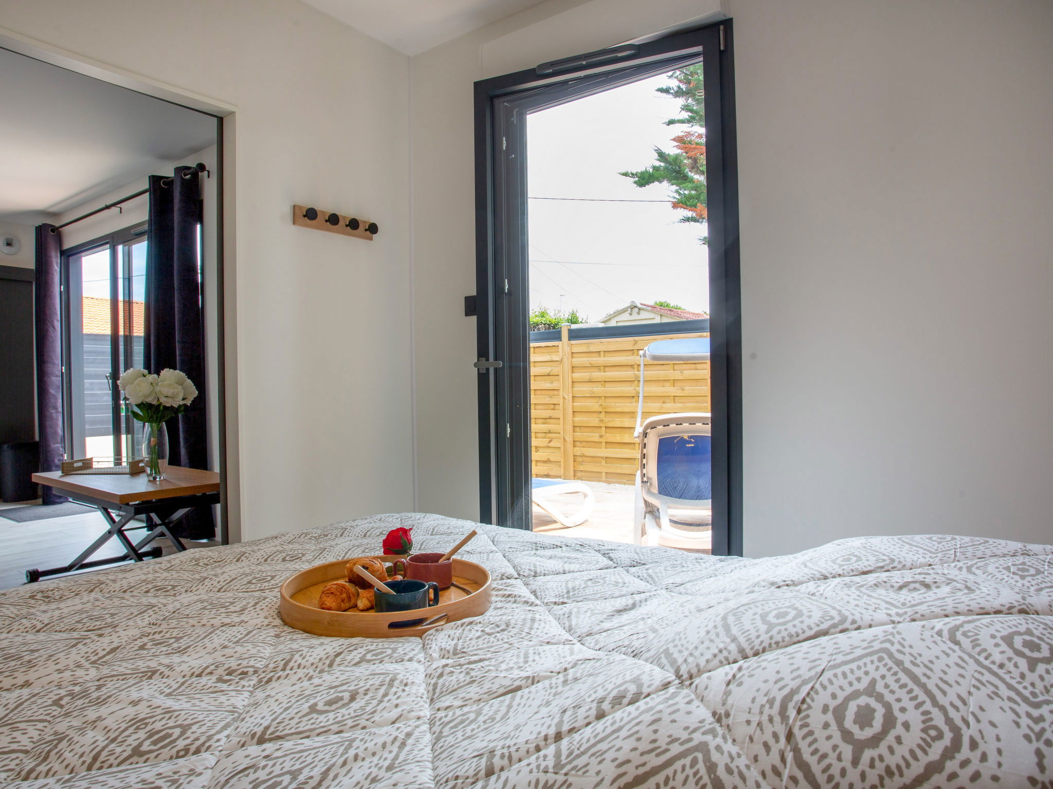 Timber house "La Naty", built in 2024. Excellent location: right in the centre but still quiet, 550 m from the sea, 550 m from the beach, south-east facing position. Private: well-kept garden 21 m2 (fenced), public parking on the road. Supermarket 2.4 km, restaurant 200 m, bakery 400 m, bus stop "Bourg de Tharon" 2 km, railway station "Gare de Pornic" 12 km, sandy beach "Grande Plage de Tharon" 550 m, thermal baths "Thalasso & Spa Pornic" 10 km. Sports harbour 9 km, golf course (18 hole) 8 km, minigolf 2 km. Nearby attractions: Biscuiterie galettes Saint Michel 3 km, Faïencerie de Pornic 7 km, Pornic Aventure 8 km, Légendia Parc 22 km, Les Machines de l'Ile de Nantes 55 km, Ile de Noirmoutier 66 km. Well-known lakes can easily be reached: Lac de Saint Viaud 21 km.