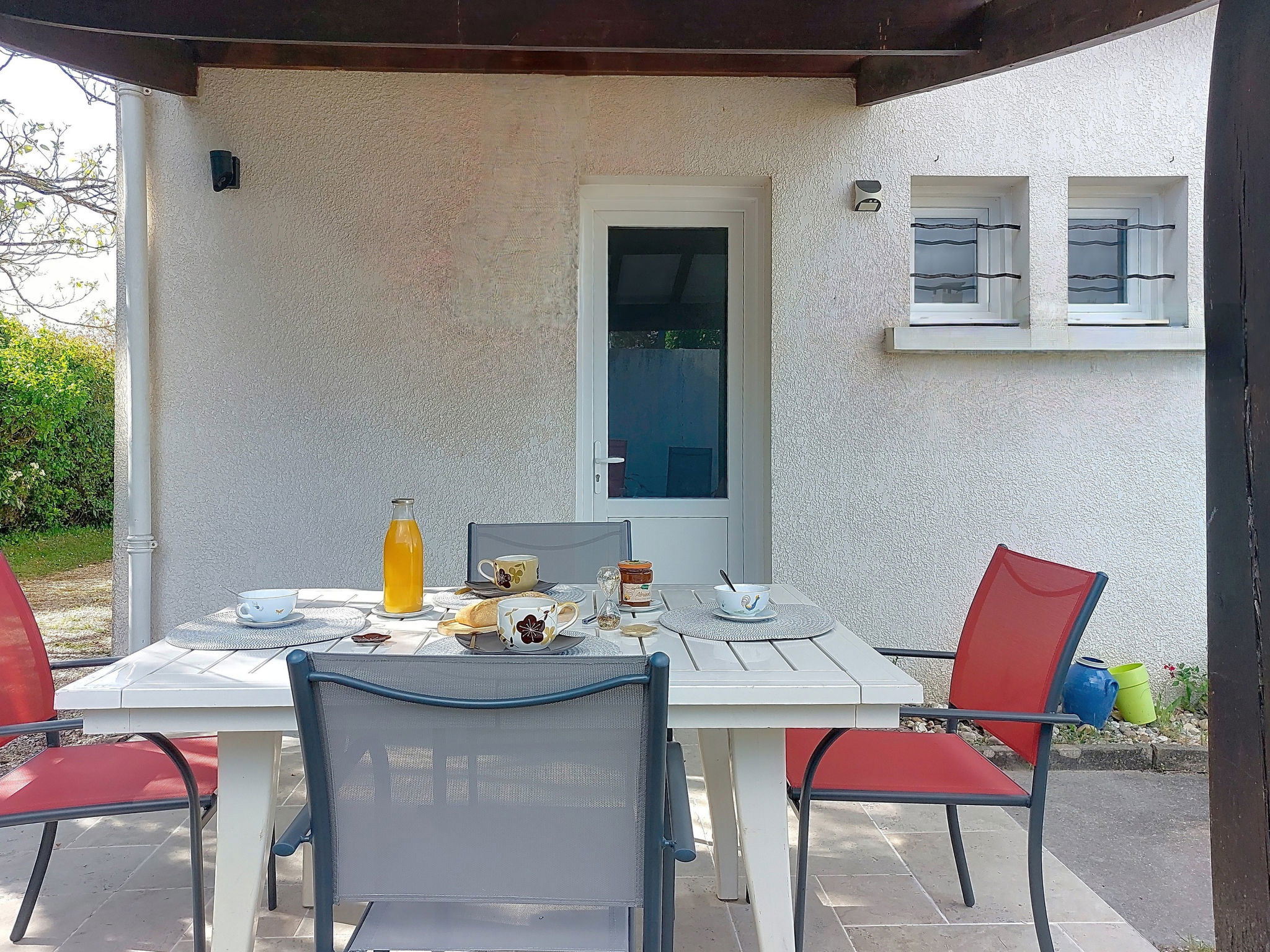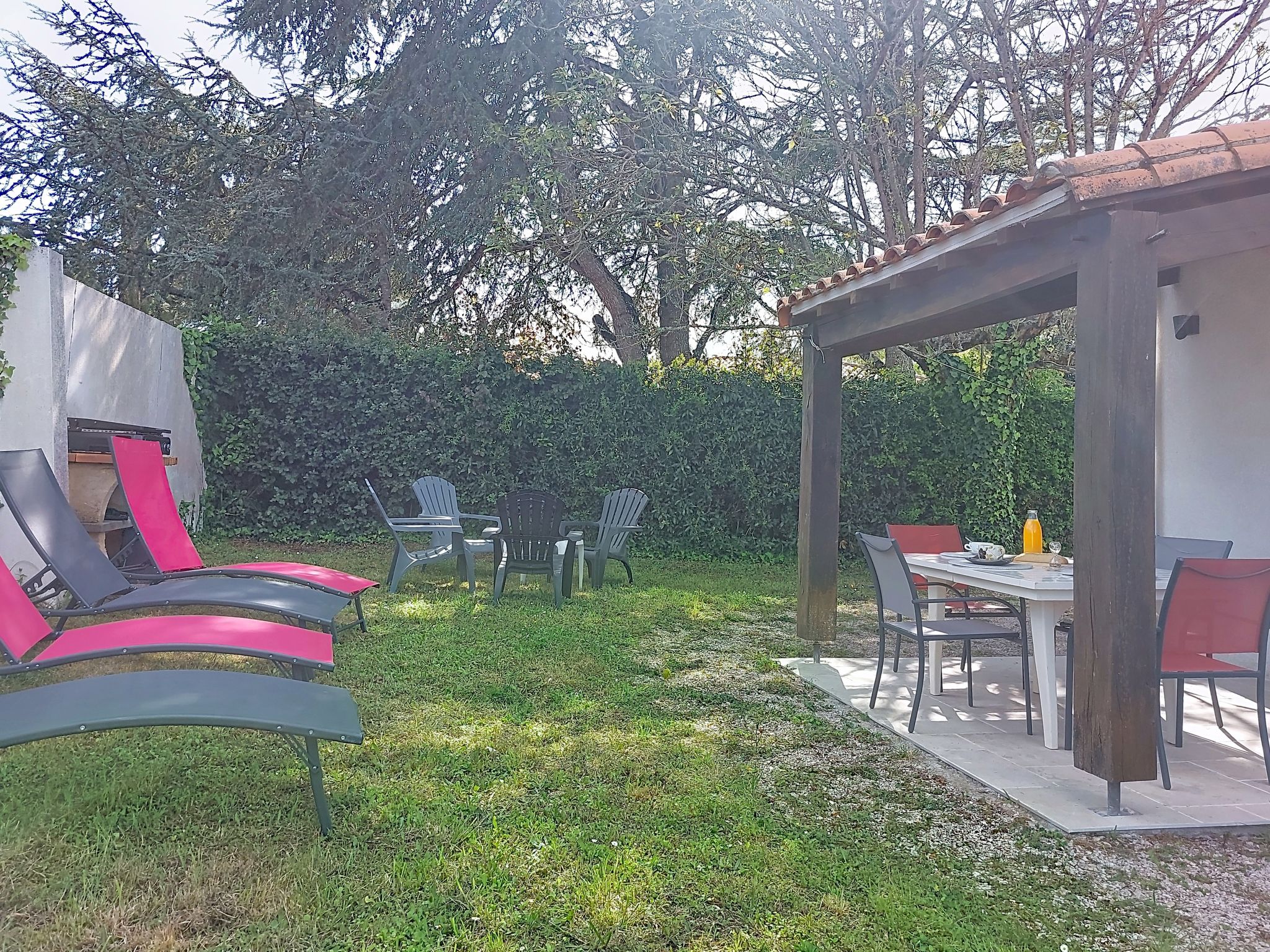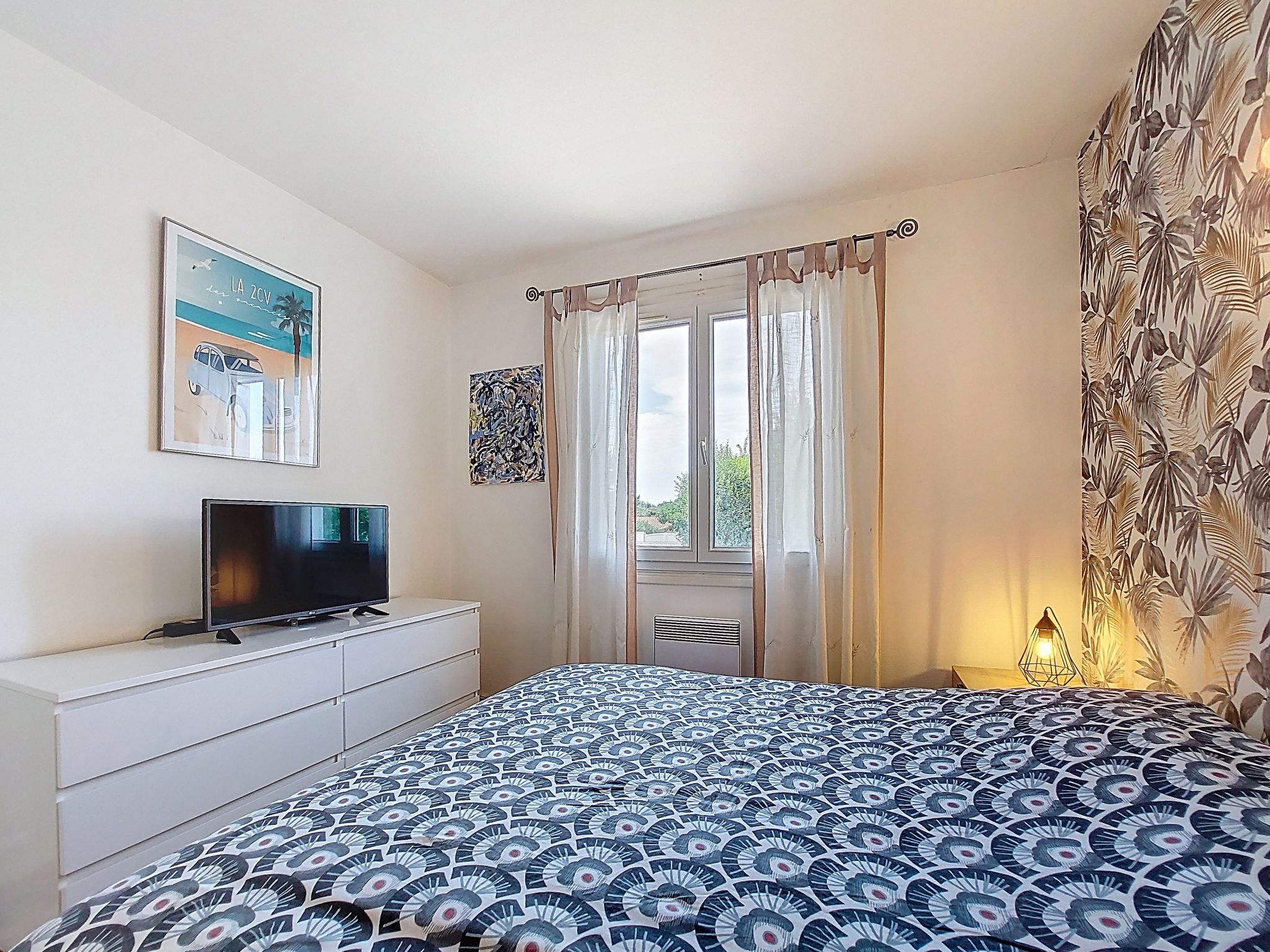 3-room house 60 m2, east facing position. Bright, cosy furnishings: living room with TV (flat screen). Exit to the garden, to the terrace. 1 room with 1 french bed (1 x 160 cm, length 190 cm), TV (flat screen). 1 room with 1 bed (90 cm, length 190 cm), 1 x 2 bunk beds (90 cm, length 190 cm). Open kitchen (dishwasher, 3 induction hot plates, toaster, kettle, freezer, electric coffee machine, combination microwave). Shower/WC. Air-conditioning. Terrace 8 m2, garden 650 m2. Terrace furniture. Facilities: washing machine. Internet (WiFi, free). Parking (2 cars). Please note: non-smoking house. Maximum 1 small pet/ dog allowed. Smoke alarm. Offer by a private individual according to Art. 155, IV of CGI.