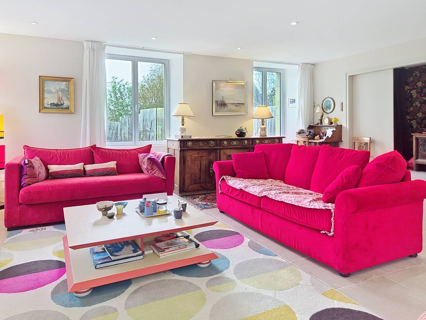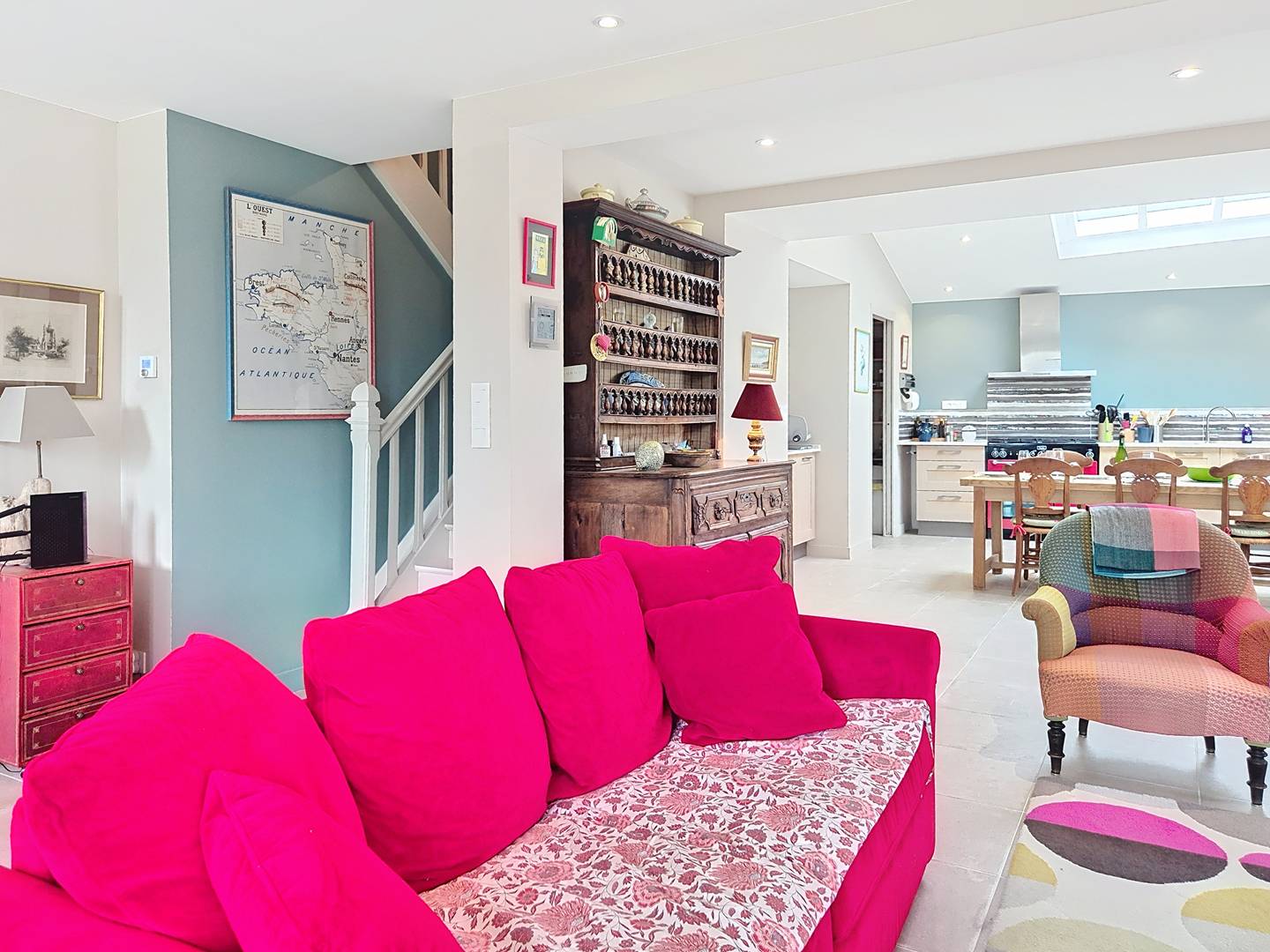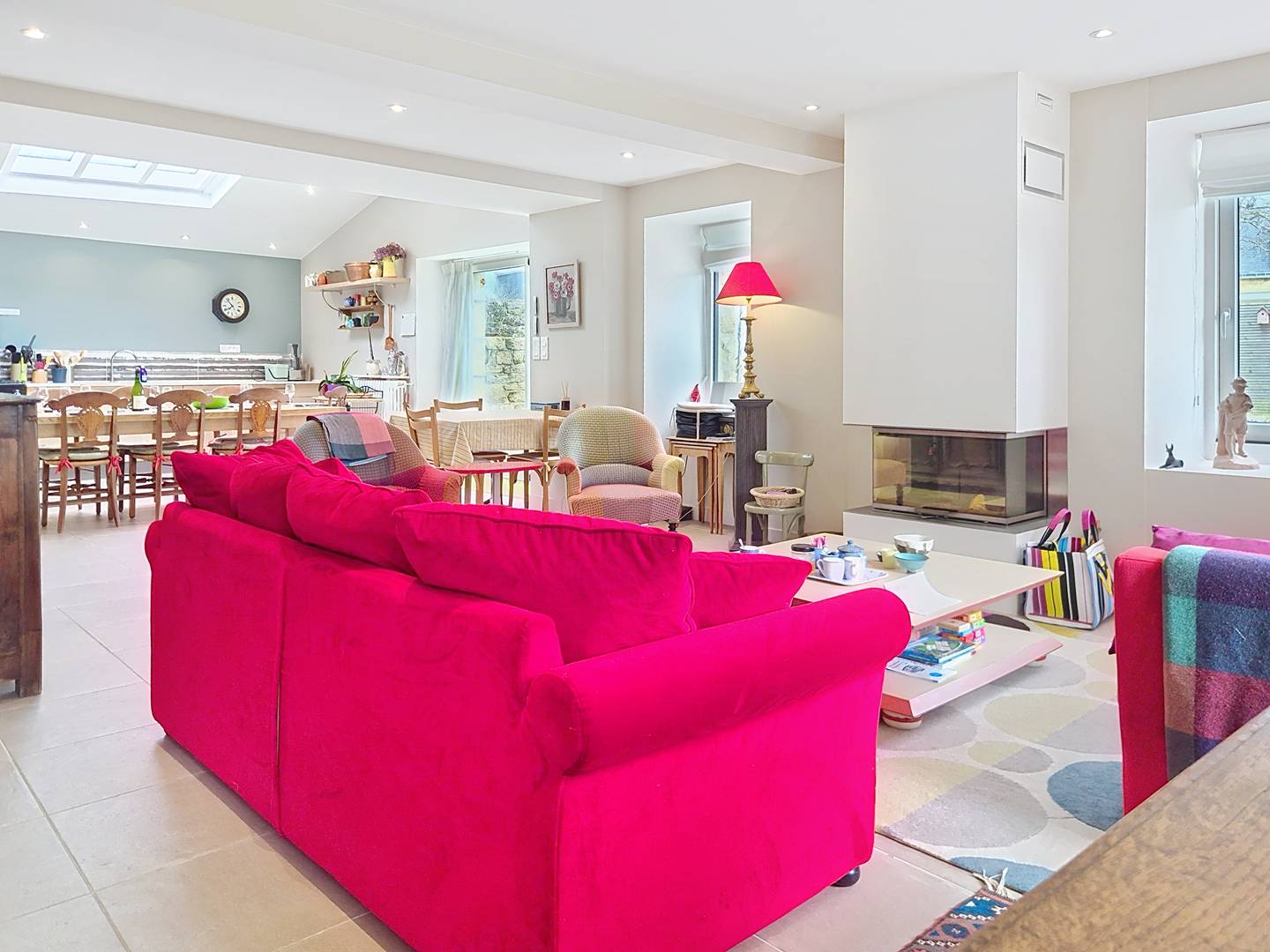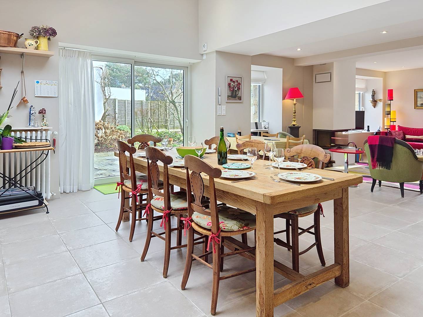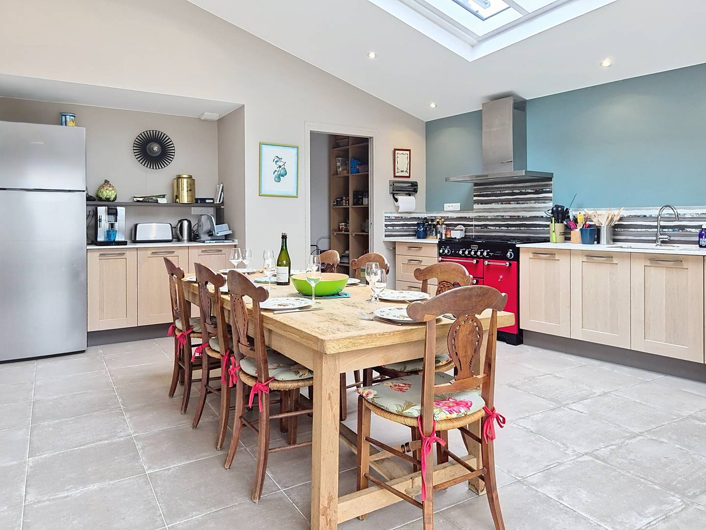 - Spacious, bright open-plan kitchen (glass partition), fully equipped (range cooker with 6 gas burners and 3 ovens, microwave, dishwasher, large fridge-freezer, coffee maker, kettle, toaster)