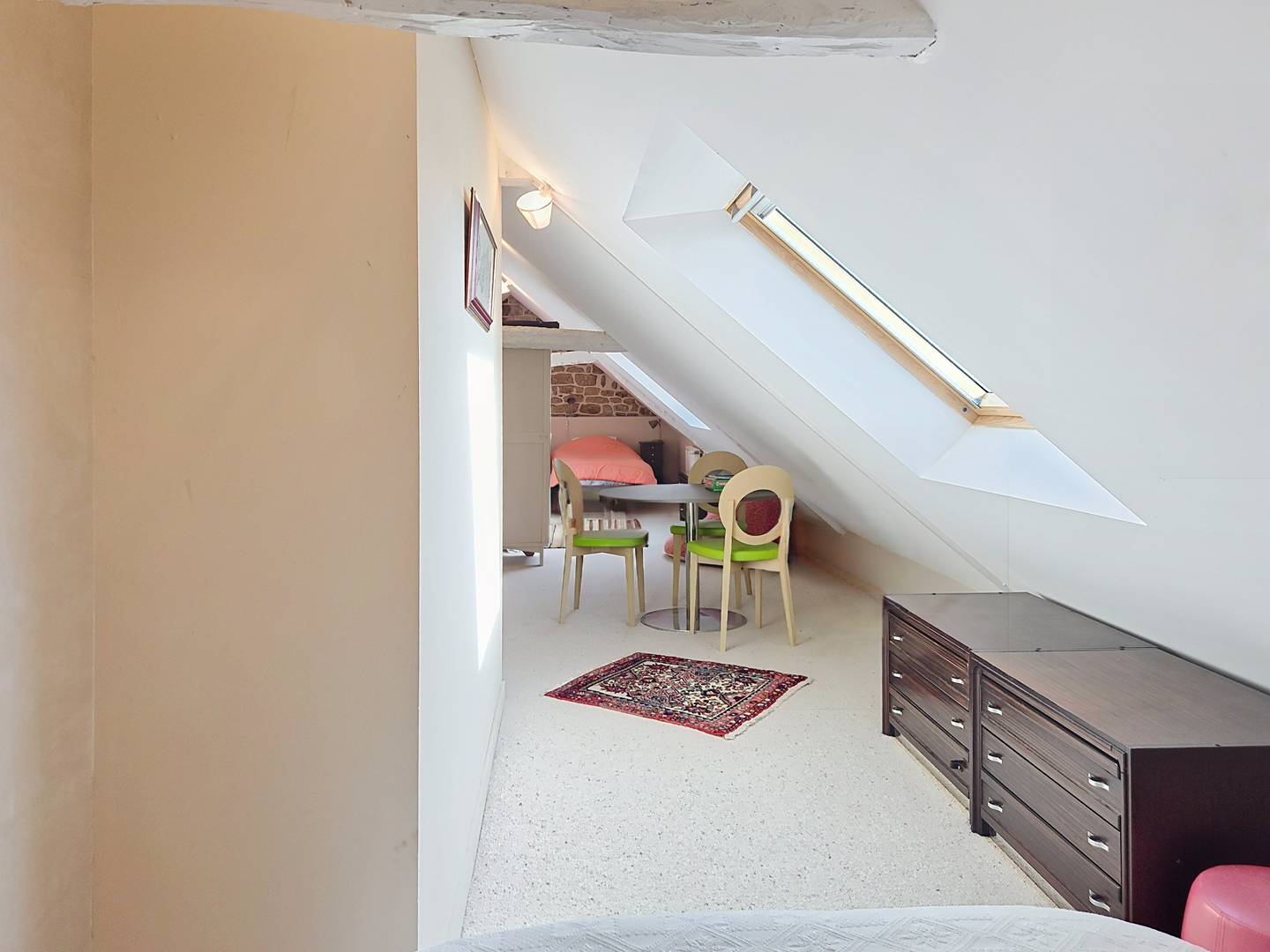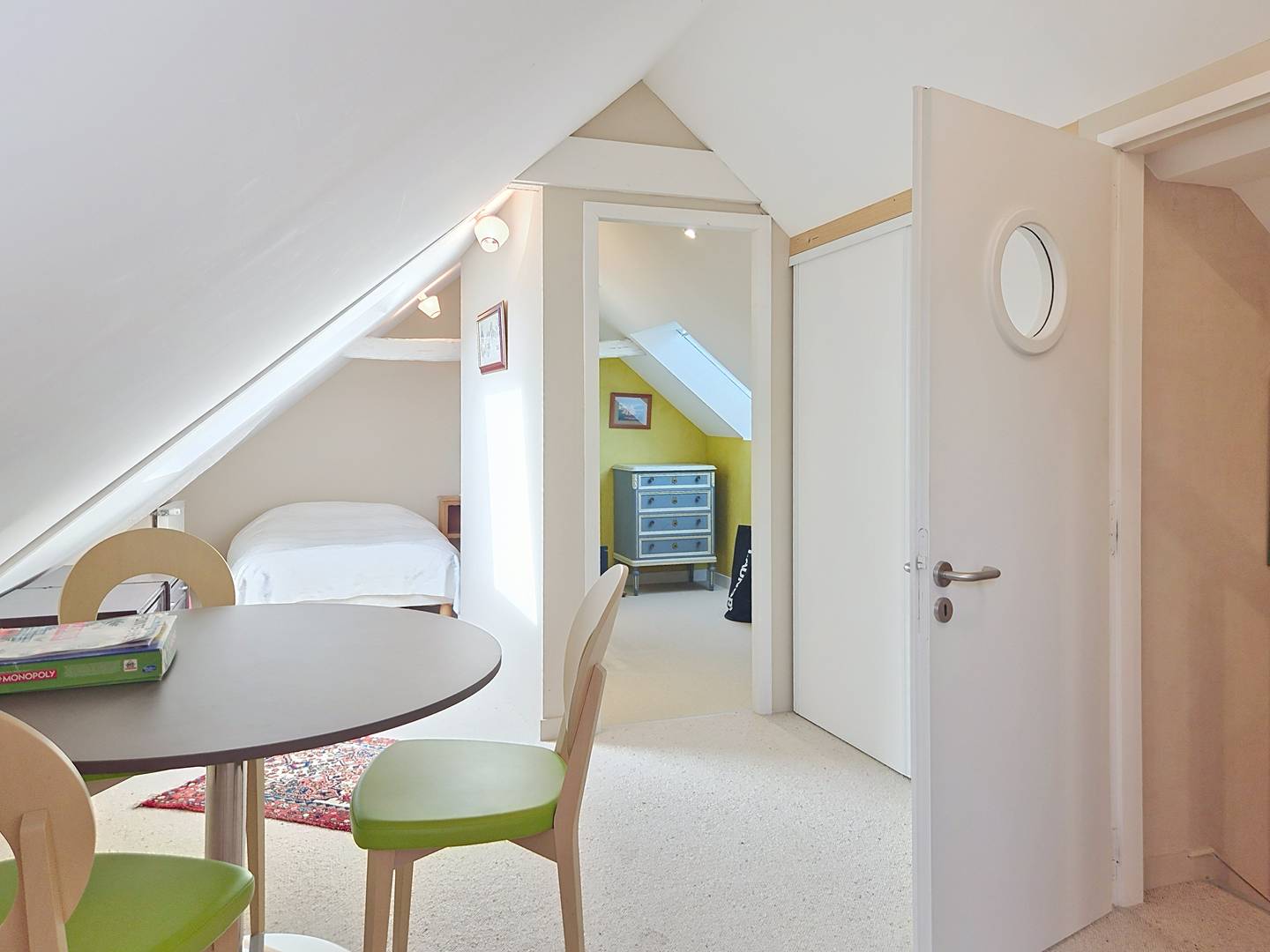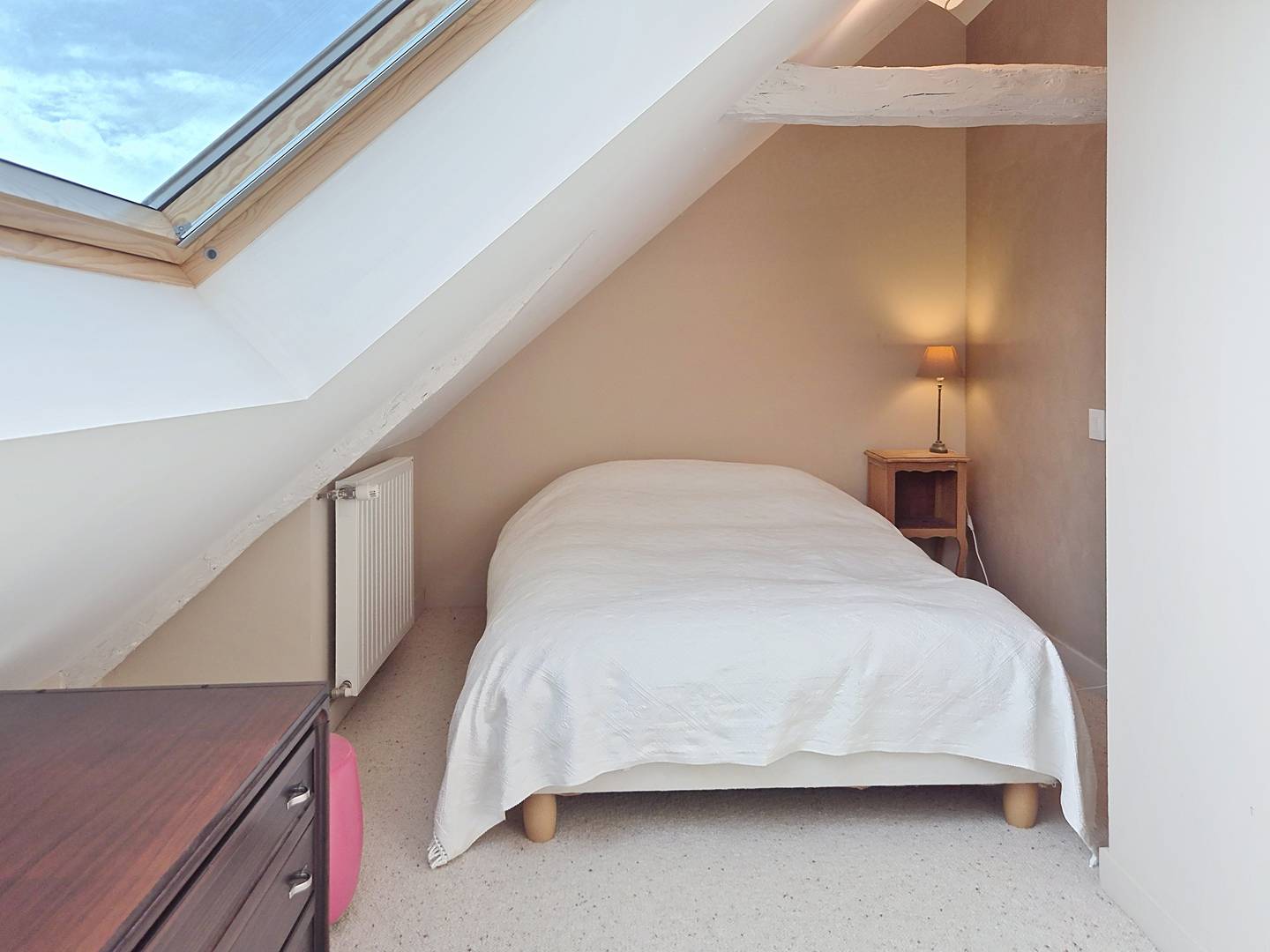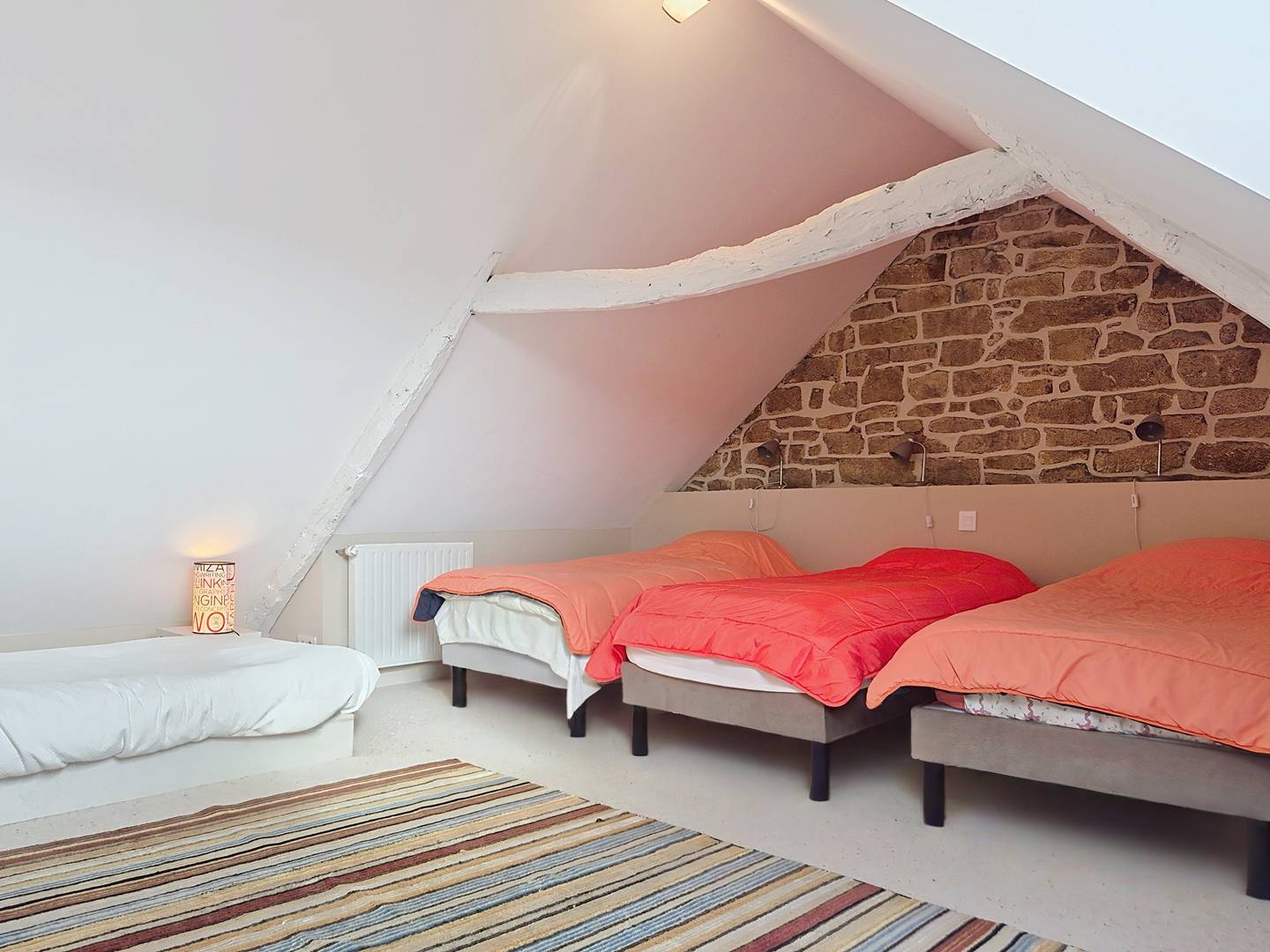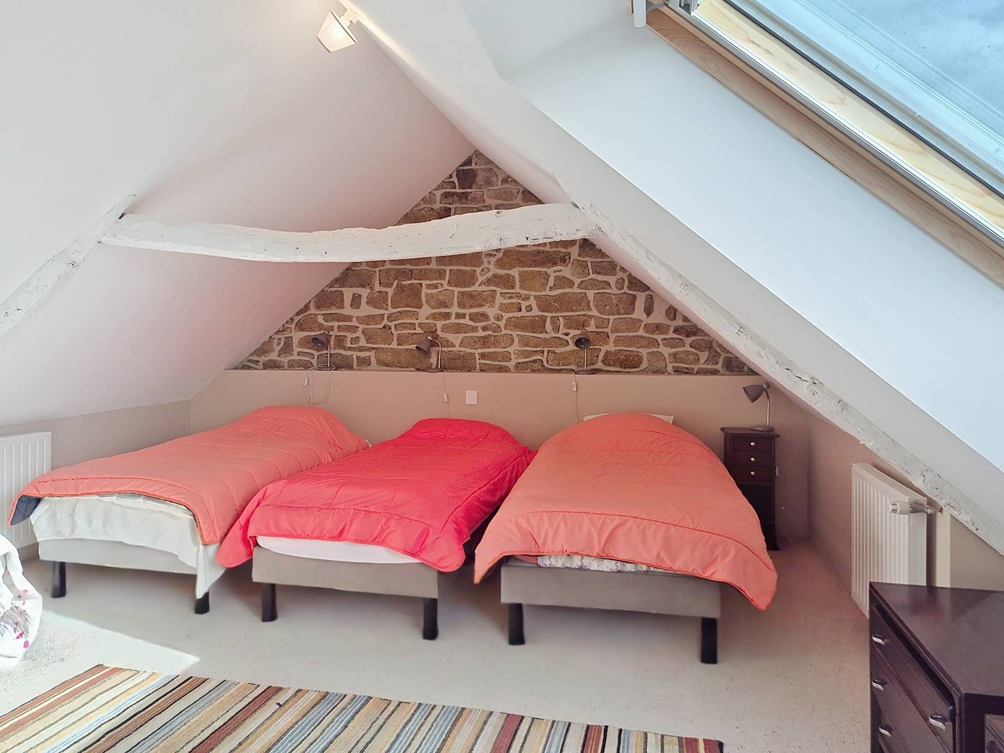 - Large attic bedroom with 4 single beds (90 cm, duvets) and a double bed (140 cm, duvet)