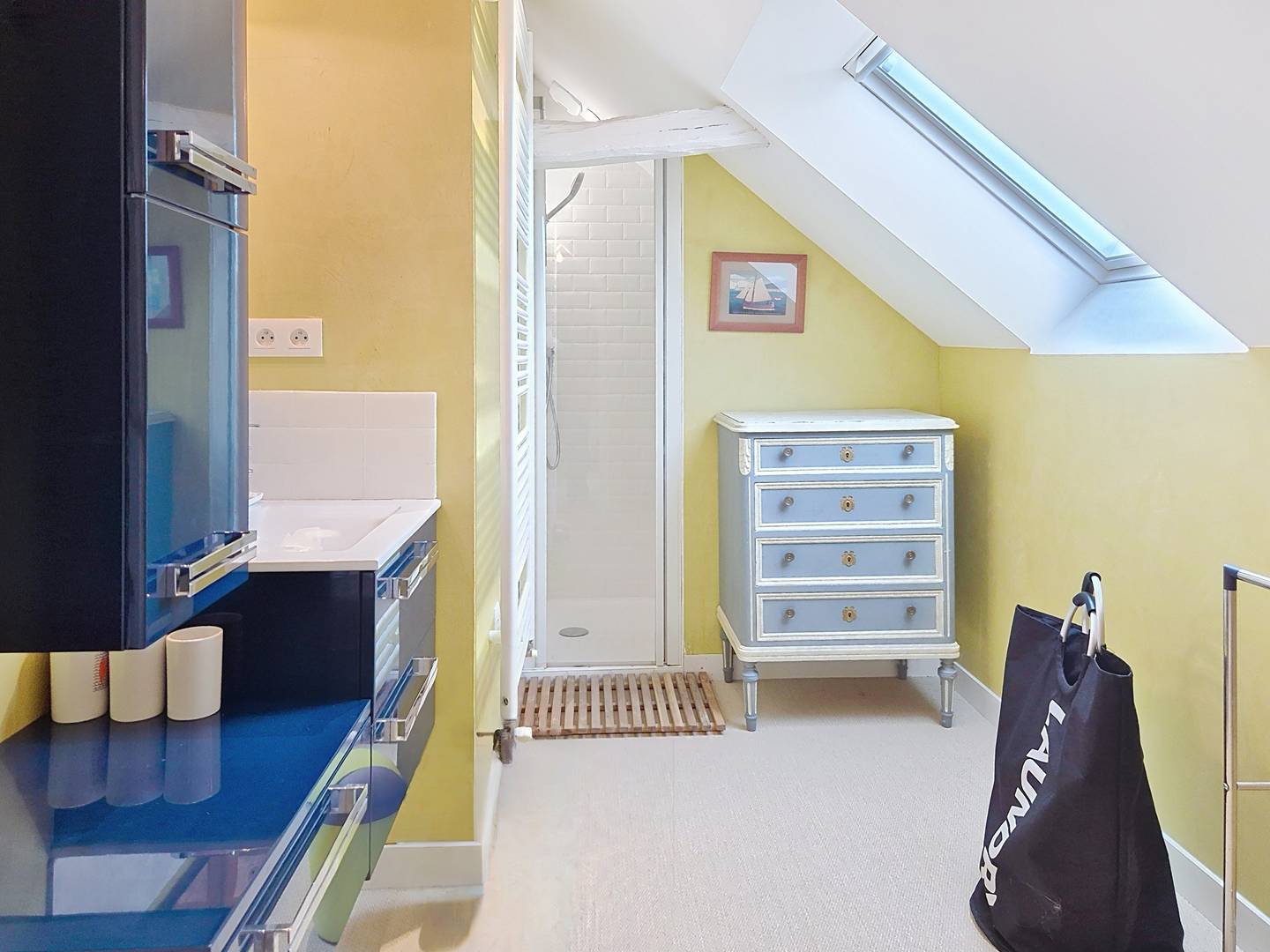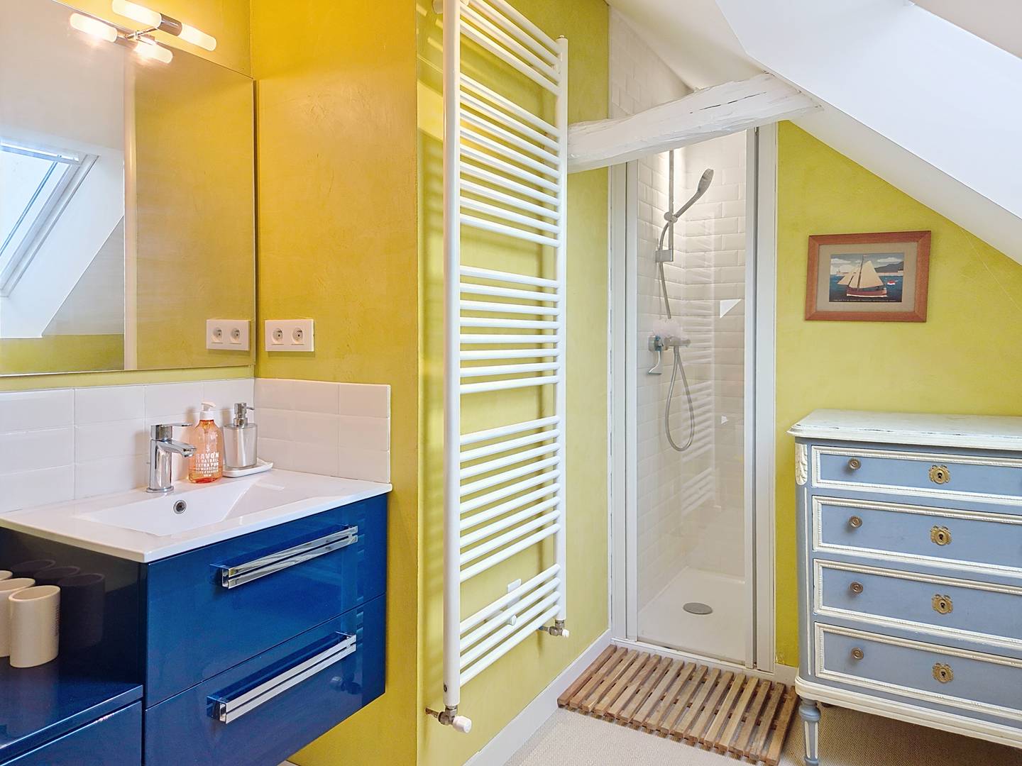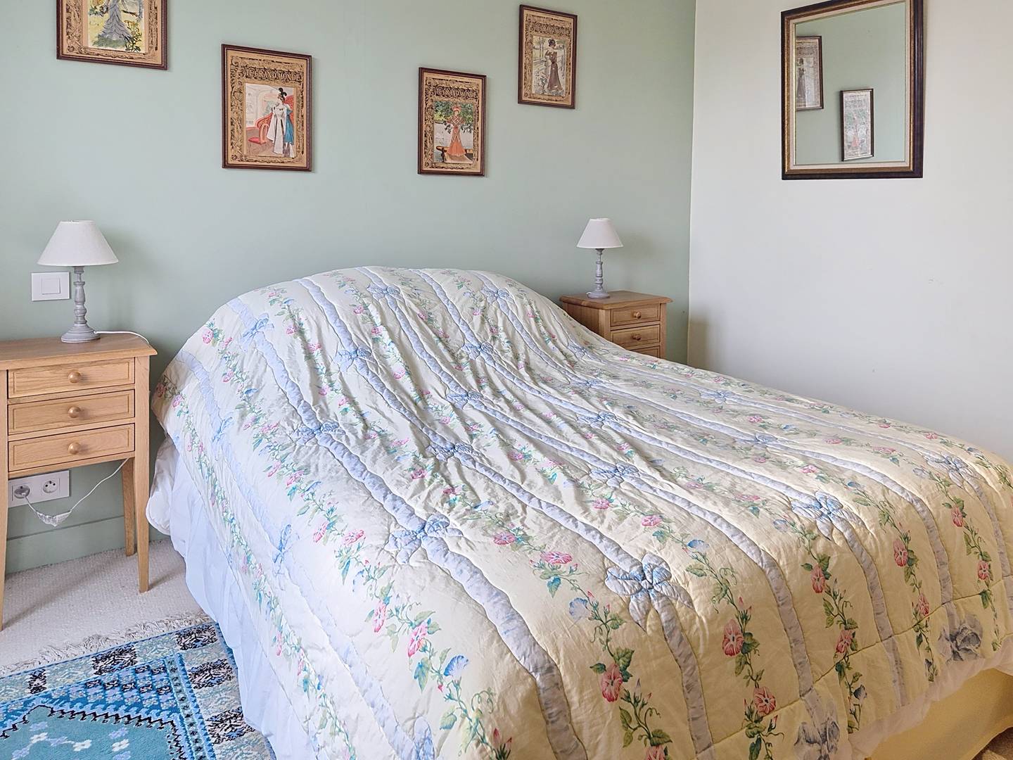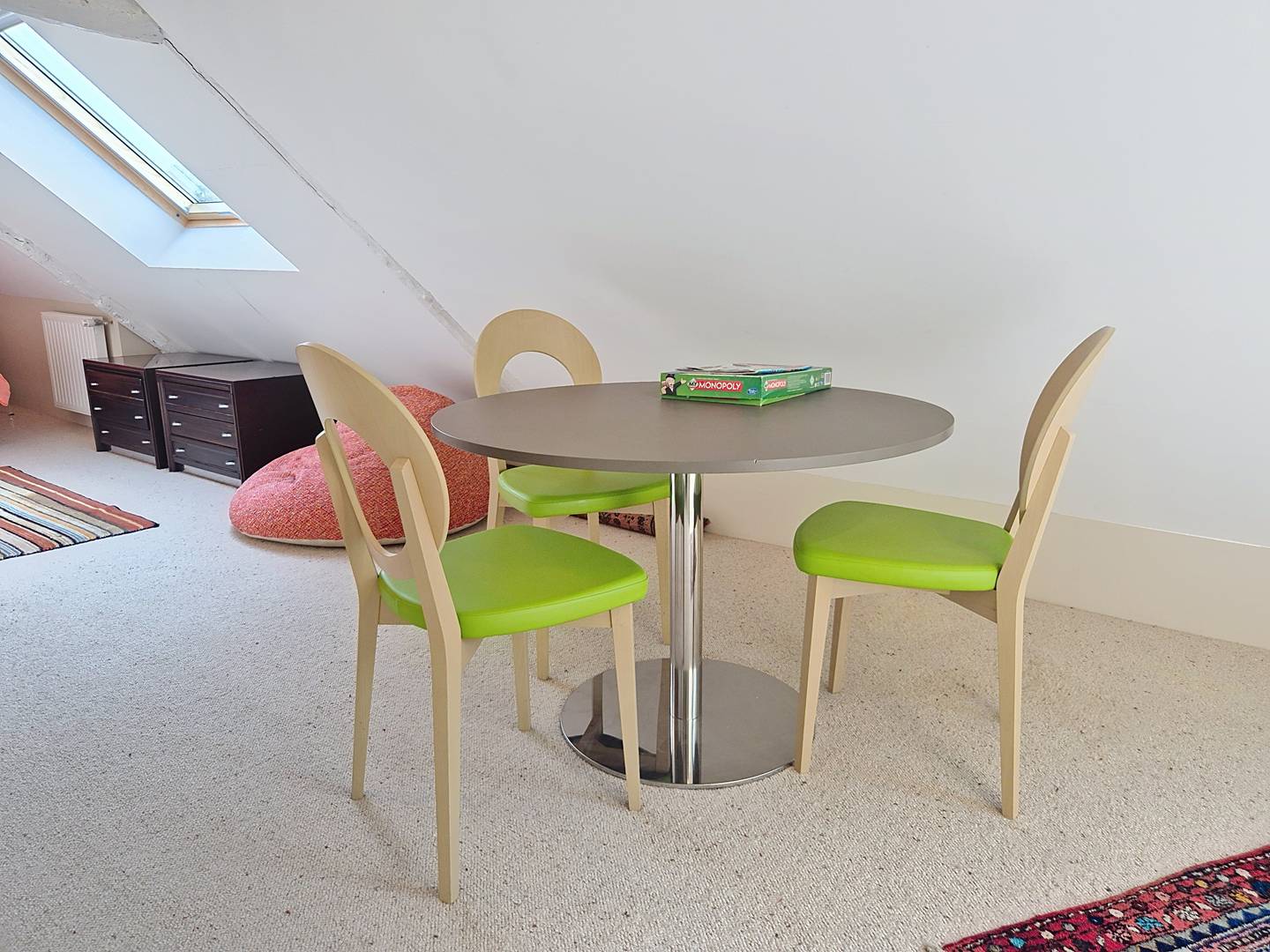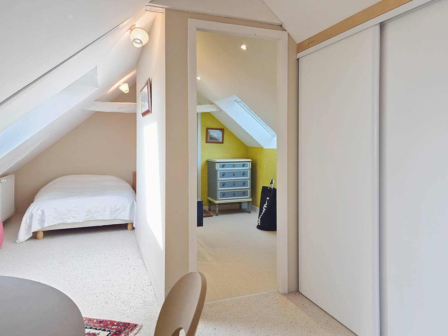 - Large attic bedroom with 4 single beds (90 cm, duvets) and a double bed (140 cm, duvet)