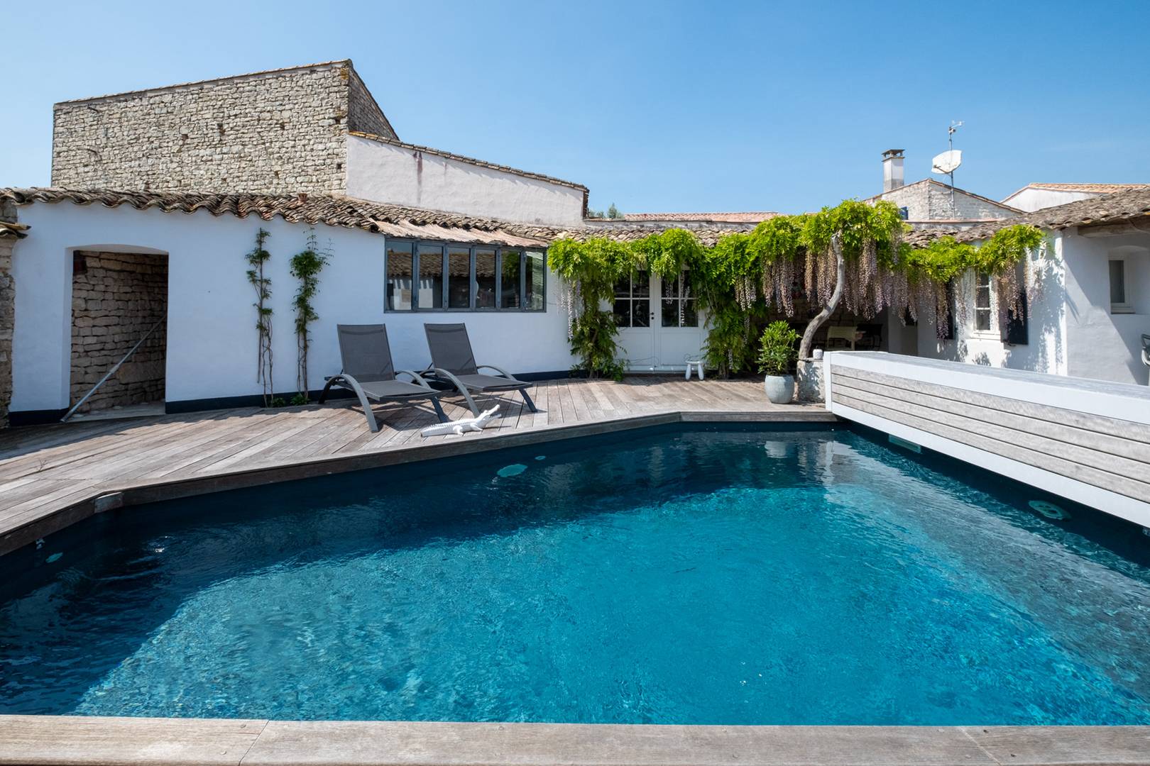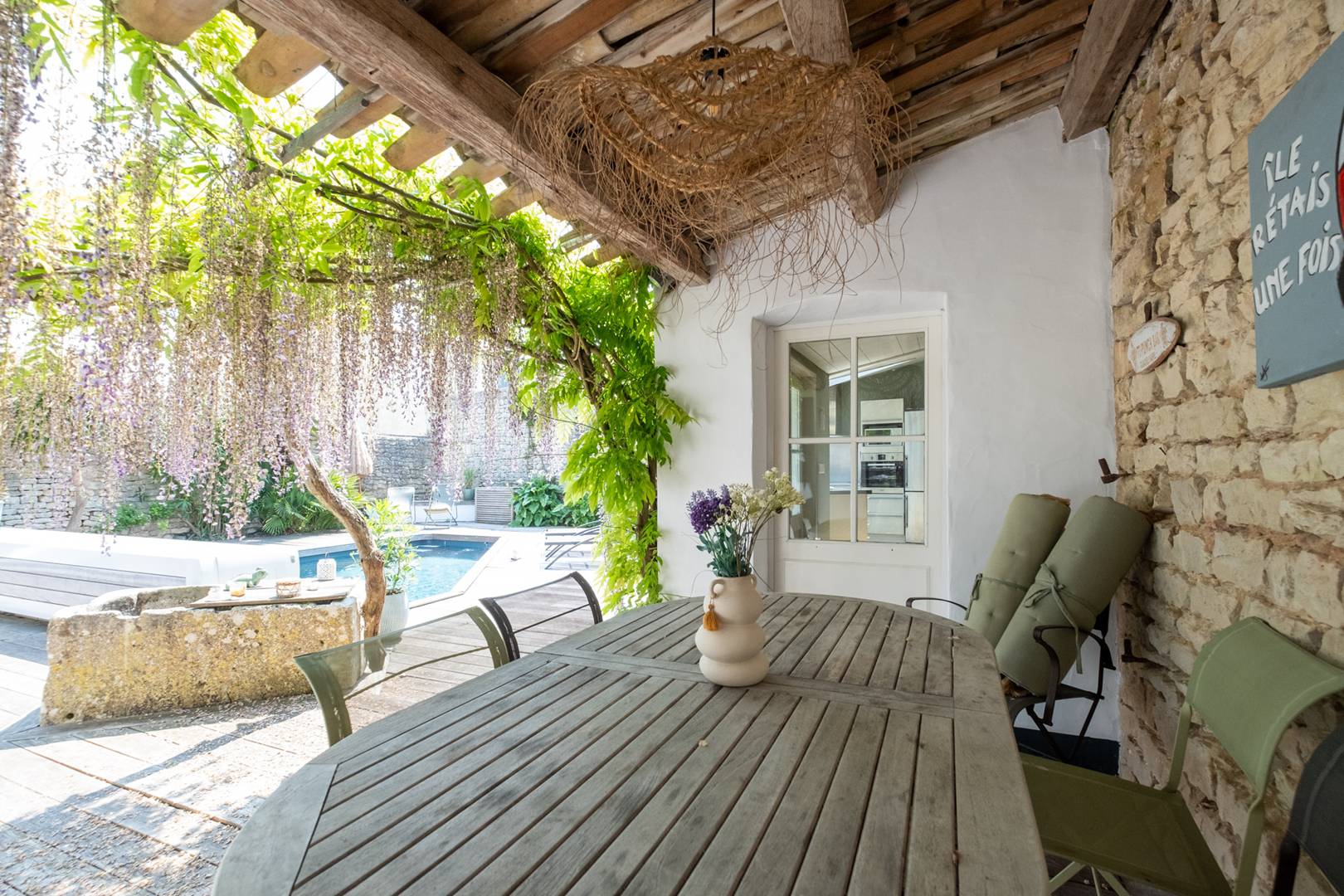 Located in an alley, from the street, you would never suspect the existence of this charming Rhetais house. Full of character and authenticity, the Villa des Grives is a family house of 190m2 organized around a heated swimming pool in a main house and an annex allowing several families to live together in optimal comfort.