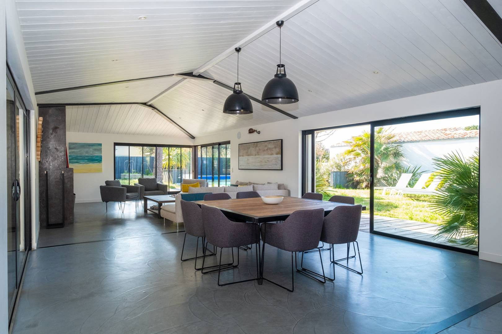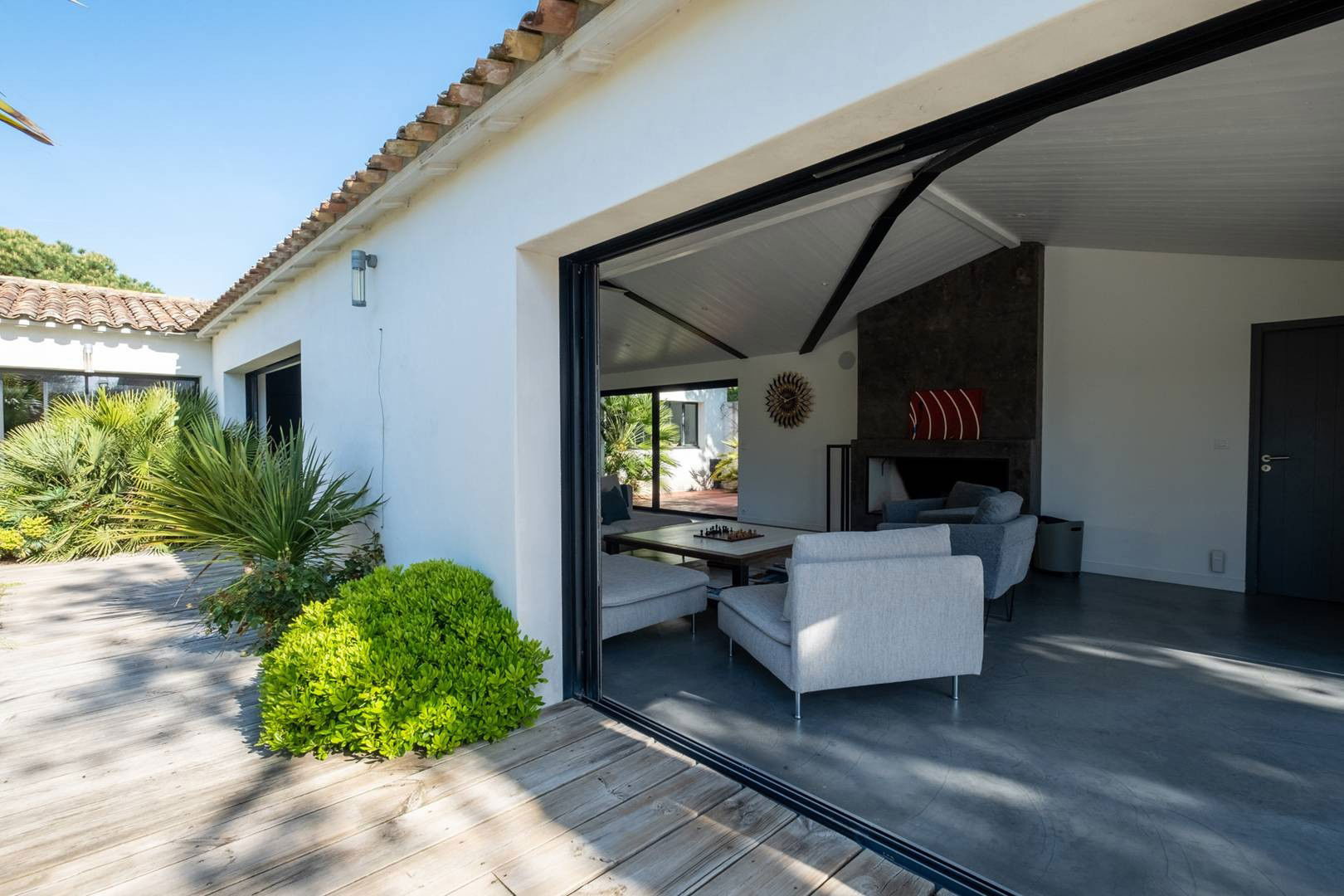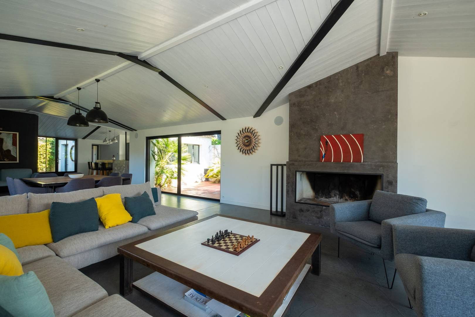 - Large living room with fireplace and bay windows overlooking the garden and the swimming pool
