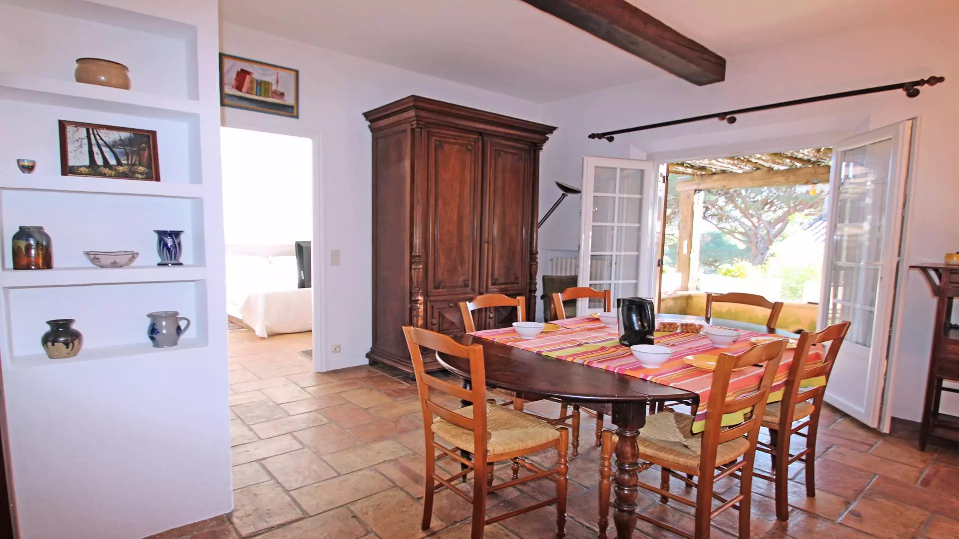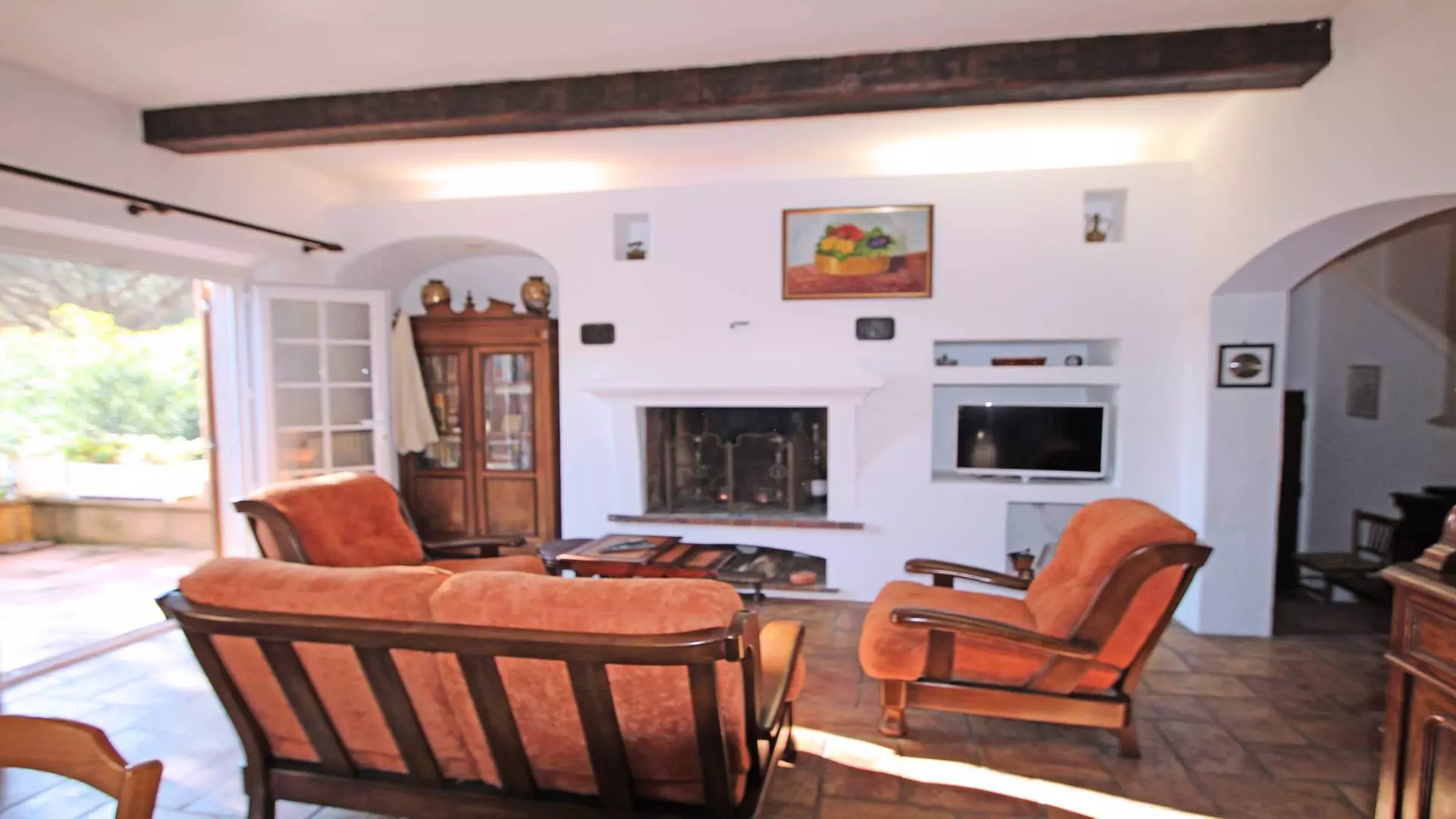 - Air-conditioned living/dining room with 2-seater sofa, 2 armchairs, large flat-screen TV, fireplace, dining table for 6 people and openings onto the terrace