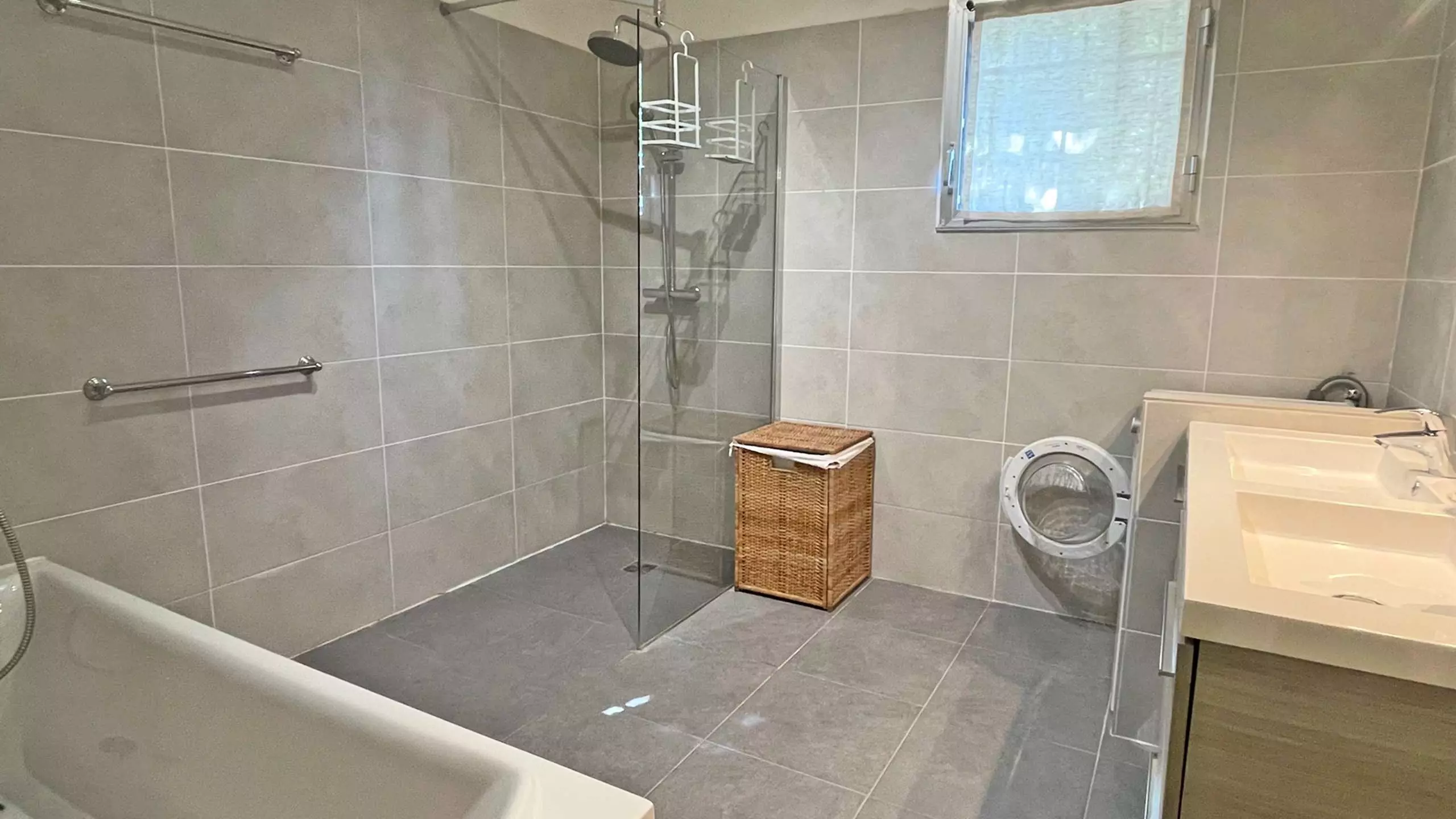 - Bathroom with bathtub + shower, double sink unit and washing machine