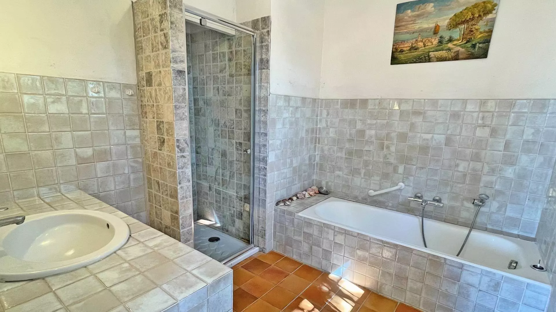 - Air-conditioned master suite: 160cm double bed, storage, bathroom with bathtub + shower and terrace access