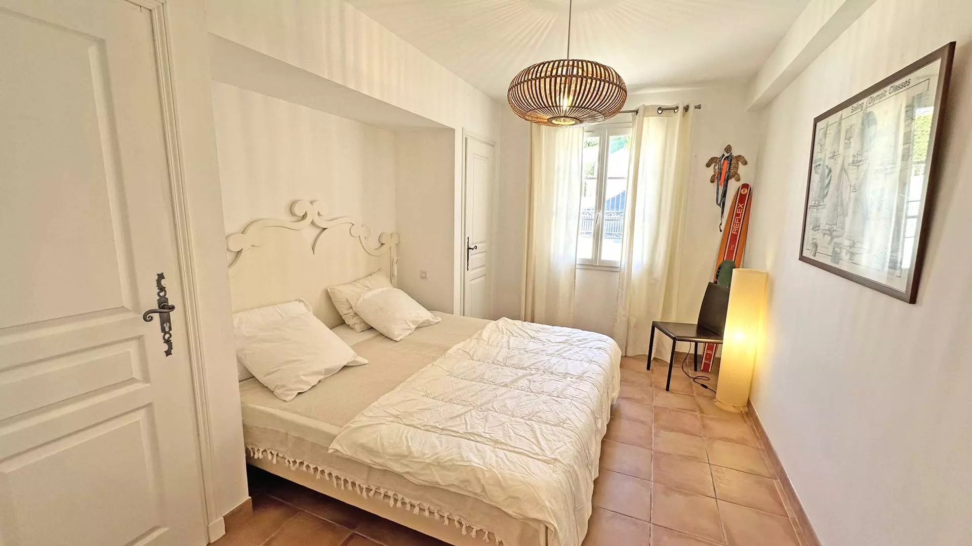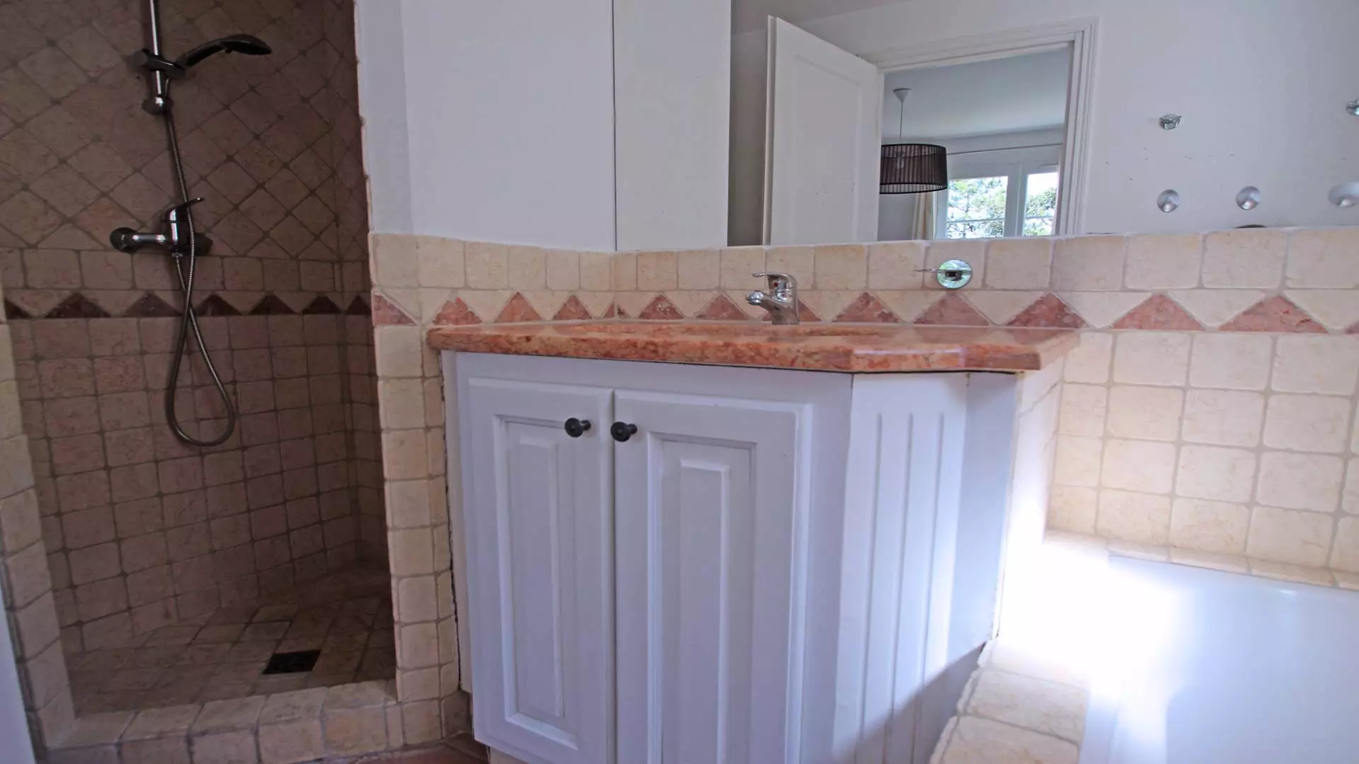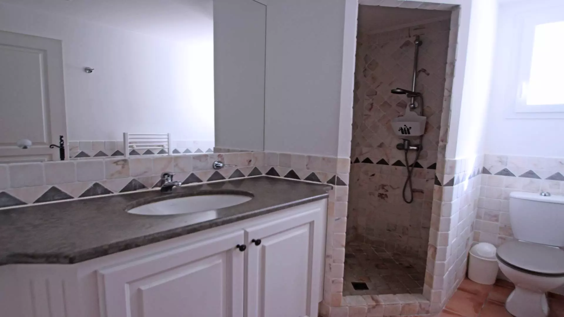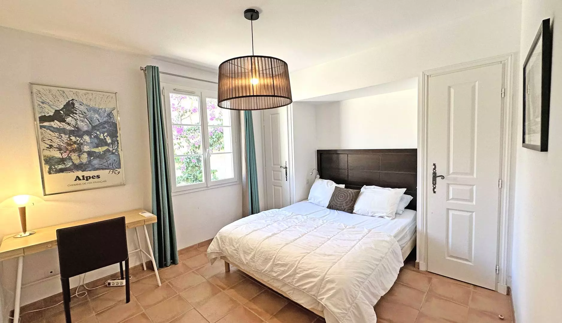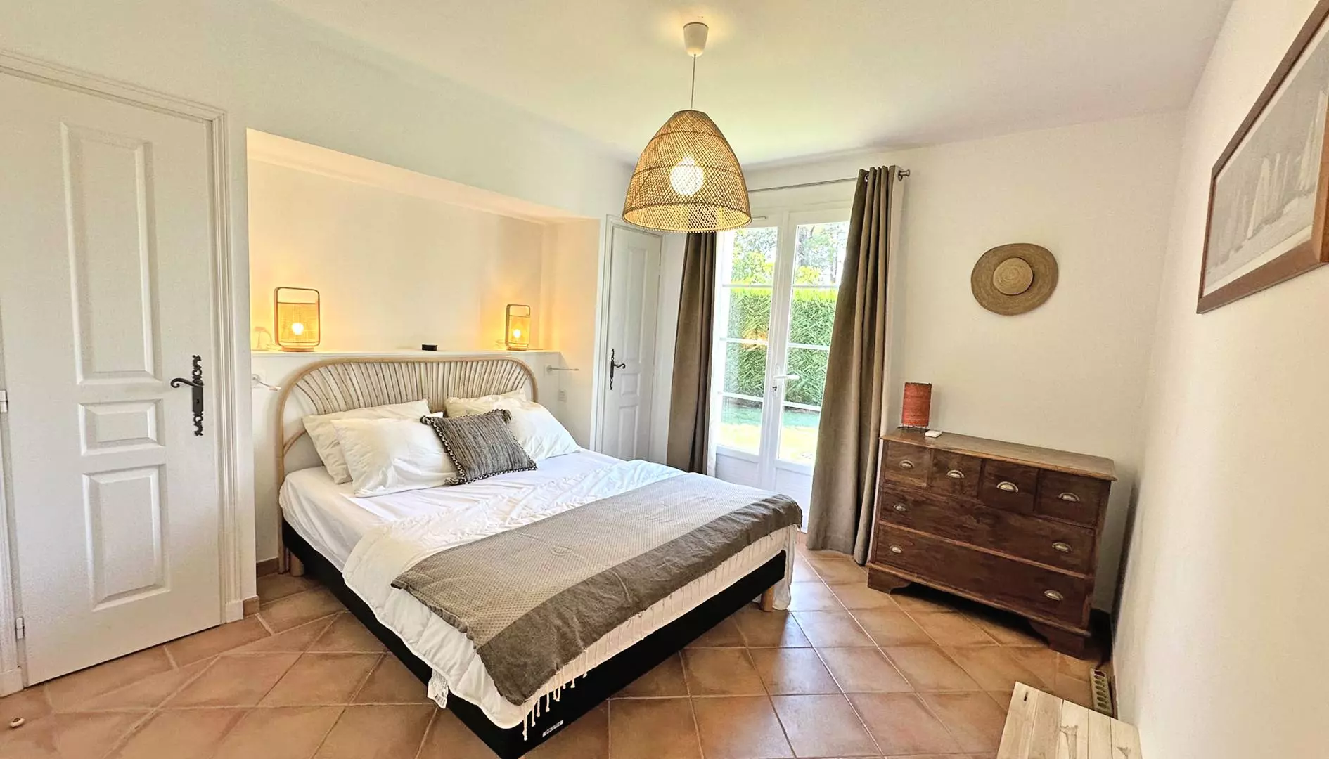 - Air-conditioned master suite (160cm bed) with bathroom (bathtub + shower) and toilet, wardrobe - Access to terrace and swimming pool