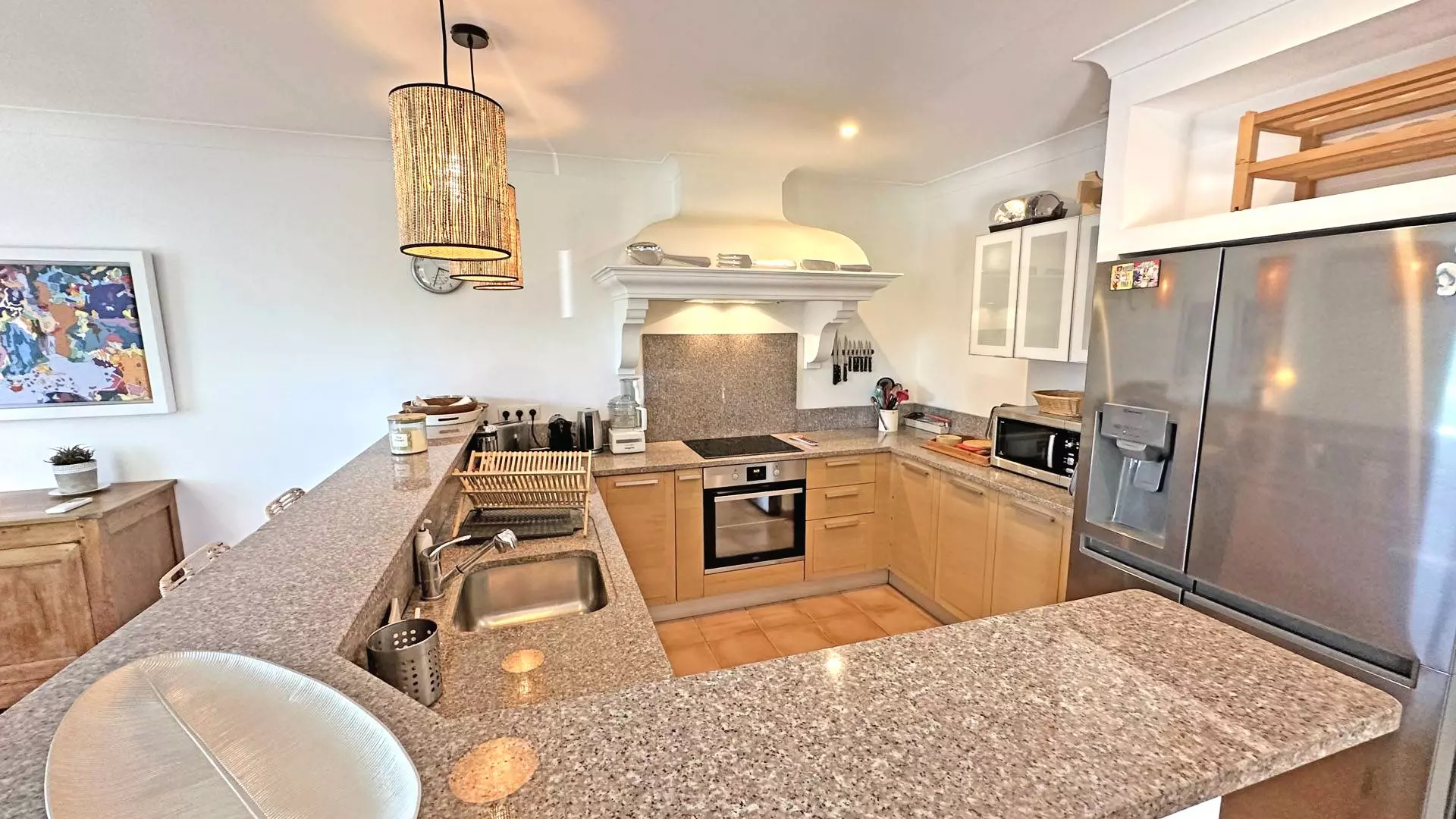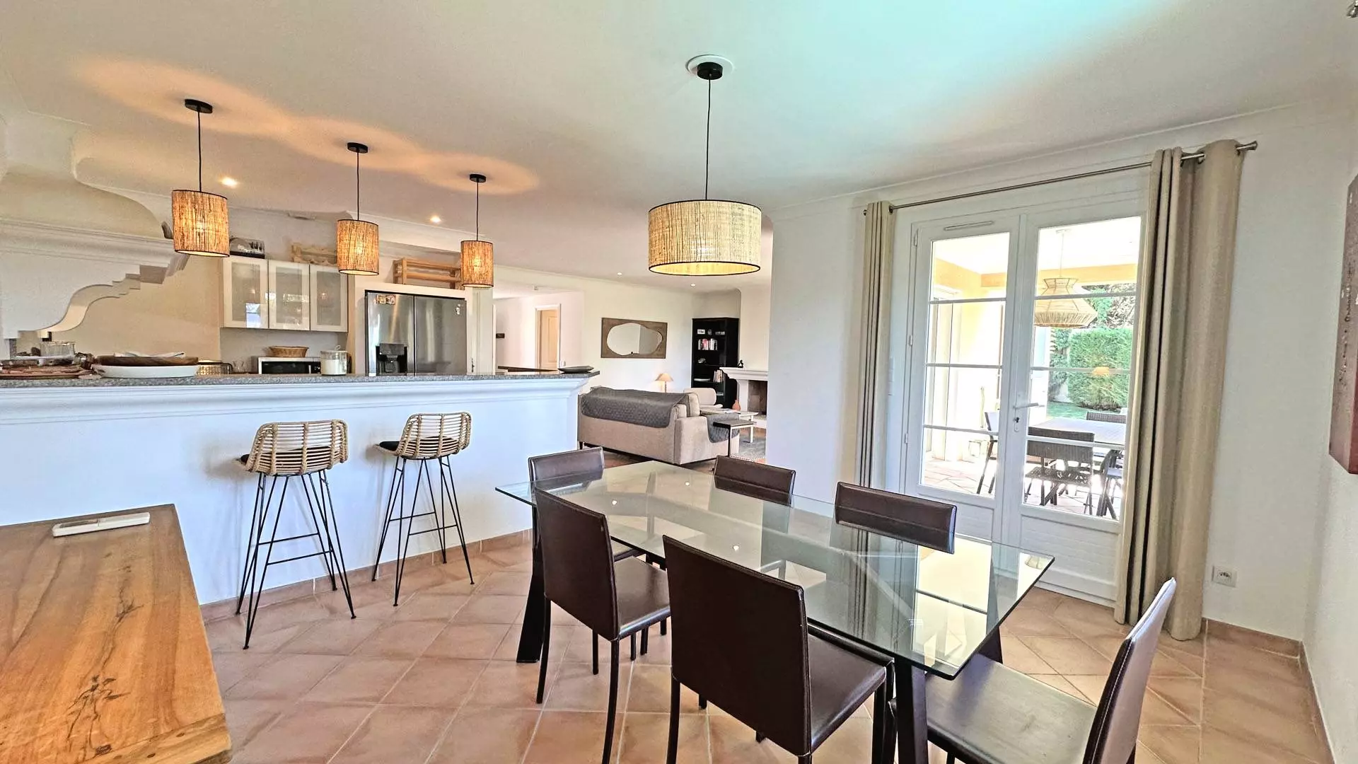 - Fully equipped American kitchen with sink, 4-burner ceramic hob, oven, microwave, filter coffee maker, American fridge, dishwasher, various dishes, etc.