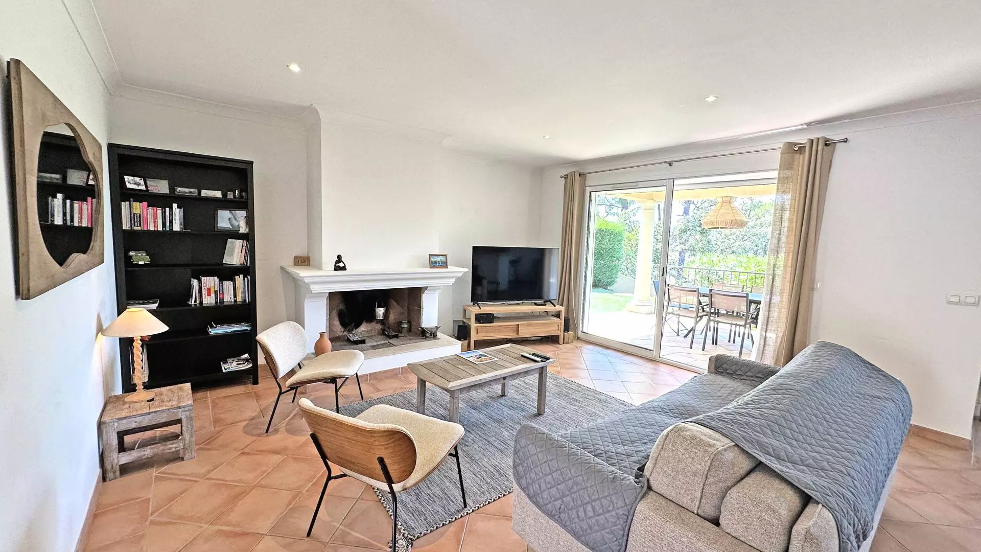 - Air-conditioned living/dining room with sofas, flat-screen TV, decorative fireplace, dining area and direct access to the terrace