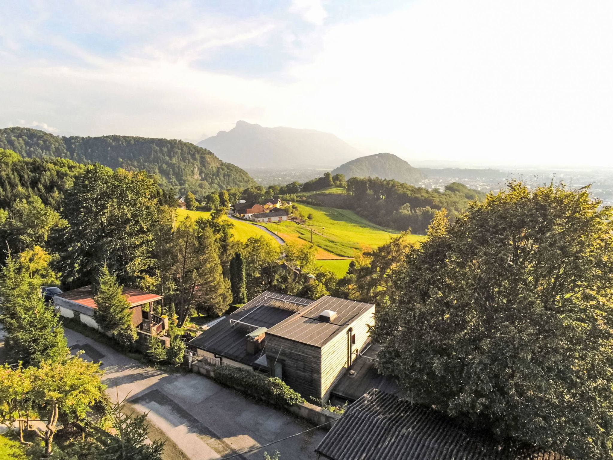 Koppl 5 km from Salzburg: Fantastic house in an excellent location! Breathtaking views over Salzburg! 5 km from Salzburg city center! modern, comfortable single-family house "Heuberg", 2 storeys. Outside the resort, in a quiet, elevated position on a slope. Private: property, garden, swimming pool (7 x 3 m, depth 170 cm, seasonal availability: 01.Jun. - 30.Sep.). Outdoor shower, barbecue. In the house: central heating system. Steep motor access. Parking (for 3 cars) at the house, single garage, public parking on the road. Grocery 2 km, supermarket 2 km, restaurant 1 km, bakery 2 km, bus stop 1.5 km. Golf course (9 hole) 12 km, ski lift 20 km, slopes 20 km. Nearby attractions: Stadt Salzburg 13 km. Hiking paths: Ebenau Mühlen Rundwanderweg 4 km.