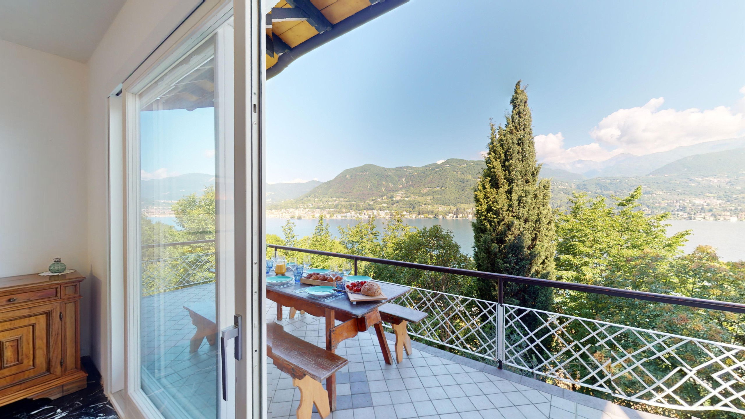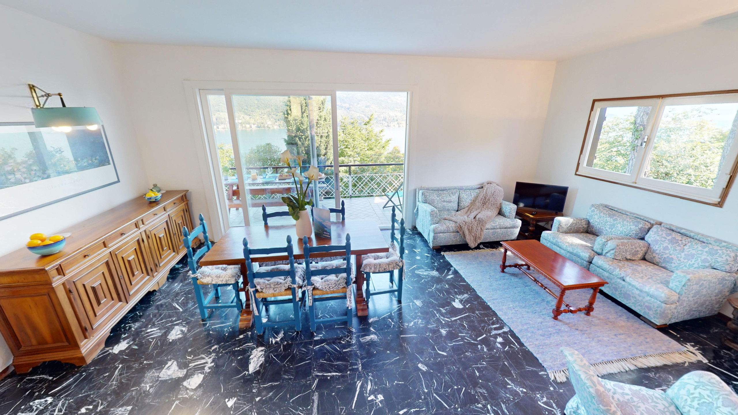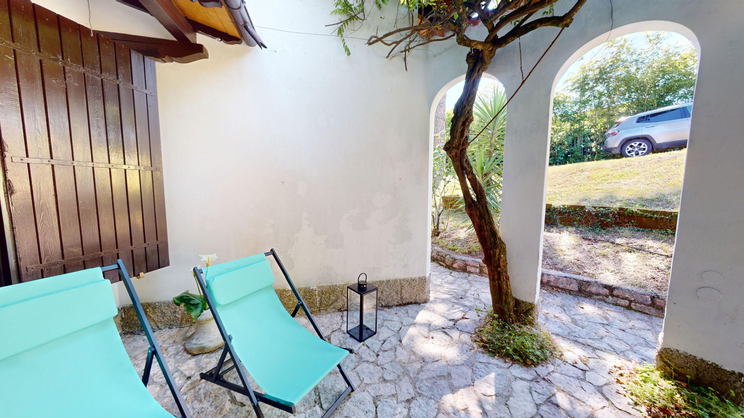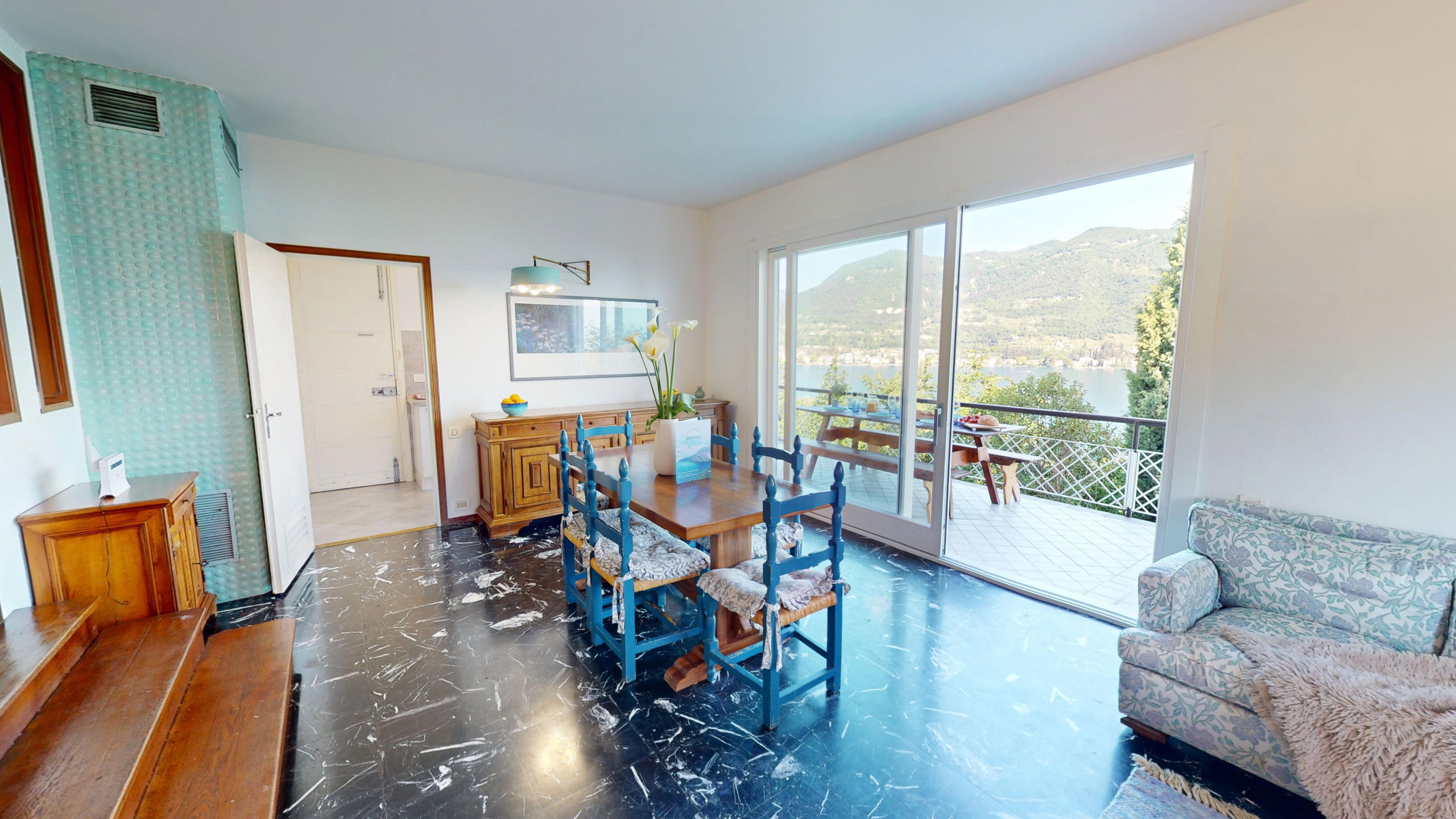 It consists of a living room with kitchenette, two double bedrooms and one with a bunk bed, a bathroom with shower and downstairs there is a service bathroom with washing machine. The furnished terrace is ideal for spending summer evenings admiring the beauty of the Lake. Outside there is a garage for a small to medium-sized car, plus an uncovered place inside. In the Villa there are internal and access stairs.
