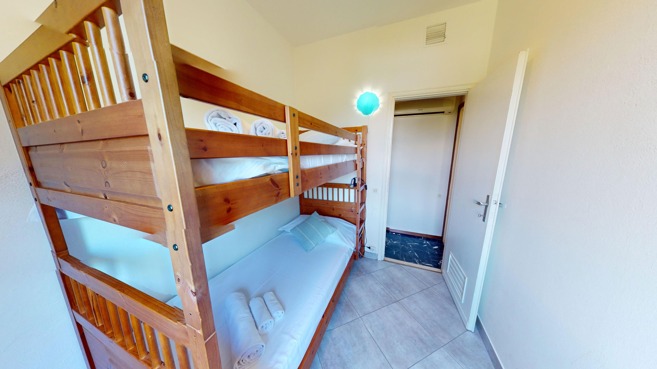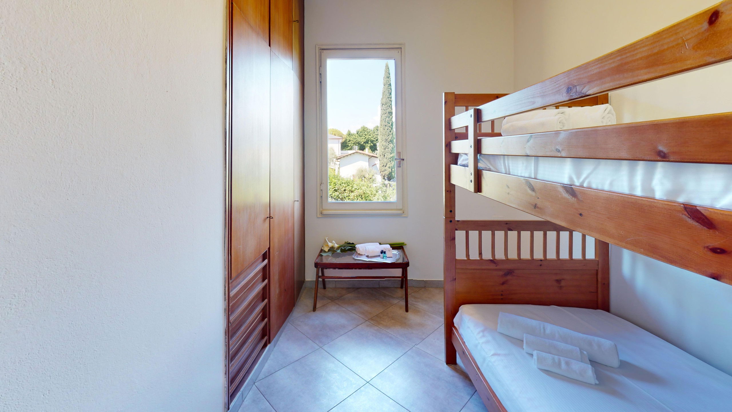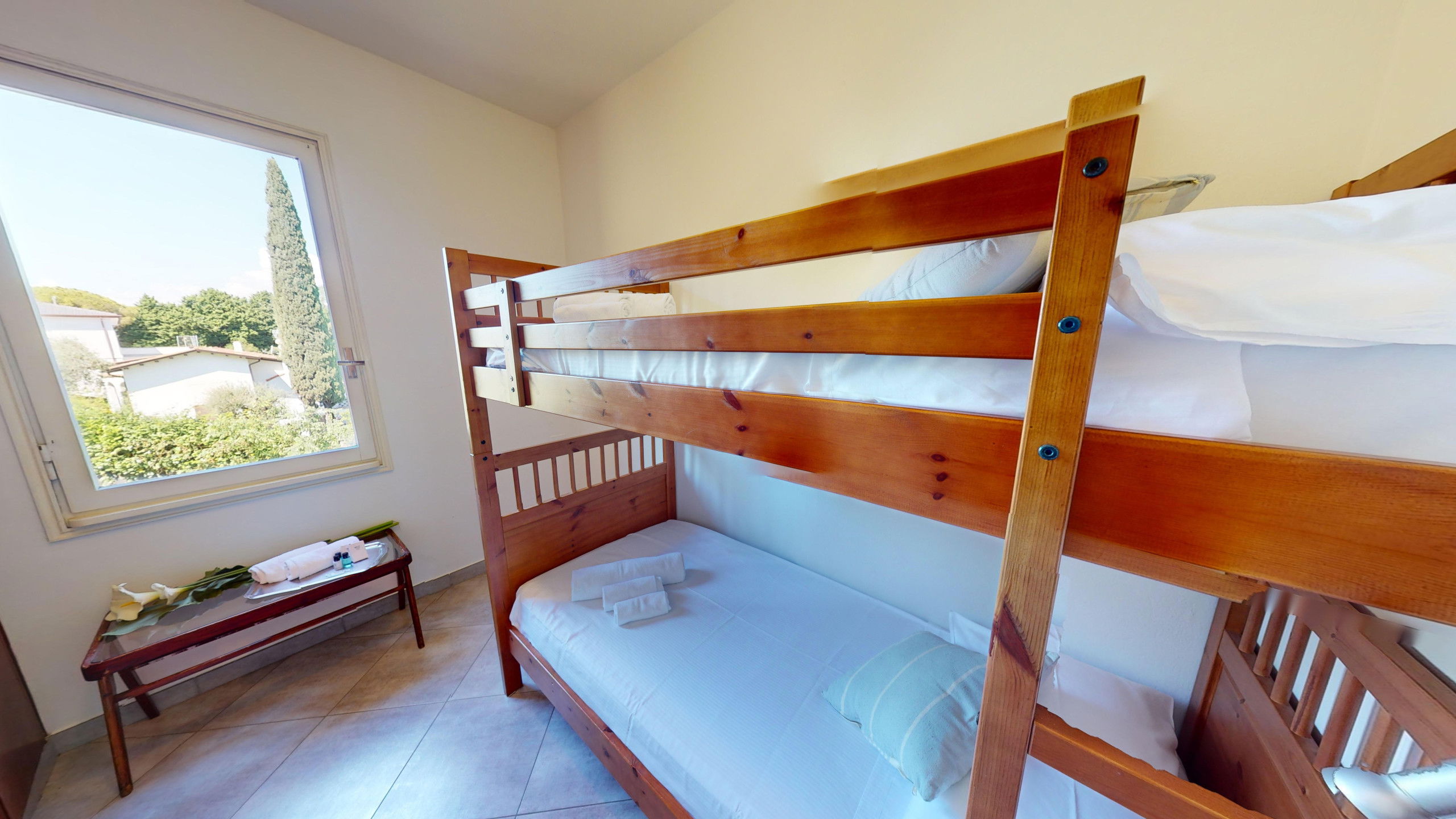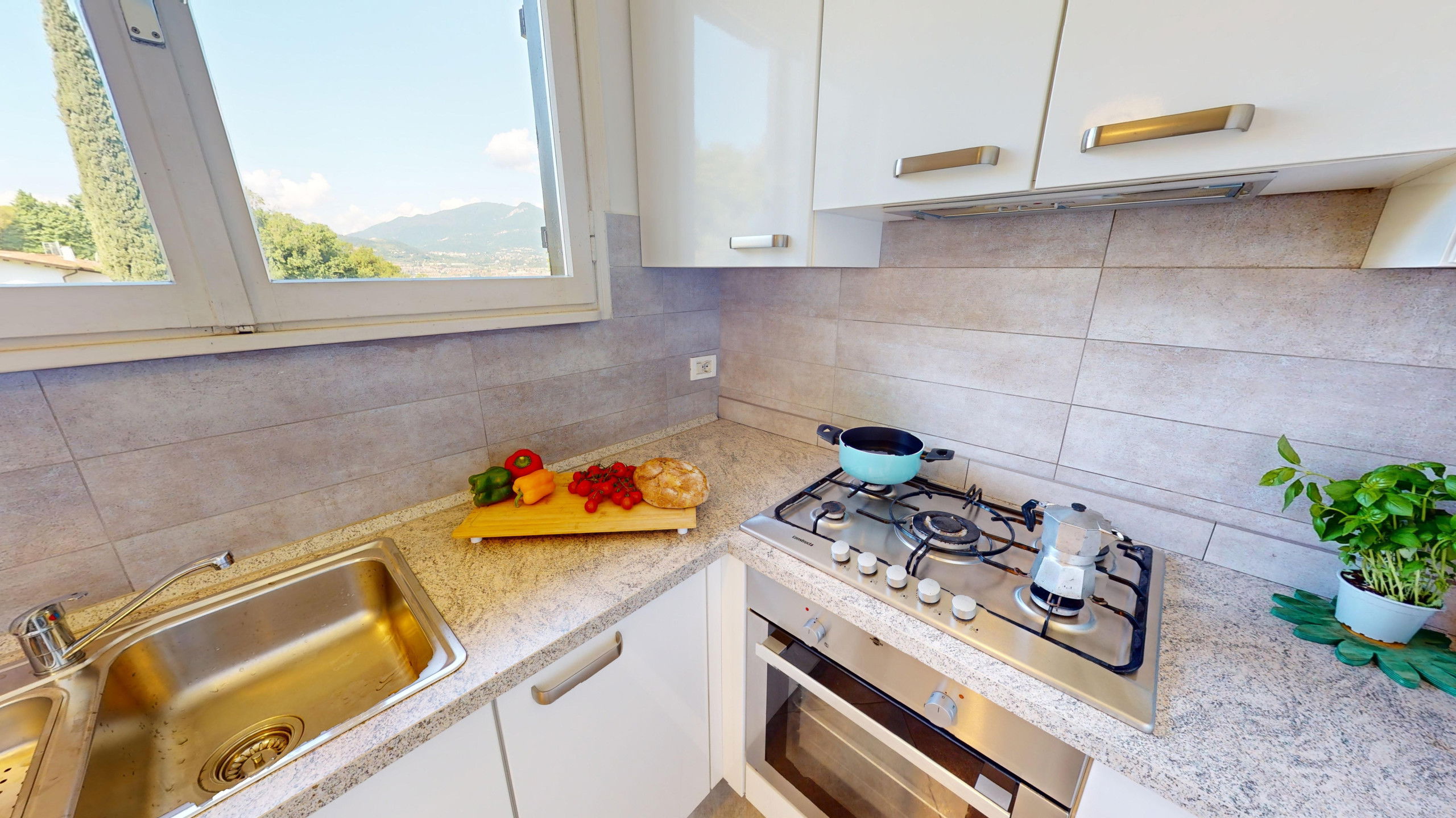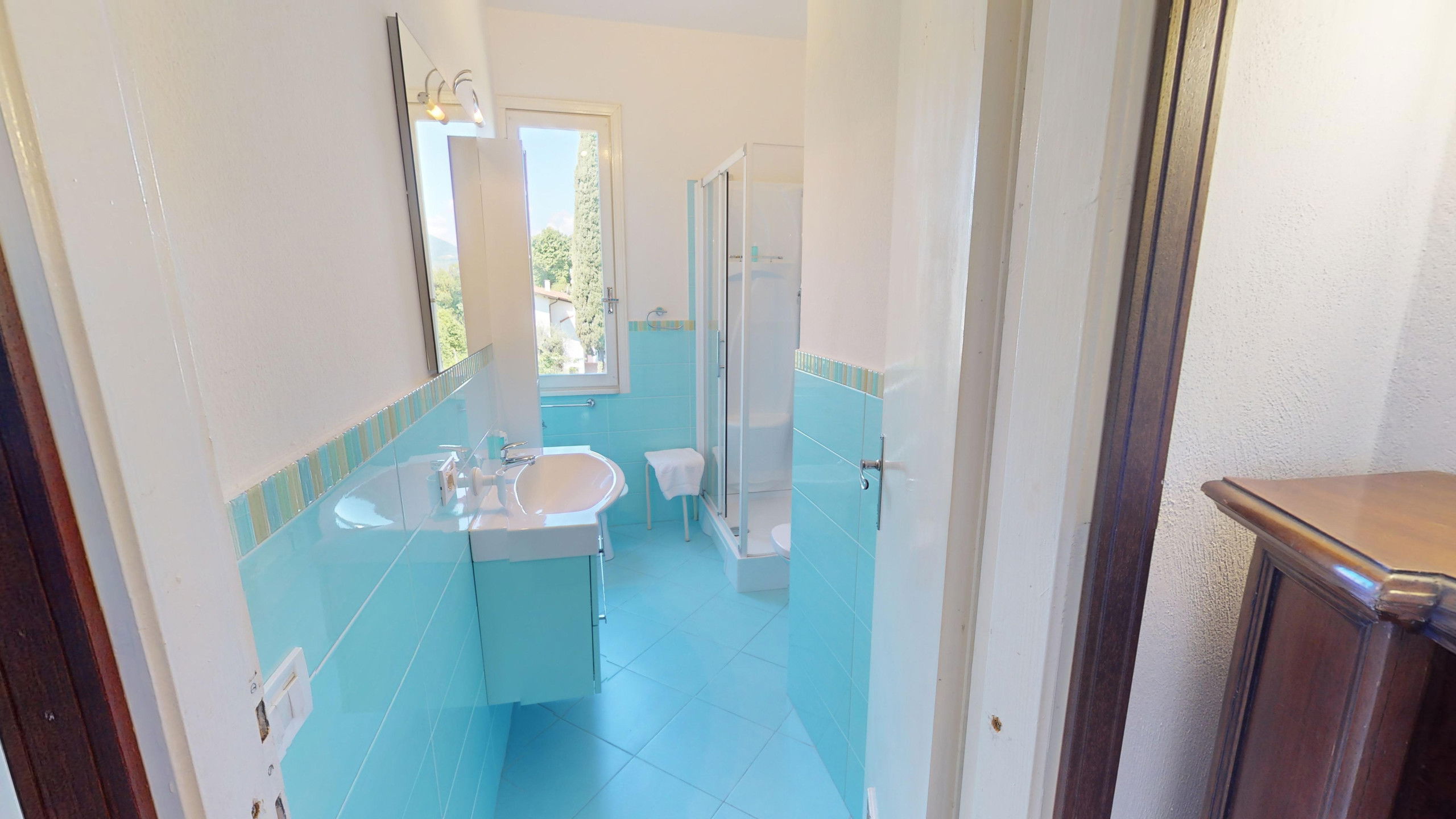 It consists of a living room with kitchenette, two double bedrooms and one with a bunk bed, a bathroom with shower and downstairs there is a service bathroom with washing machine. The furnished terrace is ideal for spending summer evenings admiring the beauty of the Lake. Outside there is a garage for a small to medium-sized car, plus an uncovered place inside. In the Villa there are internal and access stairs.