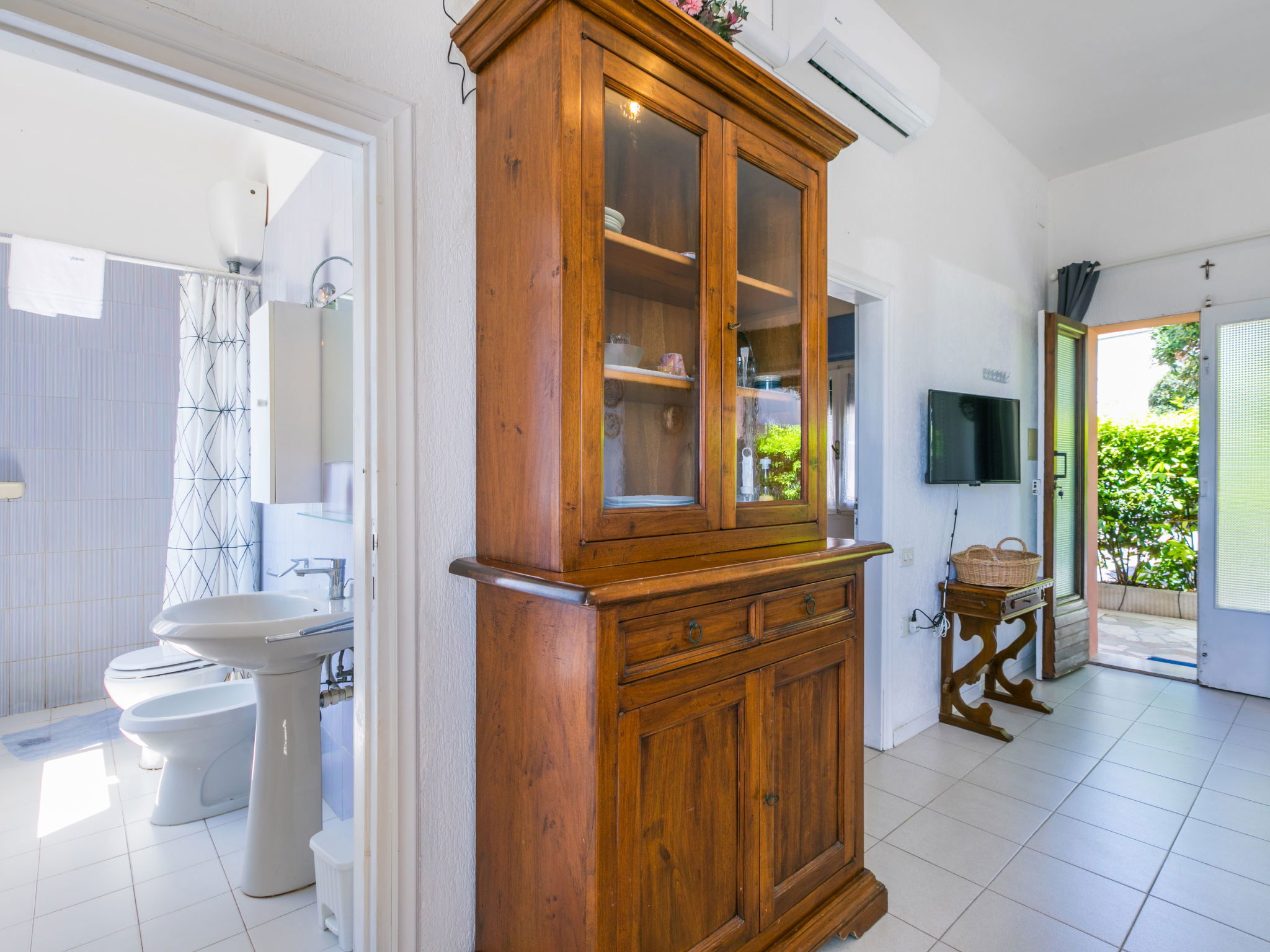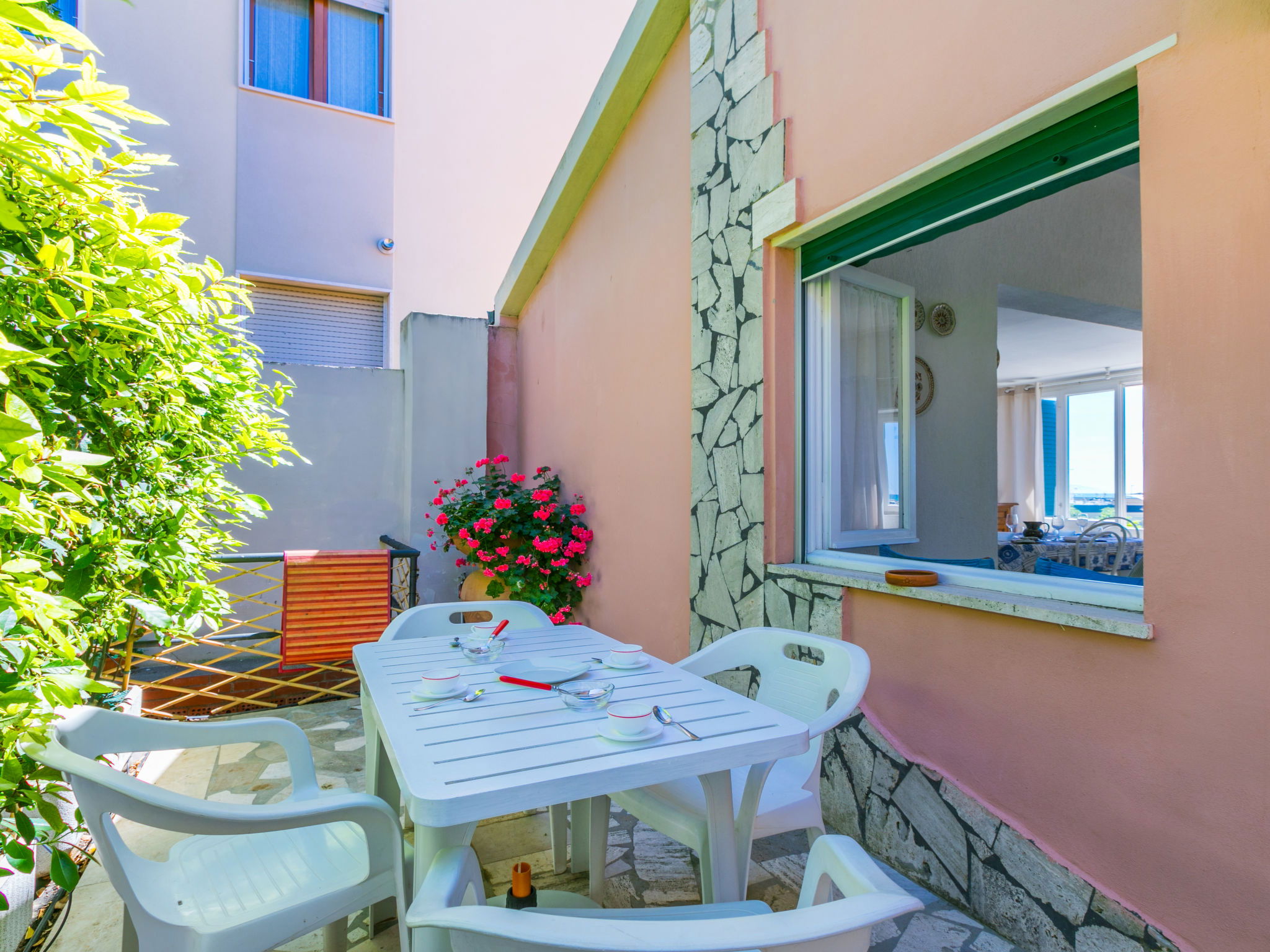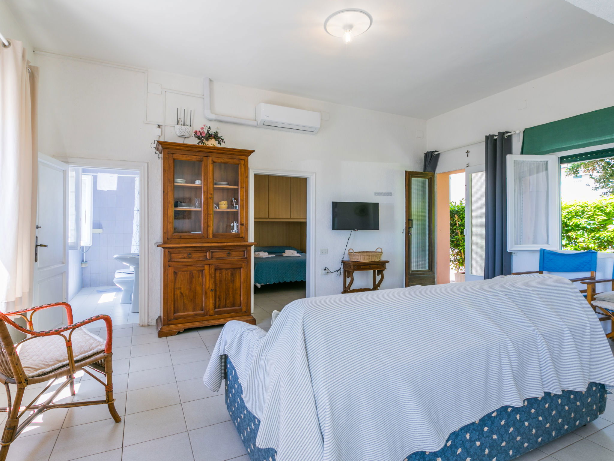 "Harbour", 2-room house 55 m2, on the ground floor. Spacious and bright, simple and practical furnishings: living/sleeping room with 1 double sofabed. Exit to the patio. 1 double bedroom with 1 double bed. Open kitchen (dishwasher, 4 ceramic glass hob hotplates, toaster, kettle, microwave) with dining table and TV. Shower/bidet/WC. Electric heating, air-conditioning. Patio. Terrace furniture. Very beautiful view of the sea and the port. Parking. Please note: maximum 1 pet/ dog allowed. Private entrance, fire extinguisher. IT049018B425WZ96NT