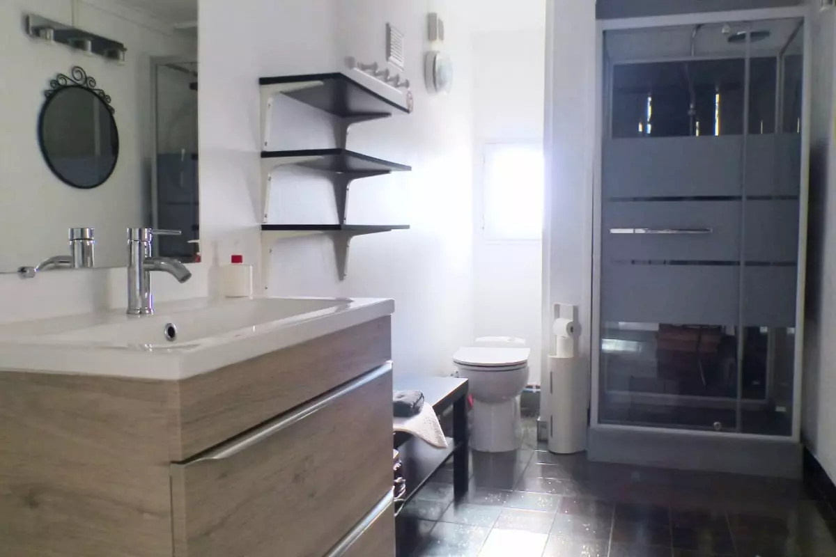 In the outbuilding opposite the kitchen door there are: 2 single beds, a sofa bed with a bathroom with toilet and kitchenette.