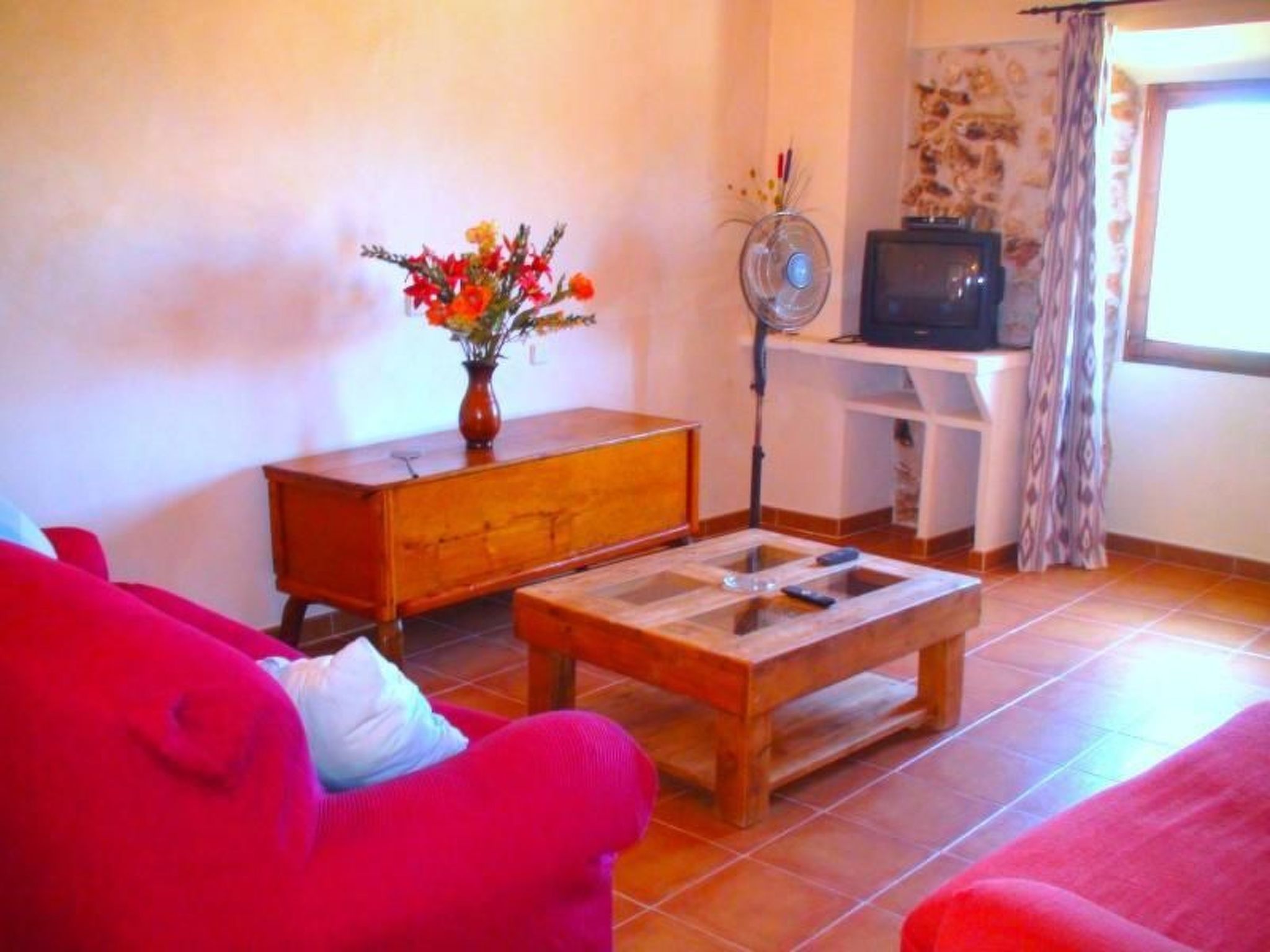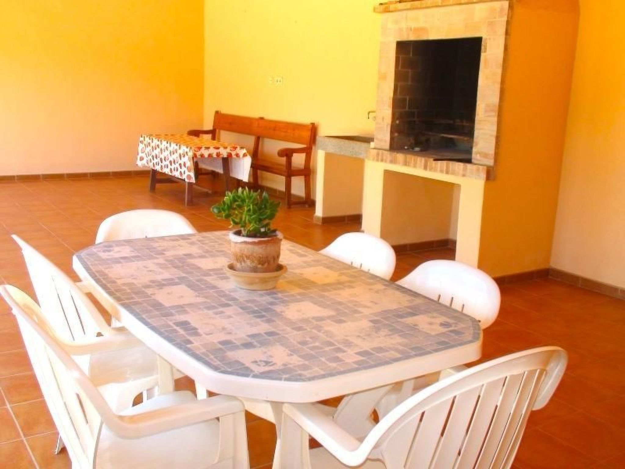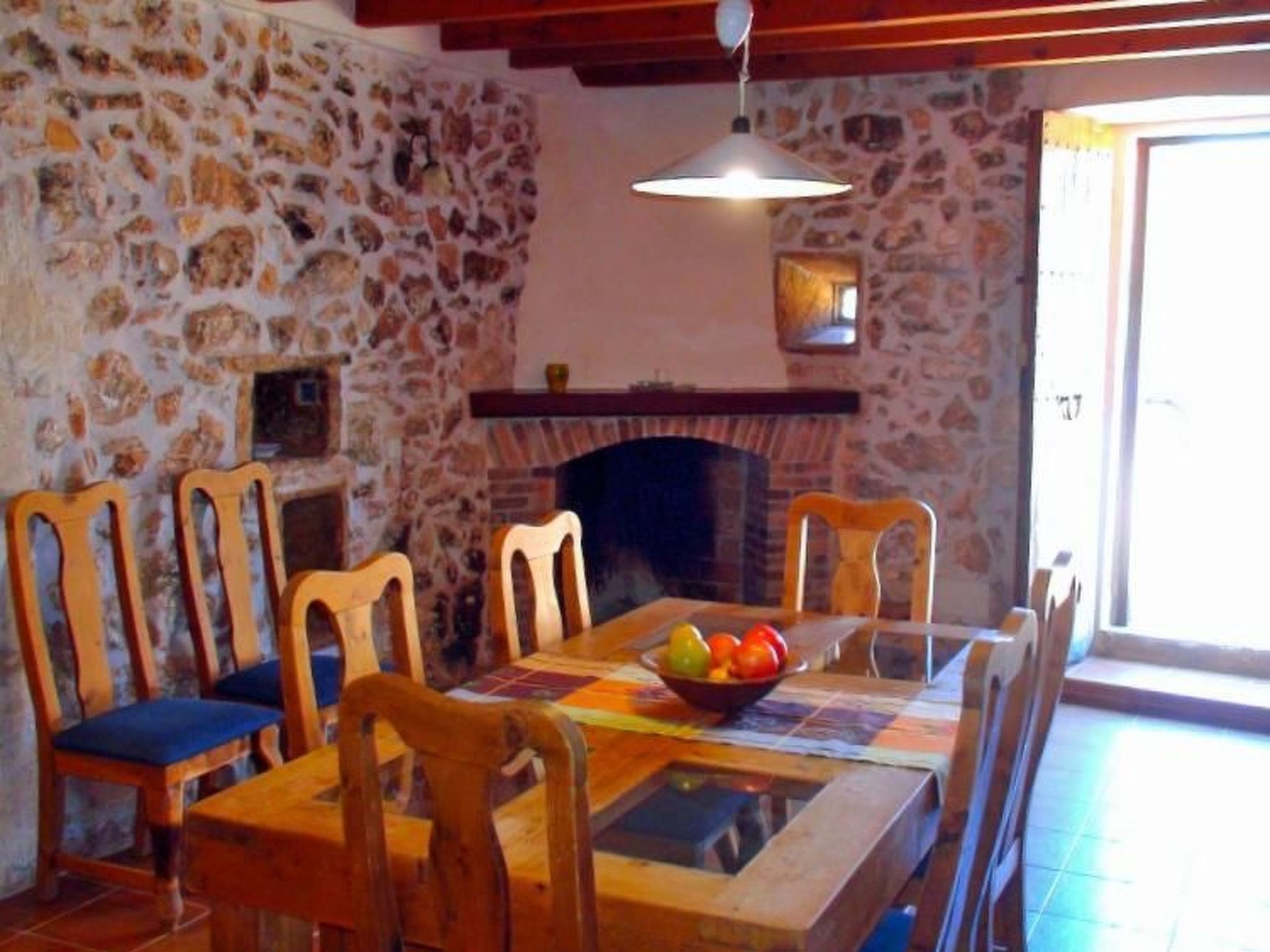 The rustic country house is equipped with everything to make your stay a pleasant one. There are three bedrooms and two bathrooms as well as a separate kitchen, a dining room and a living room. There is a further dining area in the outdoor kitchen, which is ideal for barbecues with its large barbecue. The house can be heated via the fireplace.