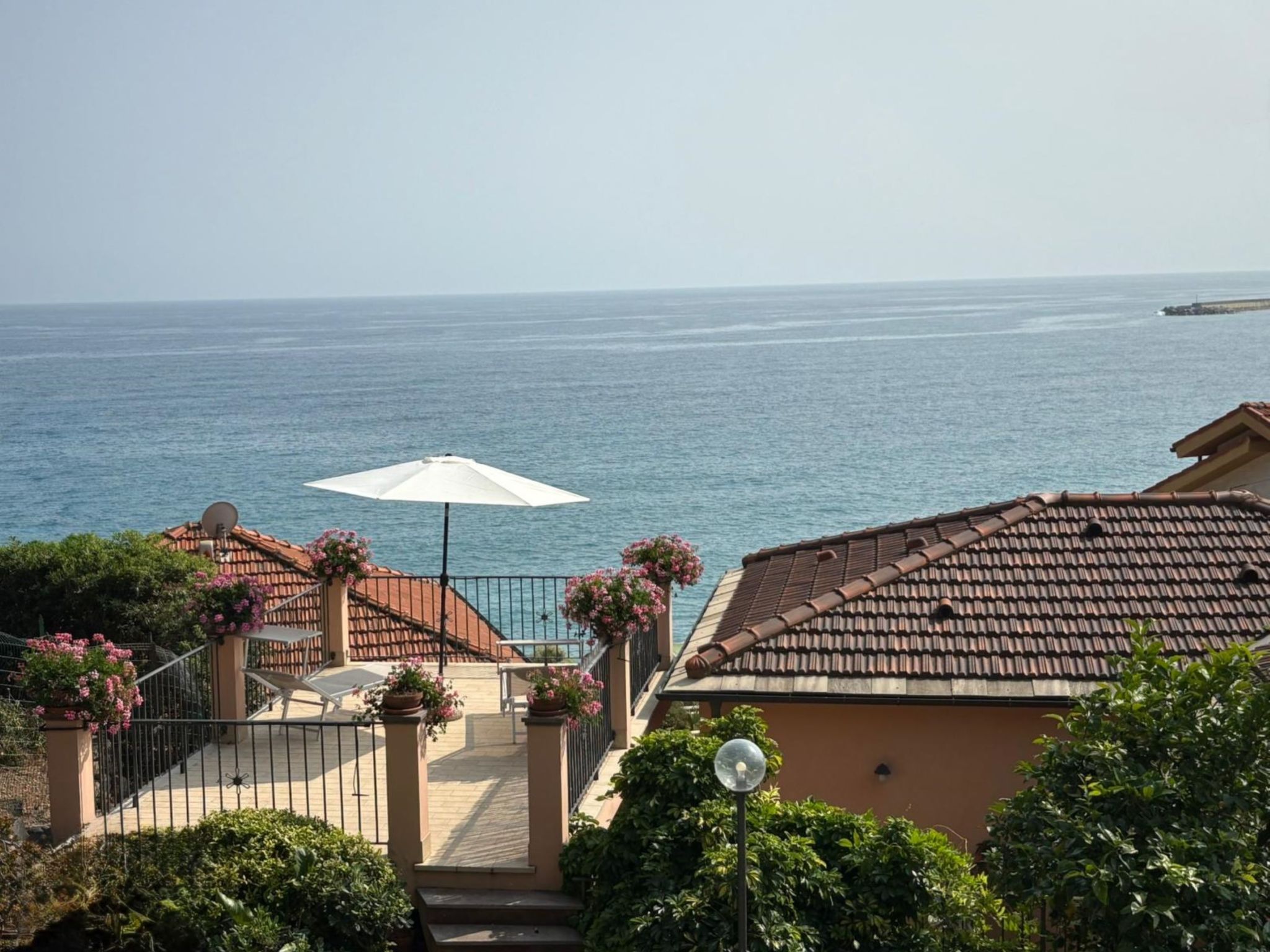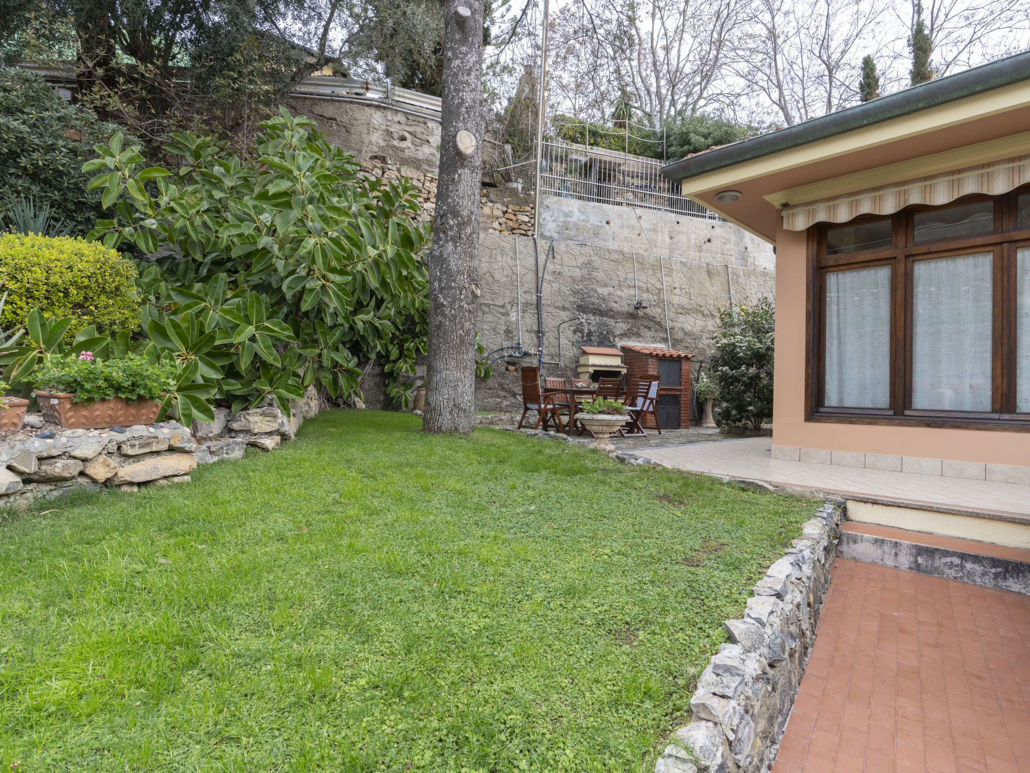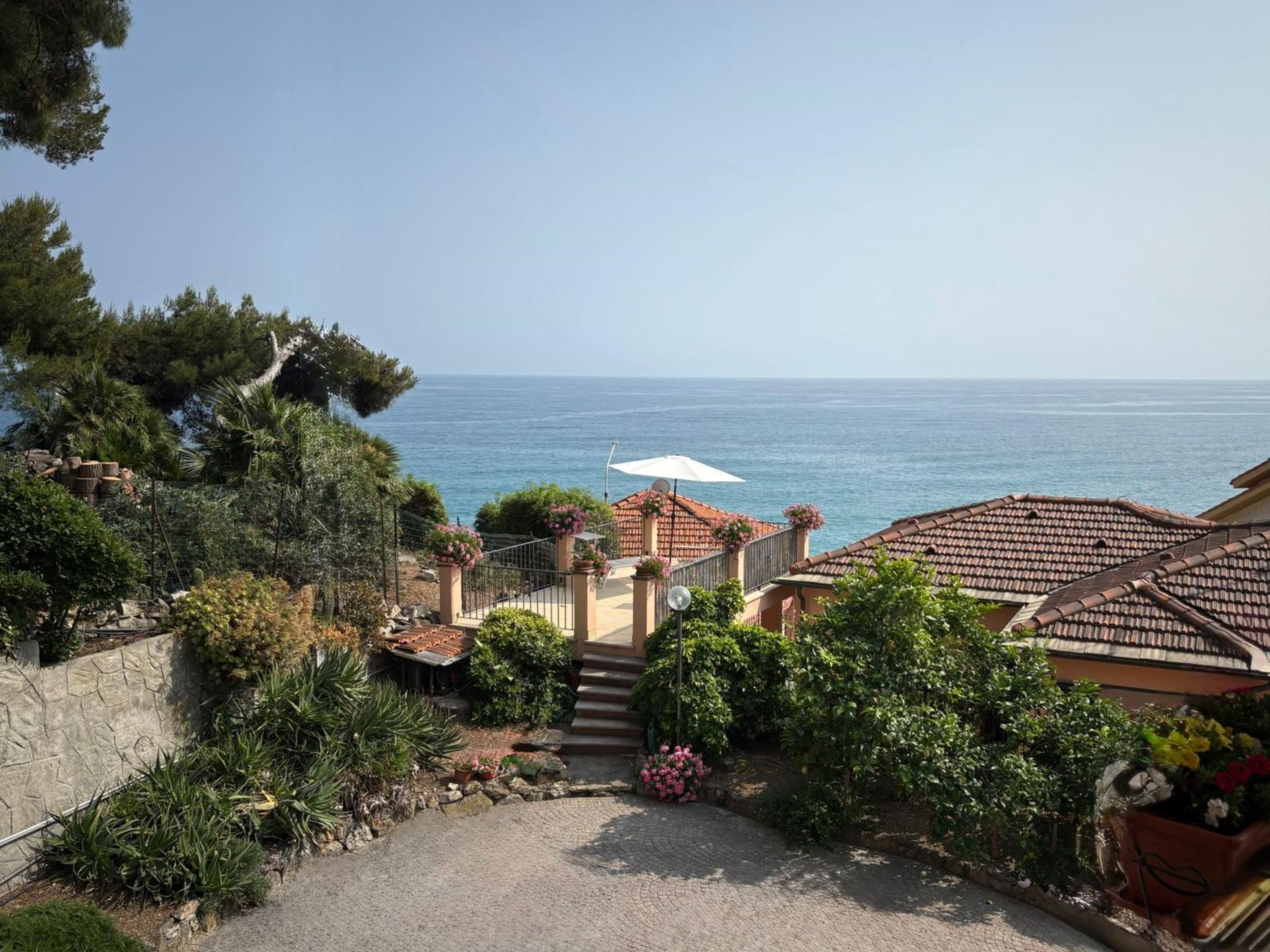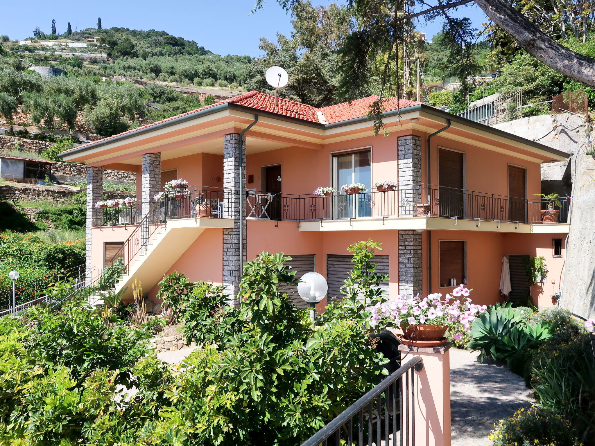 Large, comfortable single-family house "Irma". In the district of Aregai 2.5 km from the centre of Santo Stefano al Mare, on the outskirts, 3.5 km from the centre of San Lorenzo al Mare, 8 km from the centre of Imperia, in a secluded, sunny position on a slope, 500 m from the sea, in a cul-de-sac. Private: large, well-kept terraced garden, 600 m2 (fenced) with lawn and wildlife garden. Outdoor shower. Stepped path to the house. Parking (for 3 cars) on the premises, single garage at the house. Shop 2.5 km, supermarket 800 m, restaurant 2.5 km, bus stop 100 m, railway station "Imperia" 7 km, sandy beach "Santo Stefano al Mare" 2.4 km pebble beach 500 m, indoor swimming pool 7 km. Marina 1.7 km, golf course (18 hole) 18.5 km, cycle lane 100 m. The owner does not accept any youth groups. Please note: the owner lives on the same property. Main road 100 m from the property.