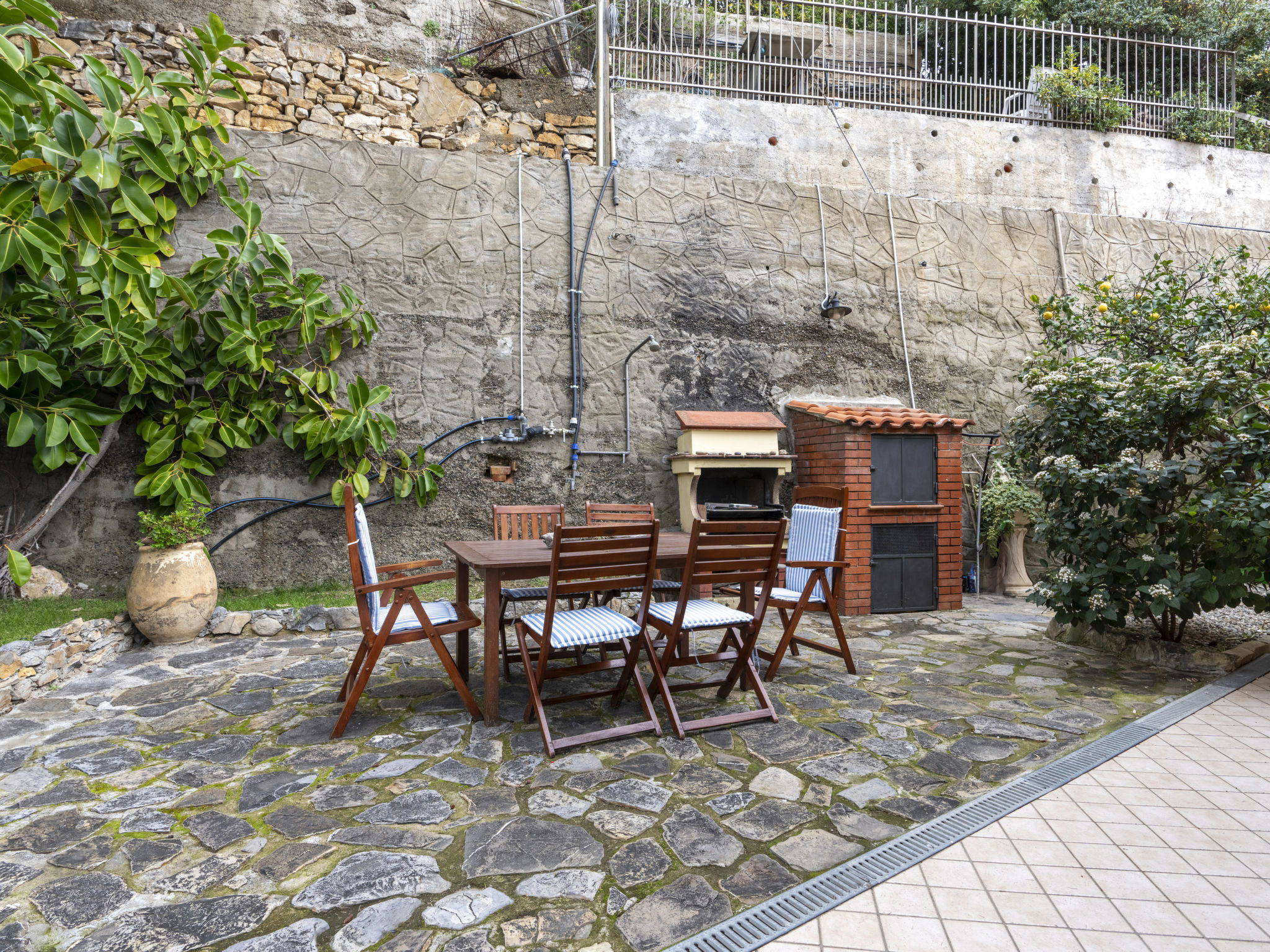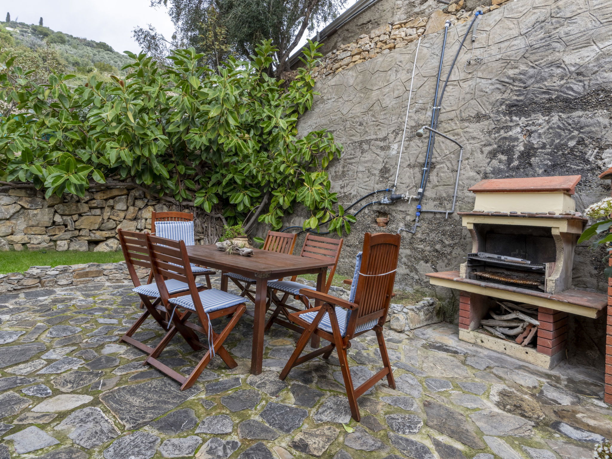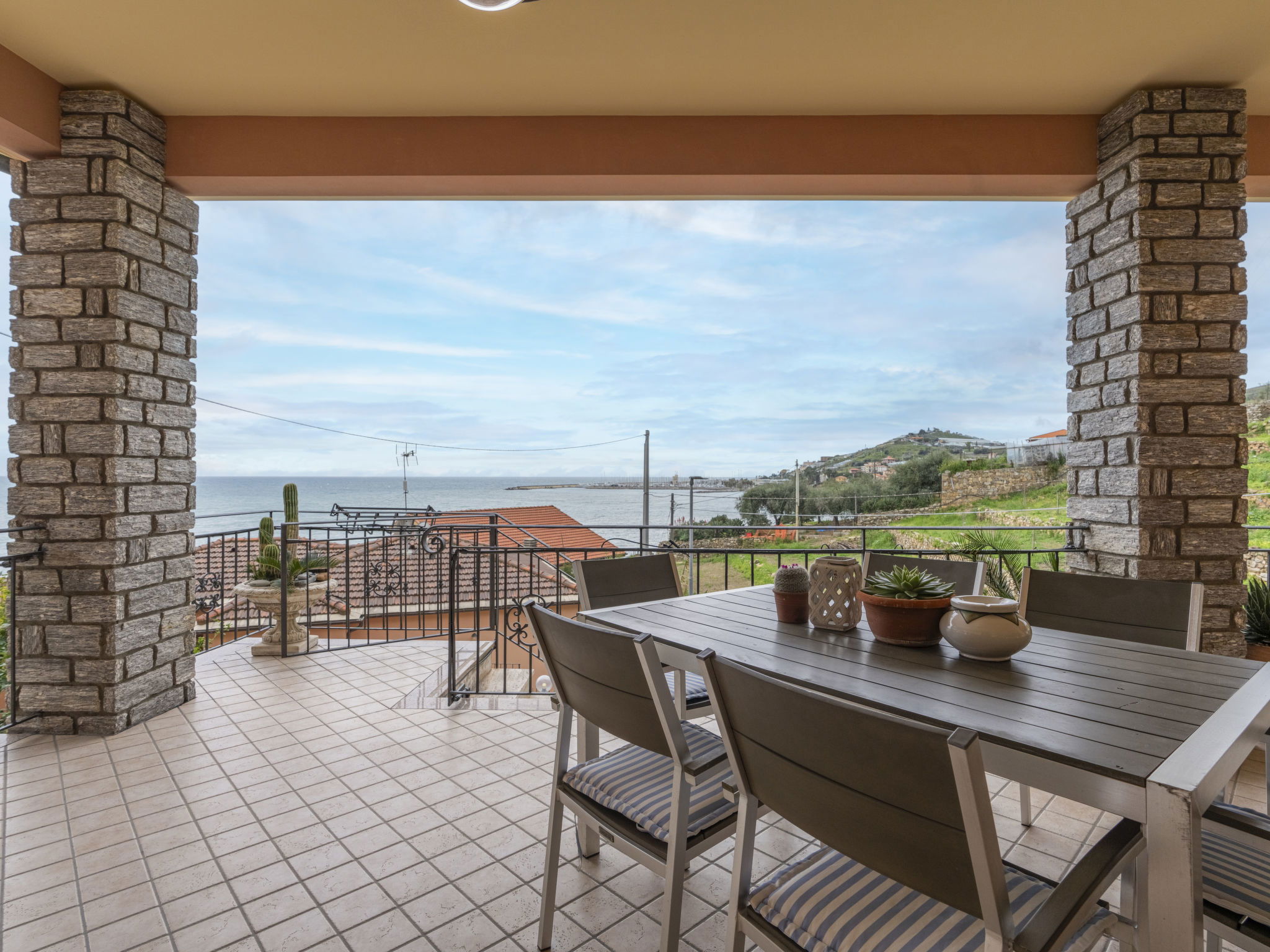 Large, comfortable single-family house "Irma". In the district of Aregai 2.5 km from the centre of Santo Stefano al Mare, on the outskirts, 3.5 km from the centre of San Lorenzo al Mare, 8 km from the centre of Imperia, in a secluded, sunny position on a slope, 500 m from the sea, in a cul-de-sac. Private: large, well-kept terraced garden, 600 m2 (fenced) with lawn and wildlife garden. Outdoor shower. Stepped path to the house. Parking (for 3 cars) on the premises, single garage at the house. Shop 2.5 km, supermarket 800 m, restaurant 2.5 km, bus stop 100 m, railway station "Imperia" 7 km, sandy beach "Santo Stefano al Mare" 2.4 km pebble beach 500 m, indoor swimming pool 7 km. Marina 1.7 km, golf course (18 hole) 18.5 km, cycle lane 100 m. The owner does not accept any youth groups. Please note: the owner lives on the same property. Main road 100 m from the property.