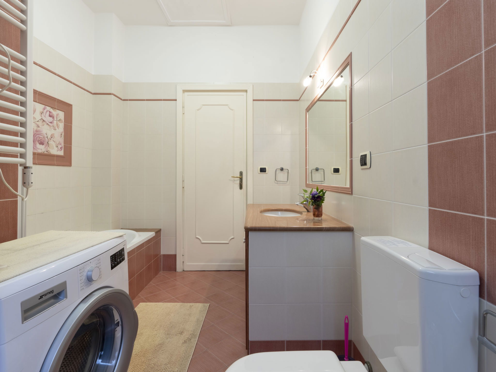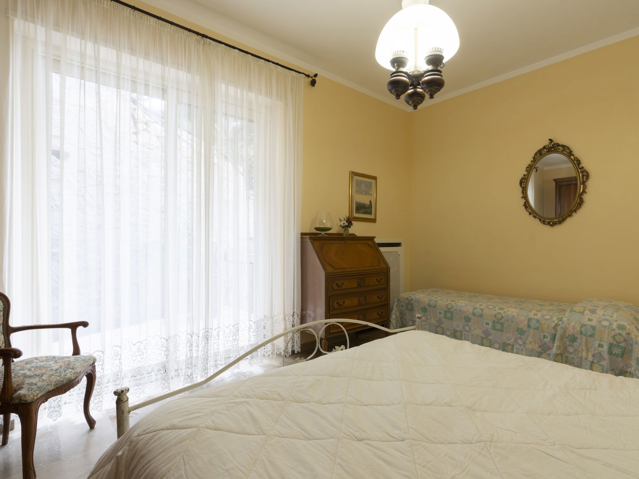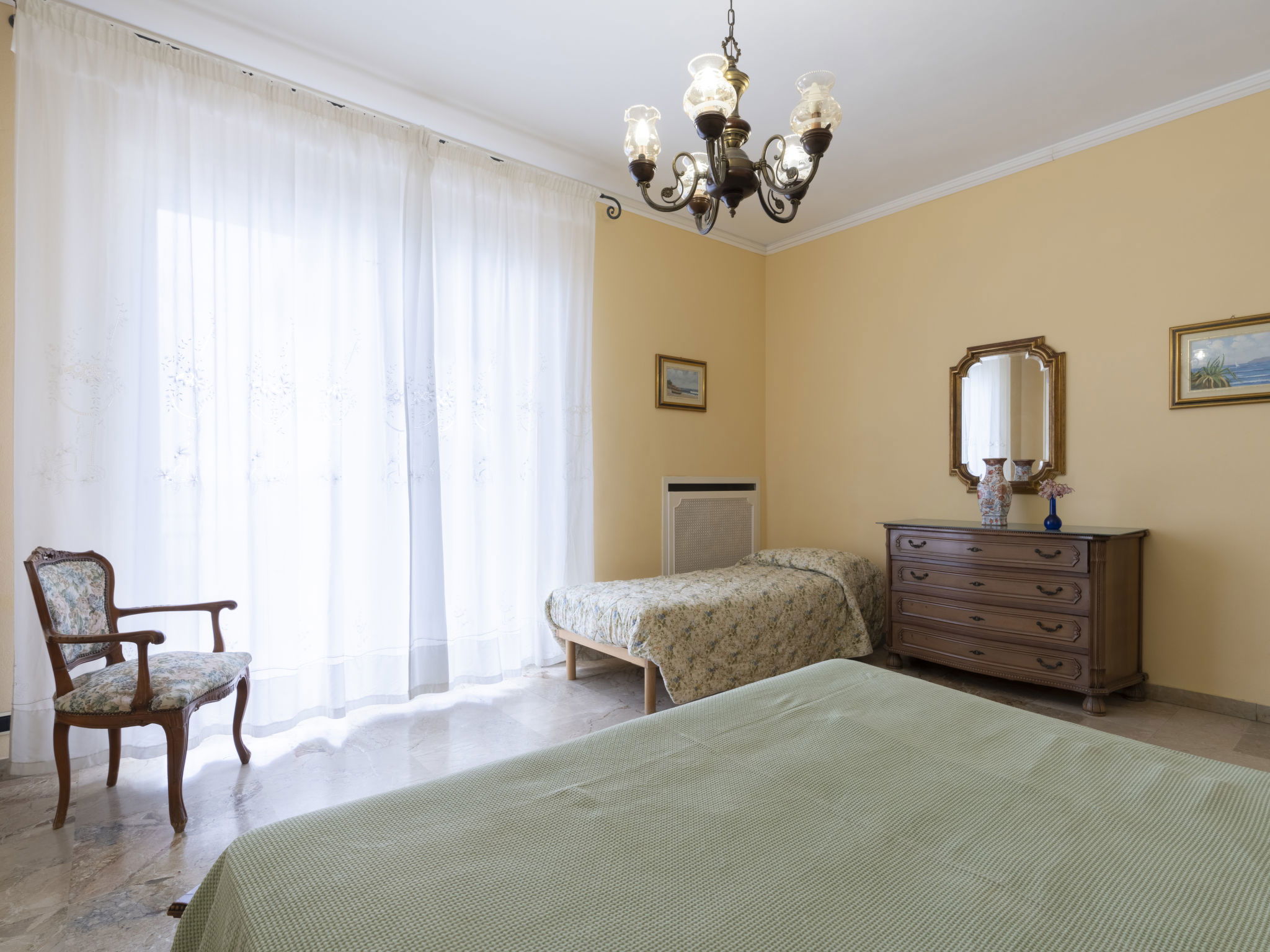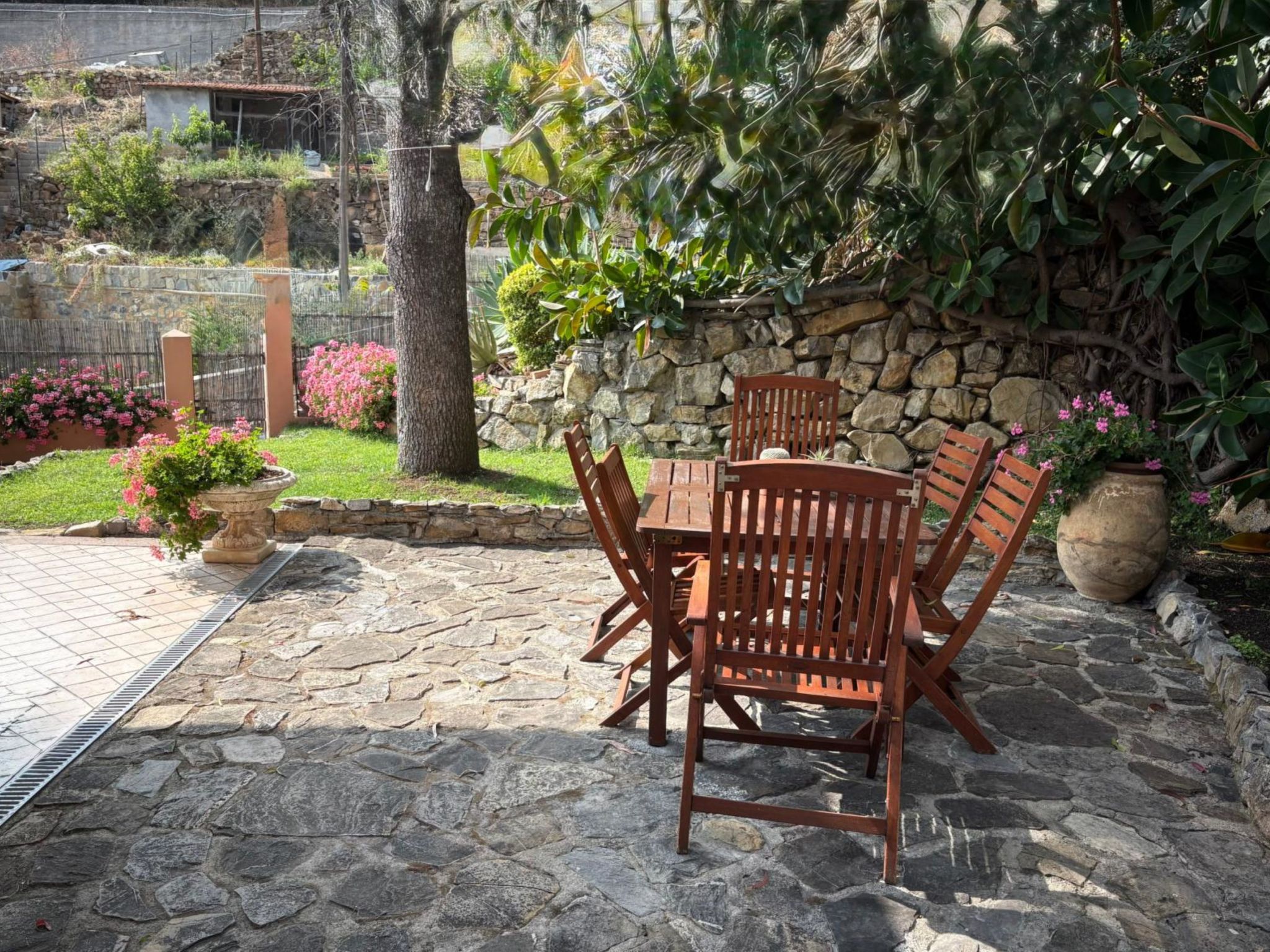 Large, comfortable single-family house "Irma". In the district of Aregai 2.5 km from the centre of Santo Stefano al Mare, on the outskirts, 3.5 km from the centre of San Lorenzo al Mare, 8 km from the centre of Imperia, in a secluded, sunny position on a slope, 500 m from the sea, in a cul-de-sac. Private: large, well-kept terraced garden, 600 m2 (fenced) with lawn and wildlife garden. Outdoor shower. Stepped path to the house. Parking (for 3 cars) on the premises, single garage at the house. Shop 2.5 km, supermarket 800 m, restaurant 2.5 km, bus stop 100 m, railway station "Imperia" 7 km, sandy beach "Santo Stefano al Mare" 2.4 km pebble beach 500 m, indoor swimming pool 7 km. Marina 1.7 km, golf course (18 hole) 18.5 km, cycle lane 100 m. The owner does not accept any youth groups. Please note: the owner lives on the same property. Main road 100 m from the property.