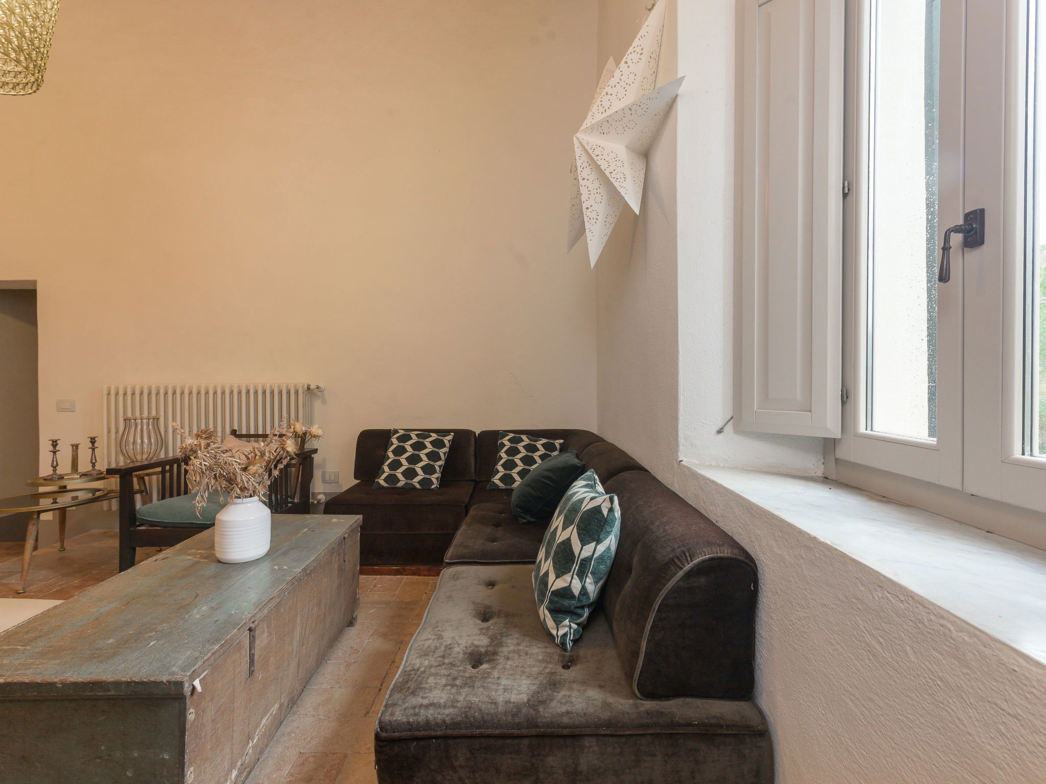 8-room villa 450 m2 on 2 levels. Tasteful and stylish furnishings: living room with TV. Exit to the garden, to the terrace. 1 double bedroom. 1 large double bedroom with sloping ceilings. Exit to the balcony. 1 double bedroom with shower/WC. Exit to the garden. Large kitchen (4 gas rings, pizza oven) with dining table. Shower/WC, double hand-basin. Upper floor: open large living/dining room with TV and wood-burning stove. Exit to the terrace. Living room. 1 double bedroom with wood-burning stove. 2 double bedrooms. Open kitchen (oven, dishwasher, 5 gas rings, toaster, kettle, microwave). Exit to the terrace. 2 showers/WC. Balcony, 2 terraces, patio. Terrace furniture. Marvellous panoramic view of the countryside. Facilities: washing machine, iron, hair dryer. Internet (WiFi, free). Parking (roofed). Please note: non-smokers only. Maximum 1 pet/ dog allowed. Private entrance, smoke alarm, fire extinguisher. IT053023C2T9WPGO9V