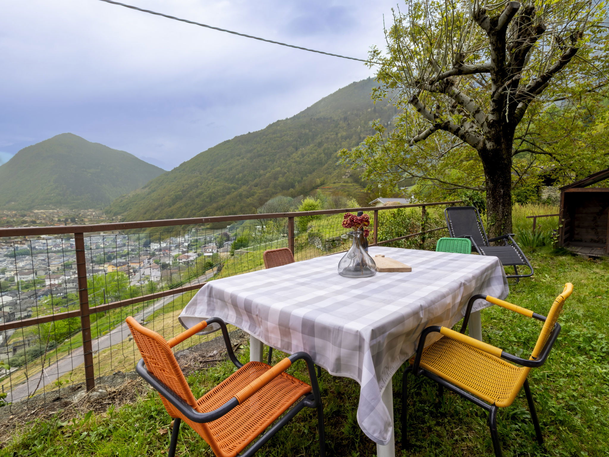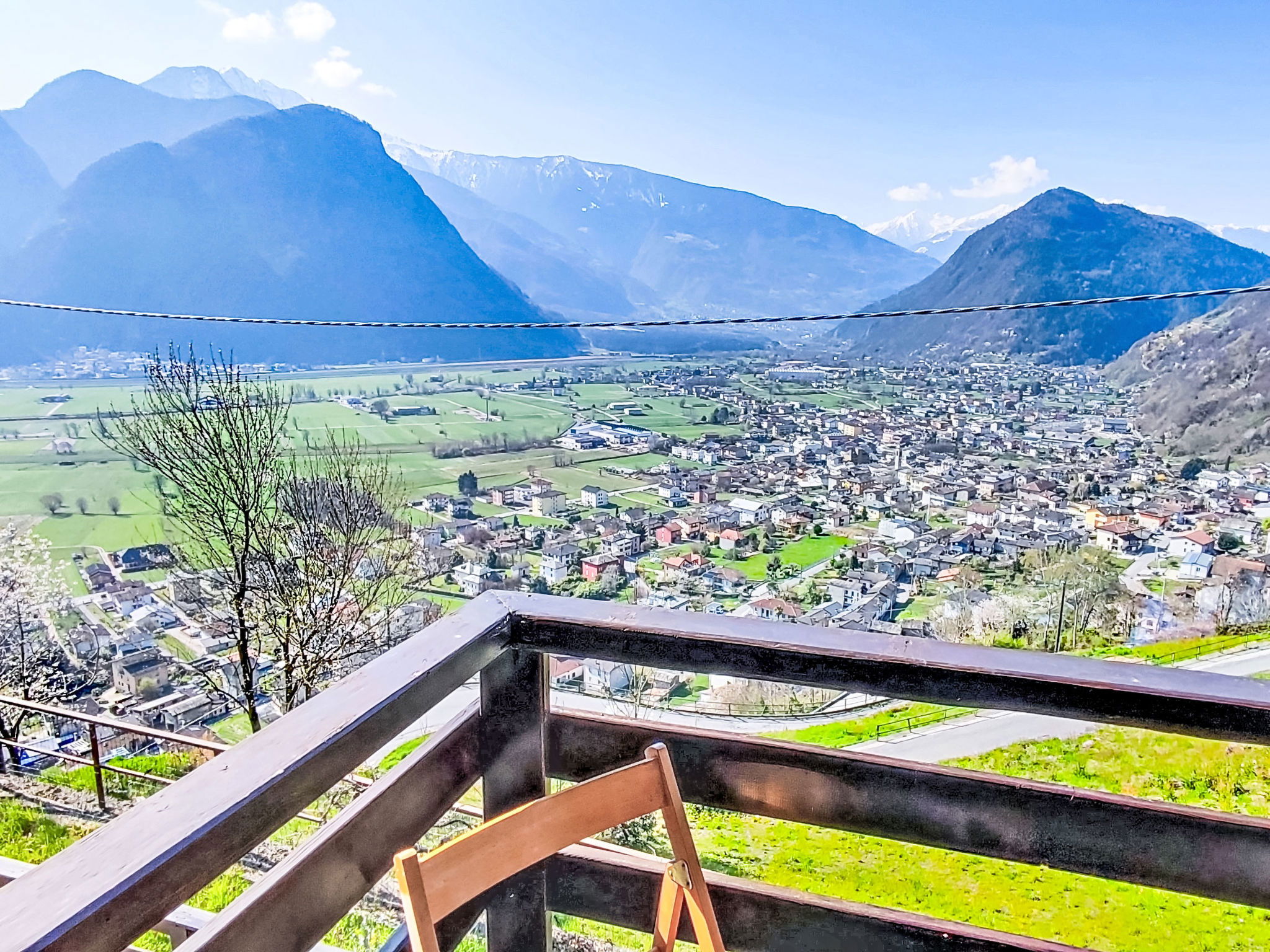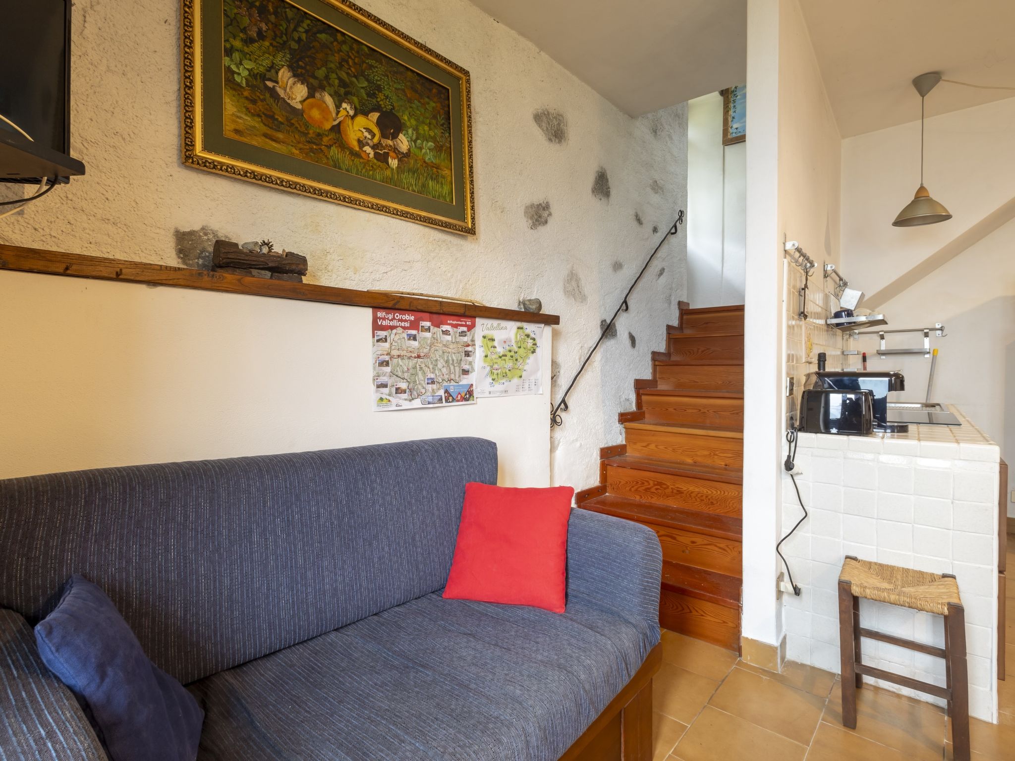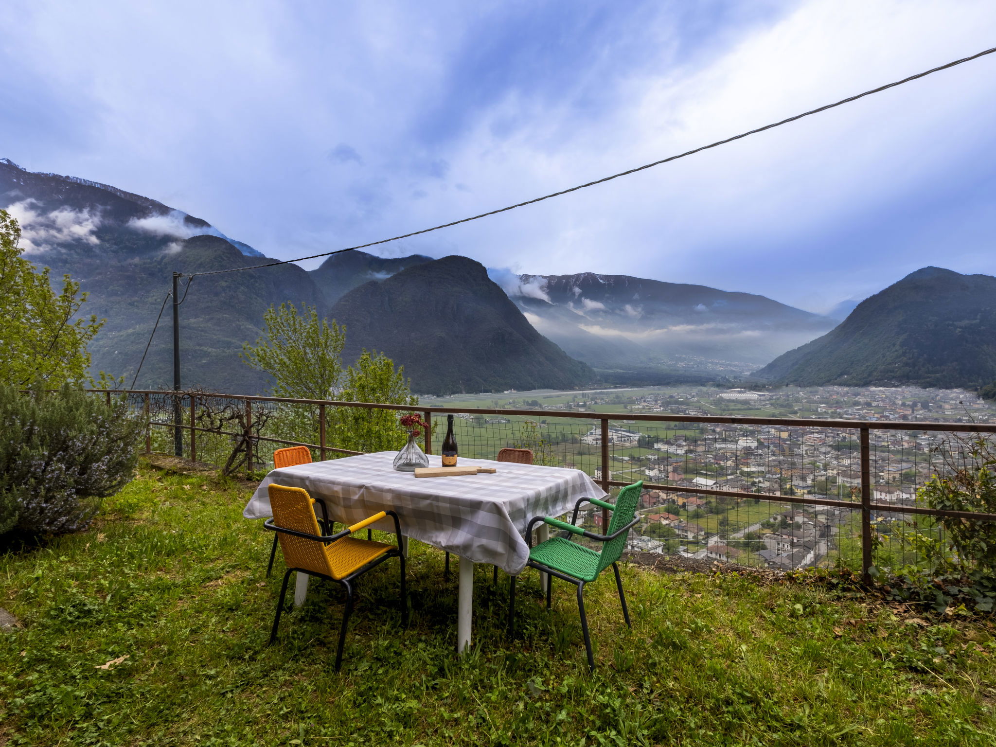 3-room house 84 m2 on 2 levels, south facing position. Bright, practical and rustic furnishings: open living/dining room with open-hearth fireplace (only for decoration), Scandinavian wood stove, dining table and TV. Exit to the garden. Kitchenette (mini-oven, 4 induction hot plates, toaster, kettle, electric coffee machine) with TV. Exit to the garden. Upper floor: 1 room with 1 double bed. Exit to the balcony. 1 room with 2 beds. Exit to the balcony. Shower/bidet/WC. Electric heating, wood heating, boiler. Heating not available in all rooms. Parquet floors. Balcony, garden. Barbecue, deck chairs (2). Beautiful panoramic view of the mountains, the valley and the garden. Facilities: children's high chair, baby cot, hair dryer. Please note: non-smoking house. Maximum 1 pet/ dog allowed. Private entrance, fire extinguisher. IT014005C25CSGKL2B