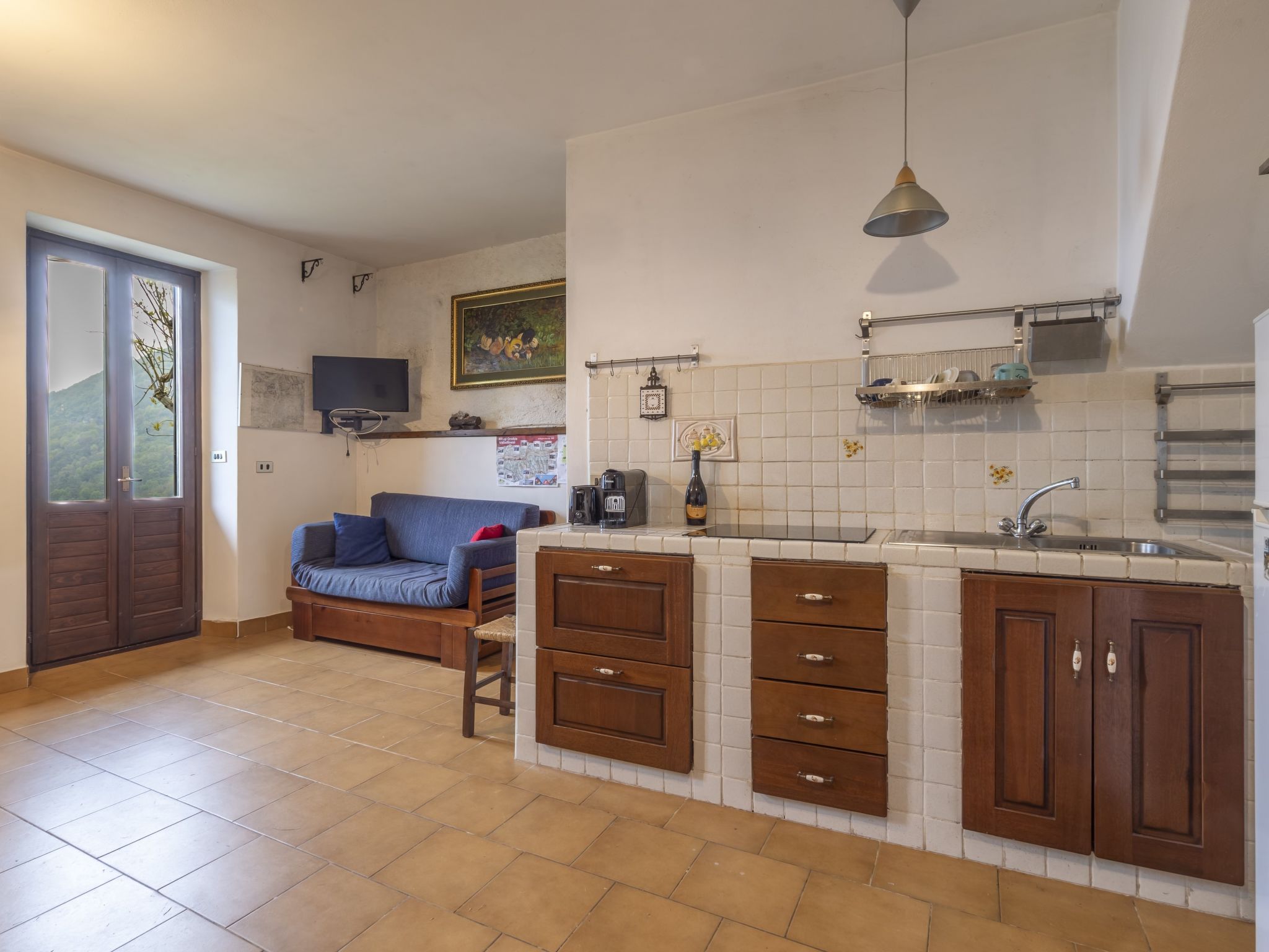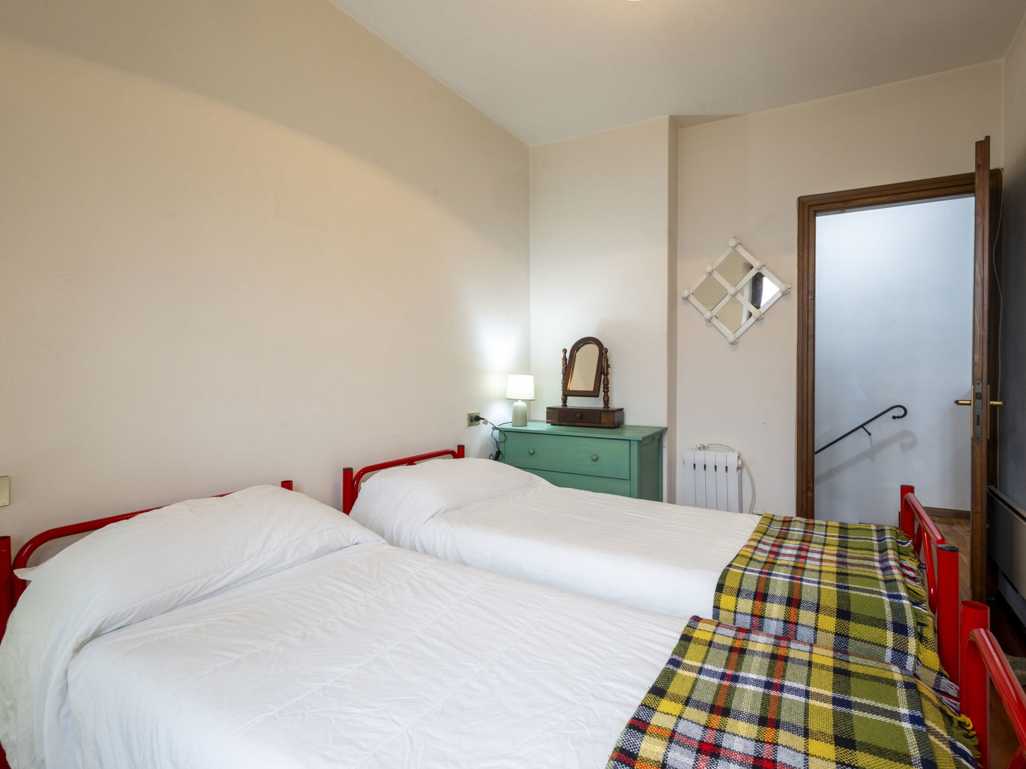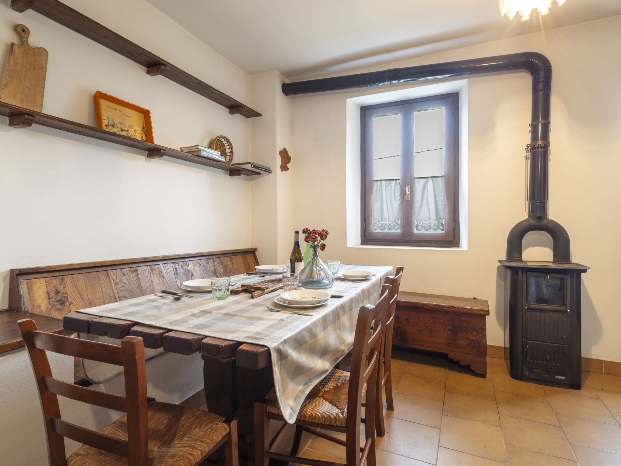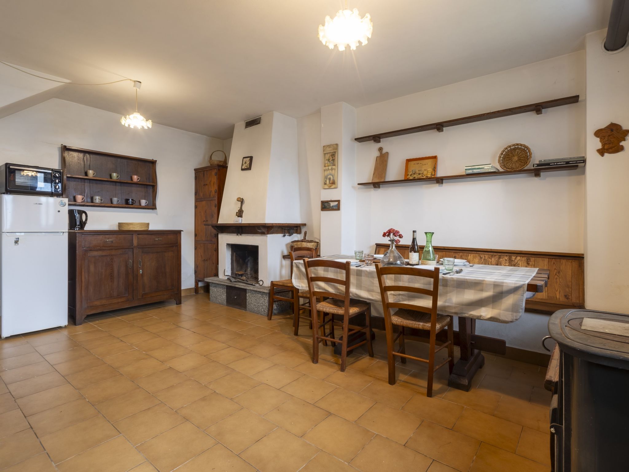 3-room house 84 m2 on 2 levels, south facing position. Bright, practical and rustic furnishings: open living/dining room with open-hearth fireplace (only for decoration), Scandinavian wood stove, dining table and TV. Exit to the garden. Kitchenette (mini-oven, 4 induction hot plates, toaster, kettle, electric coffee machine) with TV. Exit to the garden. Upper floor: 1 room with 1 double bed. Exit to the balcony. 1 room with 2 beds. Exit to the balcony. Shower/bidet/WC. Electric heating, wood heating, boiler. Heating not available in all rooms. Parquet floors. Balcony, garden. Barbecue, deck chairs (2). Beautiful panoramic view of the mountains, the valley and the garden. Facilities: children's high chair, baby cot, hair dryer. Please note: non-smoking house. Maximum 1 pet/ dog allowed. Private entrance, fire extinguisher. IT014005C25CSGKL2B