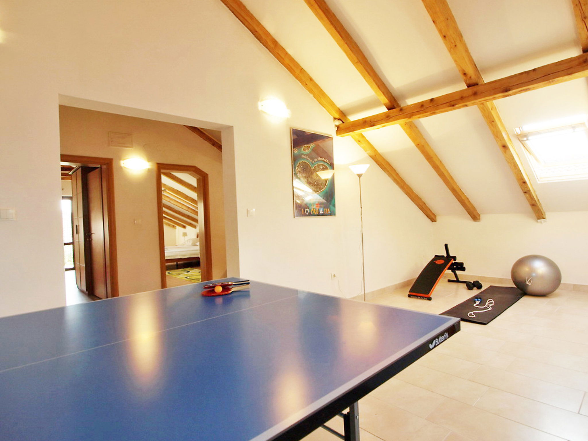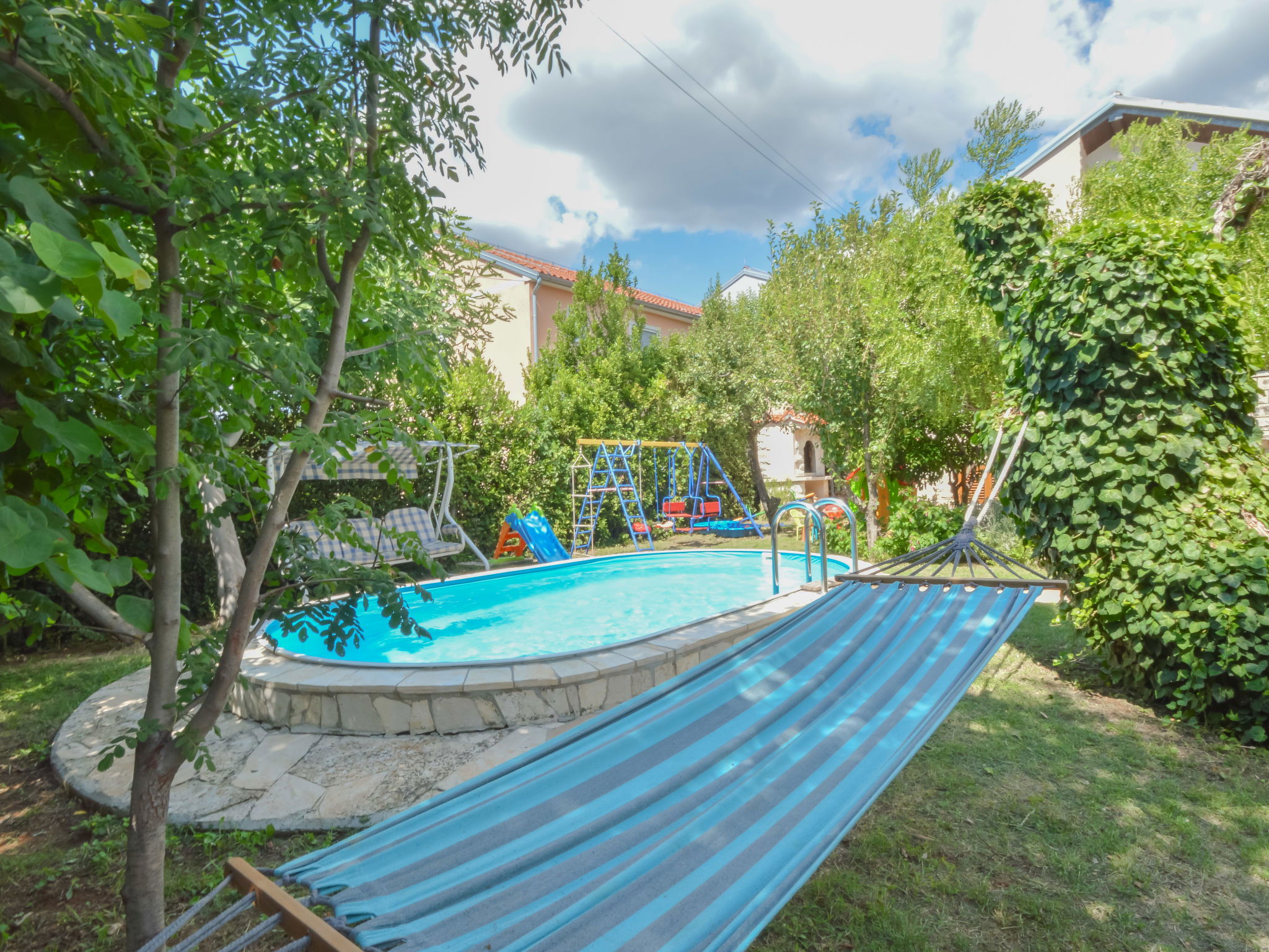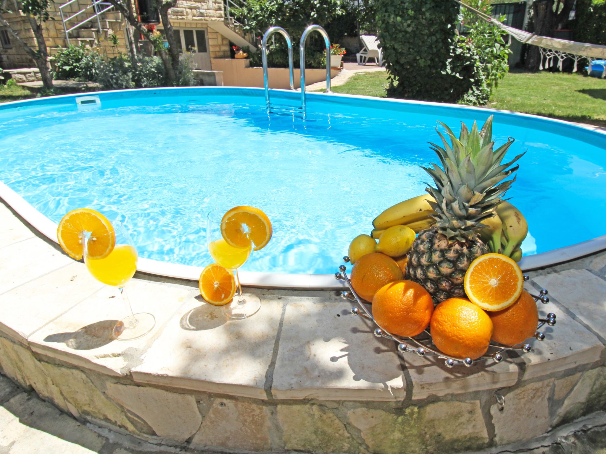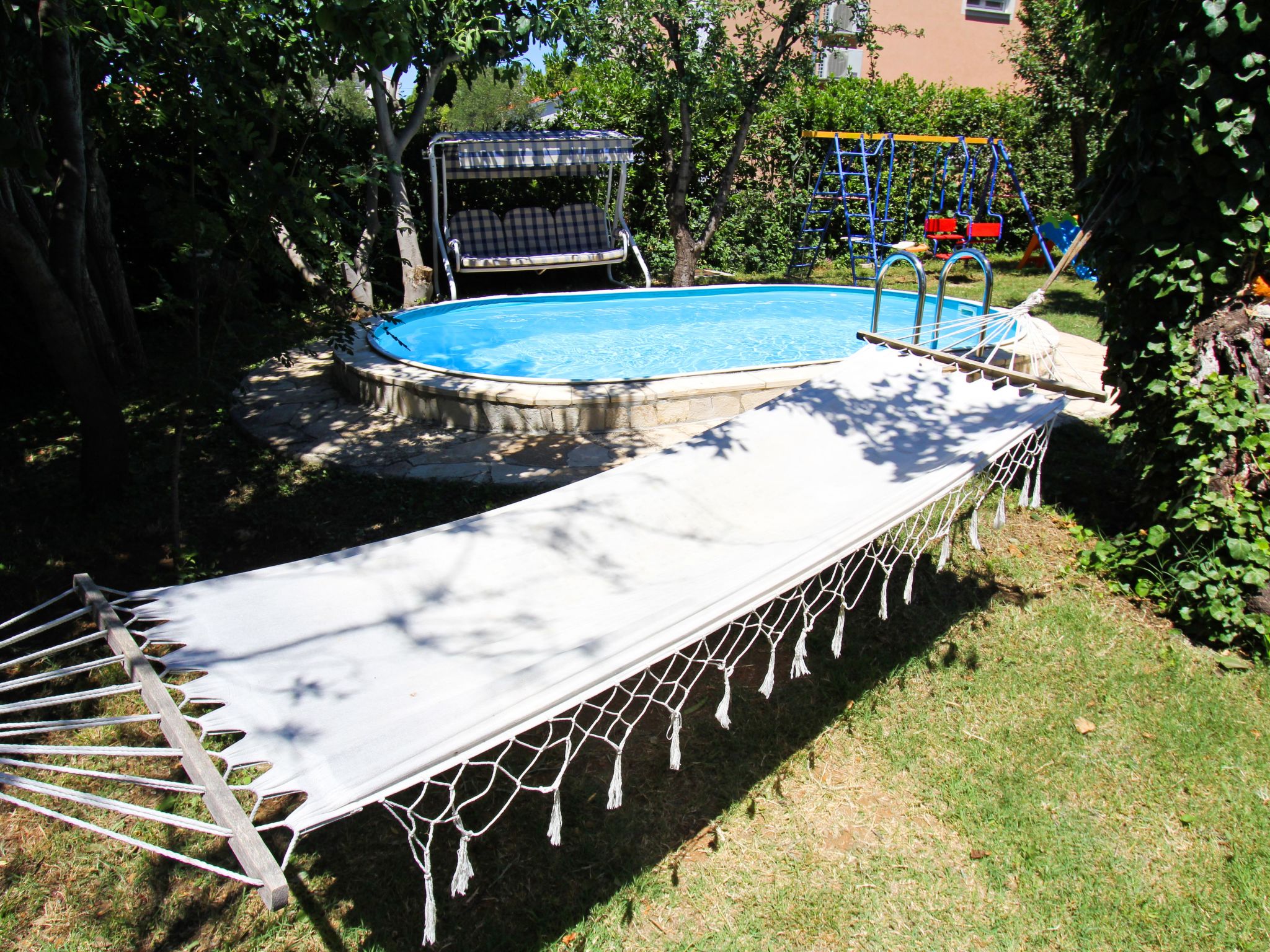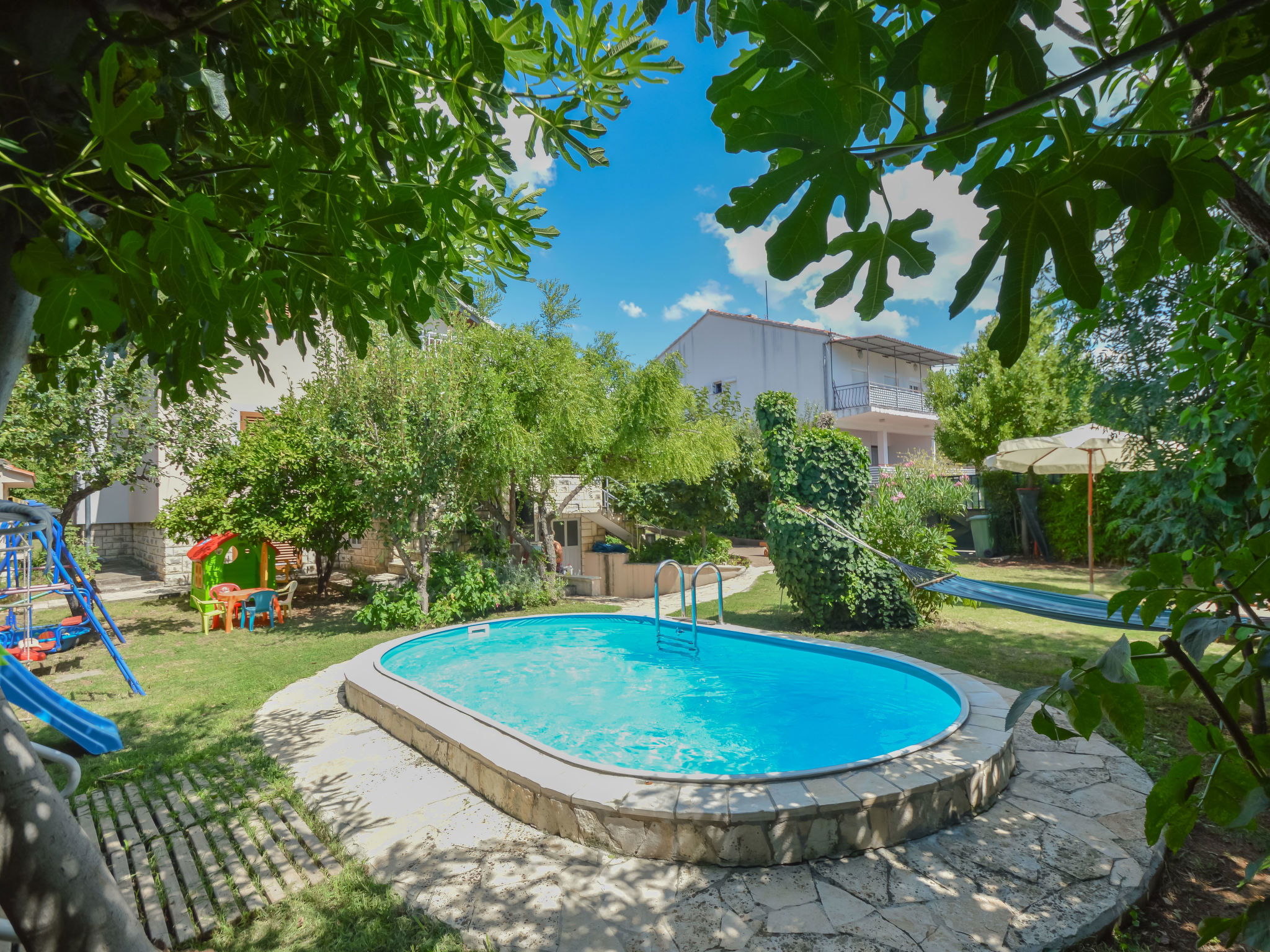 Cosy single-family house "Mihovilka", 2 storeys, renovated in 2016. 500 m from the centre, in a sunny, elevated position, 250 m from the sea, 250 m from the beach, in the countryside. Private: property 1'100 m2 (fenced), garden with wildlife garden and trees, meadow, orchard, swimming pool (3 x 5 m, depth 120 cm, seasonal availability: 01.May. - 15.Oct.). Outdoor shower, barbecue house, children's playground (slide, swing, sandbox). In the house: internet access, sauna, table tennis, billiard table. Available: bicycles (2). Parking at the house on the premises. Shop, restaurant 150 m, bus stop 1.3 km, sandy beach, pebble beach, shingle beach 250 m, diving center 5 km. Surf school 1 km, sailing school 1 km, tennis 300 m, riding stable 25 km. Nearby attractions: amusement park 5.5 km. Local sale of farm products. The swimming pool is oval shaped. Possibility of renting a boat. Possibility of excursions with owners boat (extra). The owner organizes a trip to a small heart shaped island "Galesnjak" well known as Lovers Island. Buoy (on request, extra). Available (included in the price): garden with organic, seasonal fruit (fig, cherry, sour cherry, tangerine, lemon, apple, Japanese apple, jujube, kumquat, pomegranate, medlar, quince).