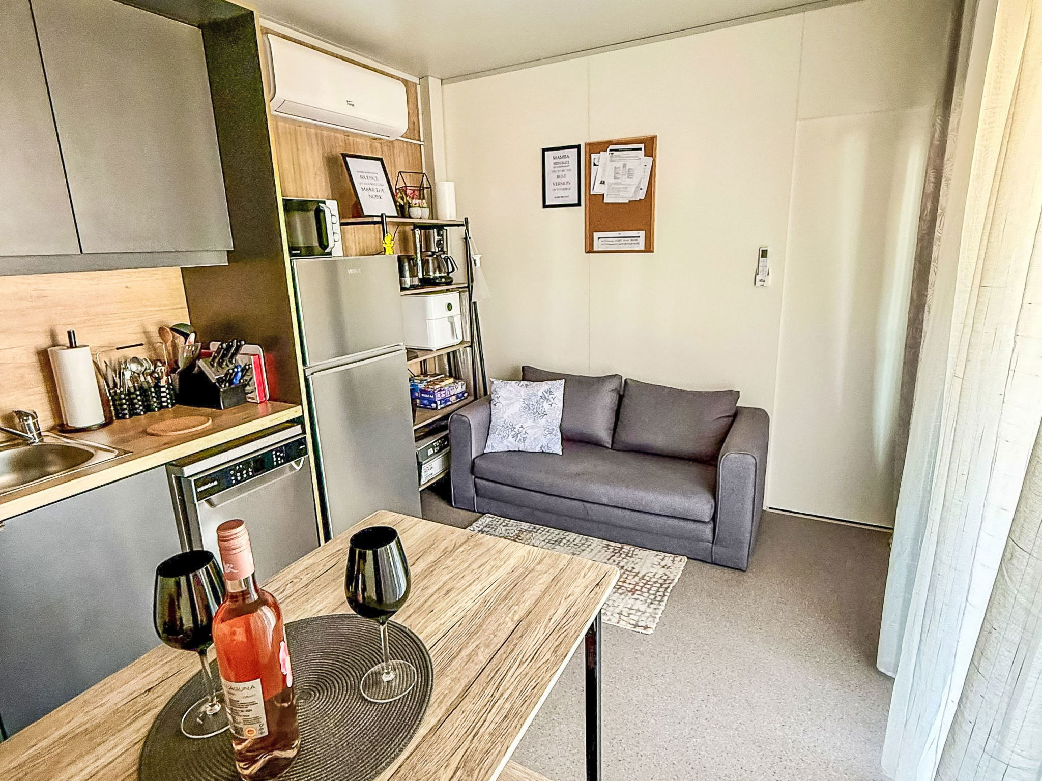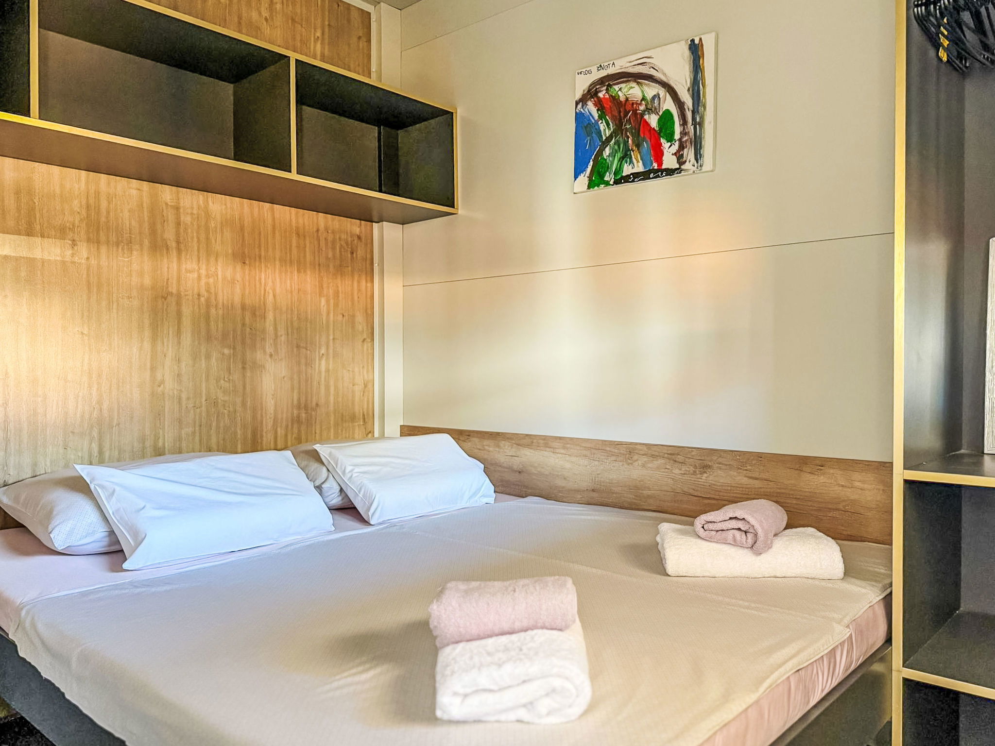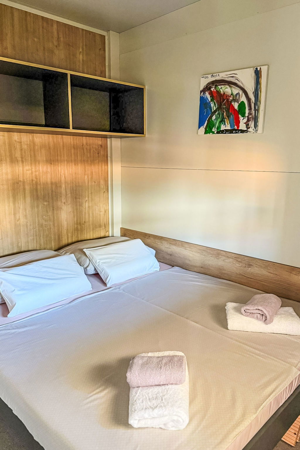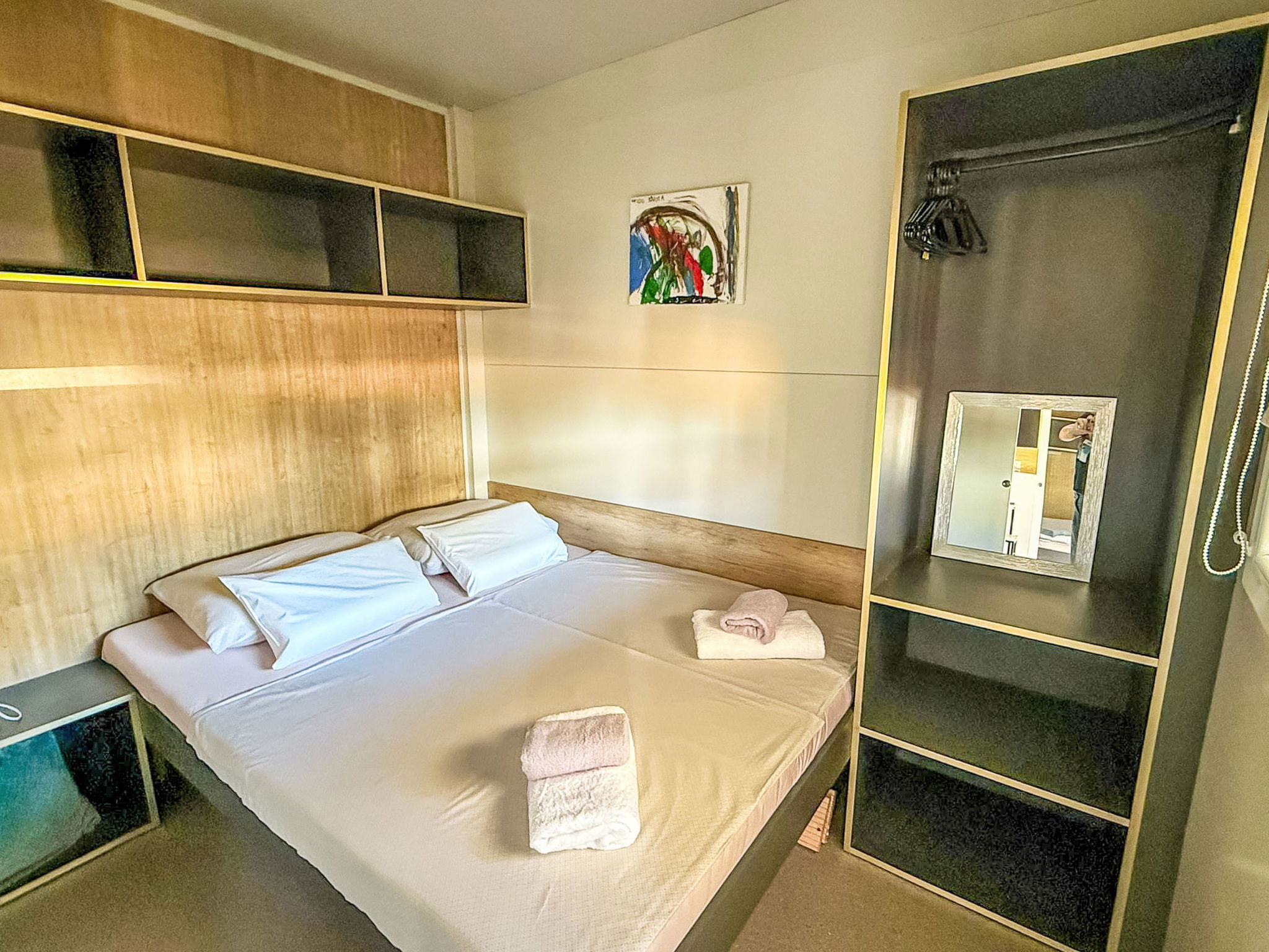 3-room mobile home 24 m2, south facing position. Living/dining room with satellite TV (flat screen), air conditioning. Exit to the terrace. 1 room with 1 french bed (160 cm, length 200 cm). 1 room with 1 french bed (140 cm, length 200 cm). Open kitchen (oven, dishwasher, 2 ceramic glass hob hotplates, freezer, electric coffee machine). Shower/WC. Terrace 15 m2, roofed. Terrace furniture. Facilities: hair dryer. Internet (WiFi, free). Maximum 1 pet/ dog allowed.