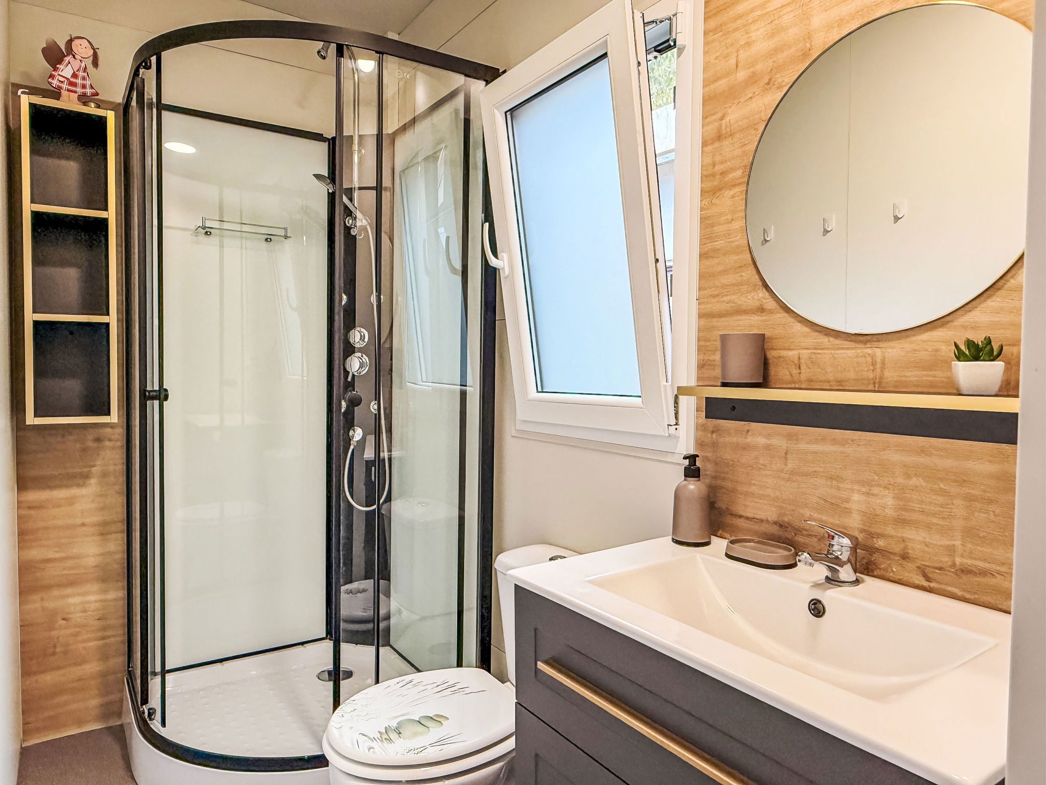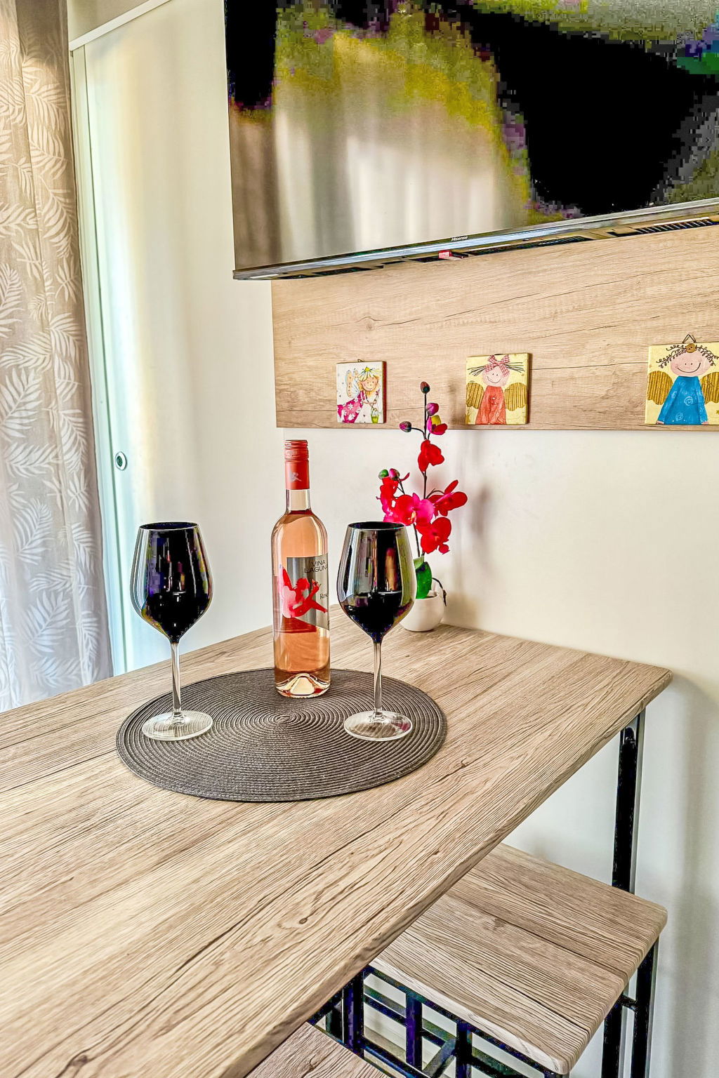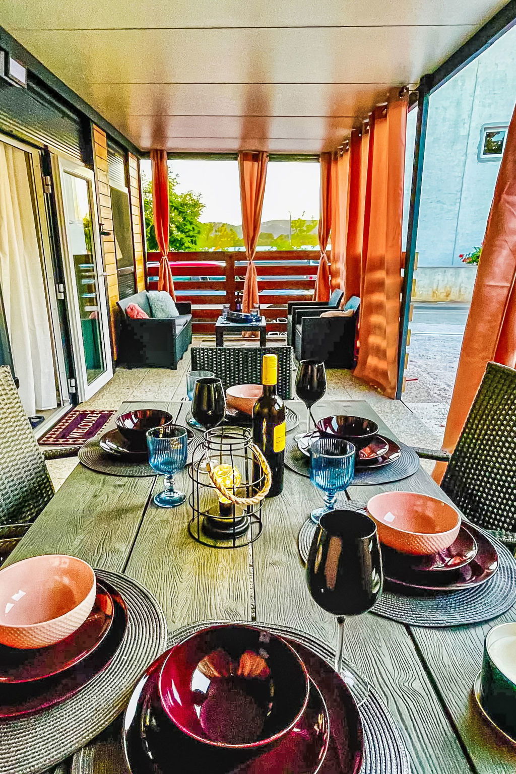 3-room mobile home 24 m2, south facing position. Living/dining room with satellite TV (flat screen), air conditioning. Exit to the terrace. 1 room with 1 french bed (160 cm, length 200 cm). 1 room with 1 french bed (140 cm, length 200 cm). Open kitchen (oven, dishwasher, 2 ceramic glass hob hotplates, freezer, electric coffee machine). Shower/WC. Terrace 15 m2, roofed. Terrace furniture. Facilities: hair dryer. Internet (WiFi, free). Maximum 1 pet/ dog allowed.