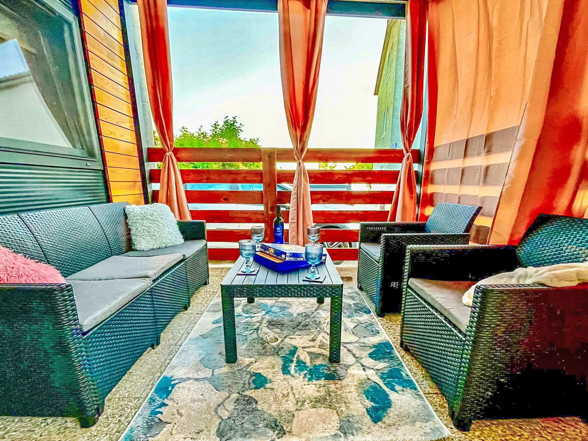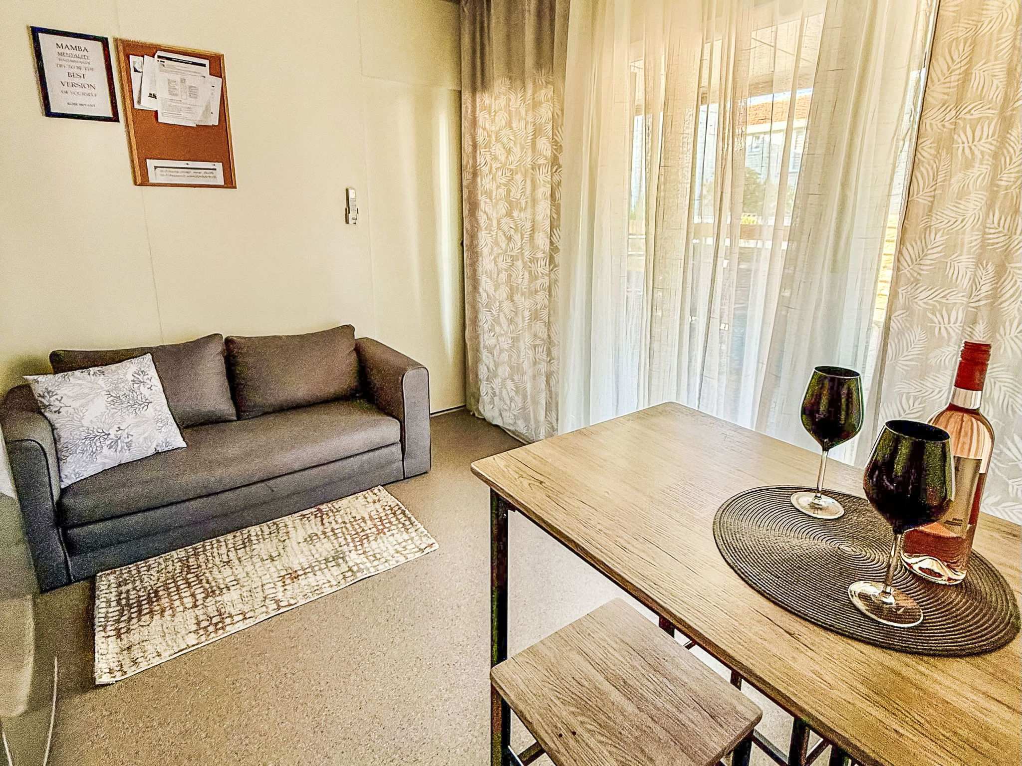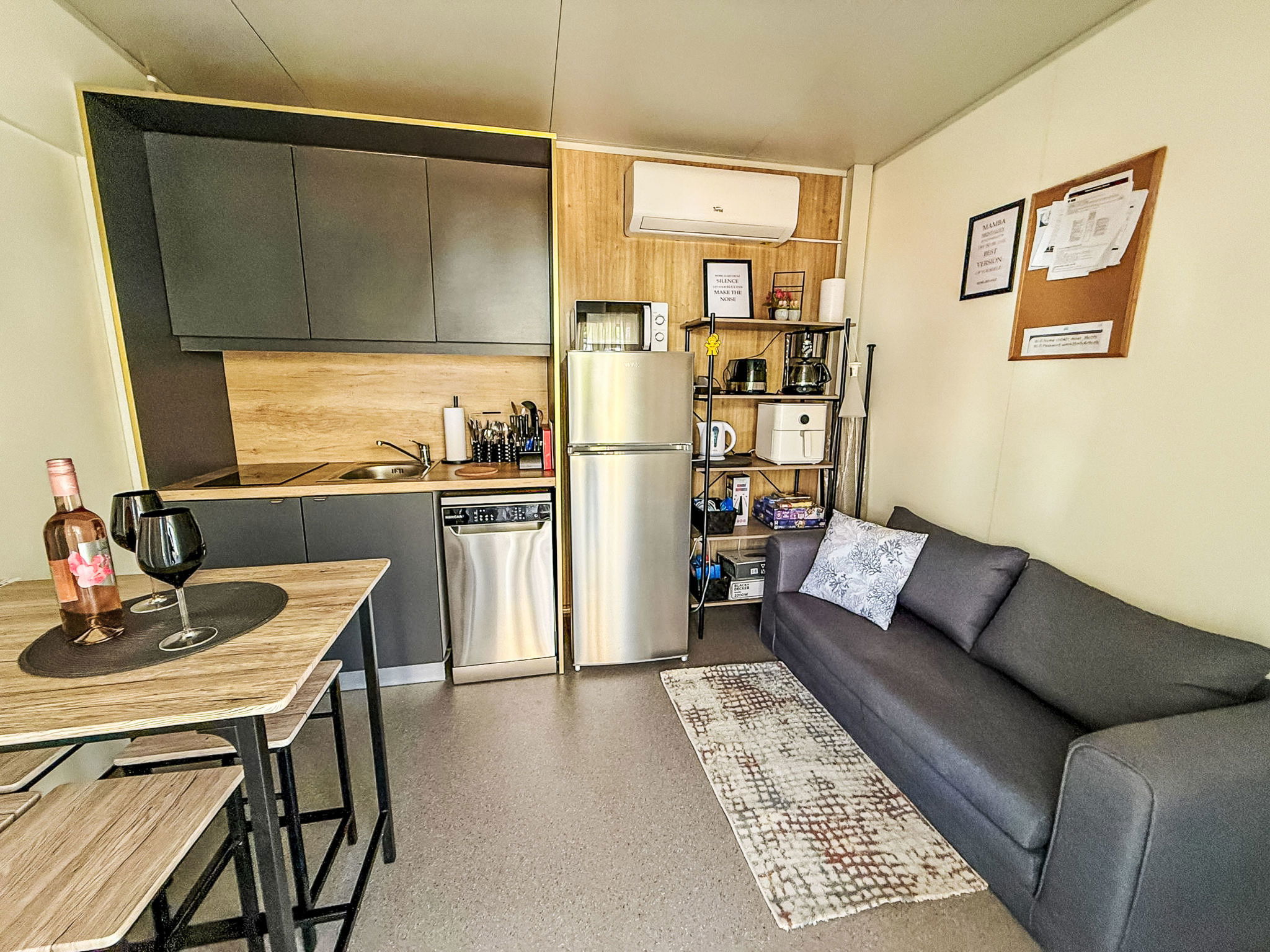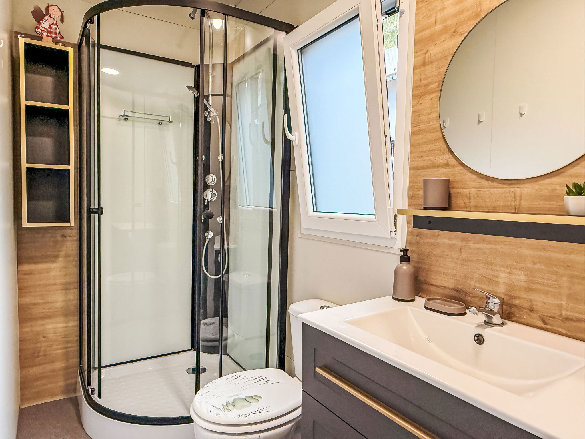 3-room mobile home 24 m2, south facing position. Living/dining room with satellite TV (flat screen), air conditioning. Exit to the terrace. 1 room with 1 french bed (160 cm, length 200 cm). 1 room with 1 french bed (140 cm, length 200 cm). Open kitchen (oven, dishwasher, 2 ceramic glass hob hotplates, freezer, electric coffee machine). Shower/WC. Terrace 15 m2, roofed. Terrace furniture. Facilities: hair dryer. Internet (WiFi, free). Maximum 1 pet/ dog allowed.