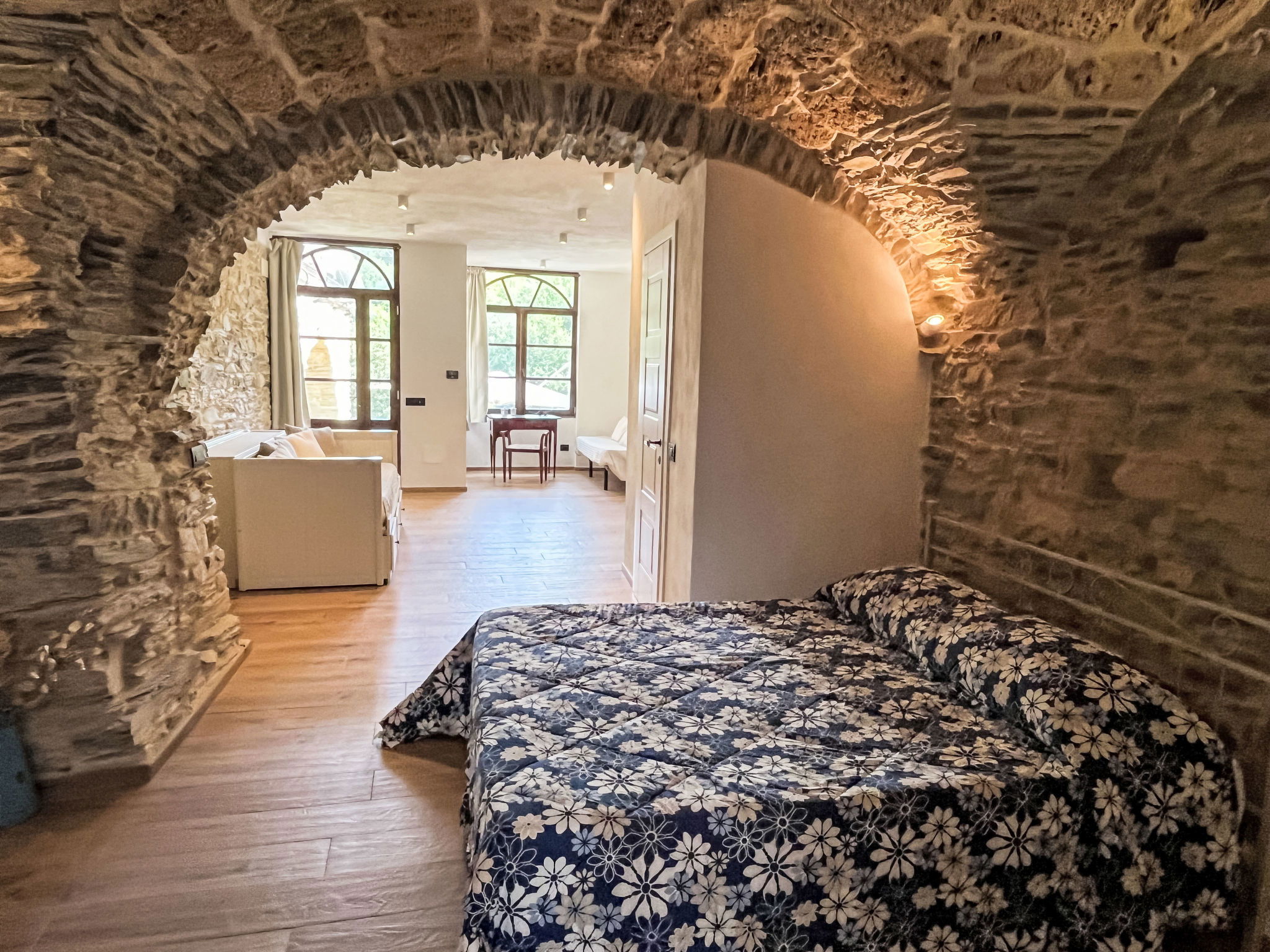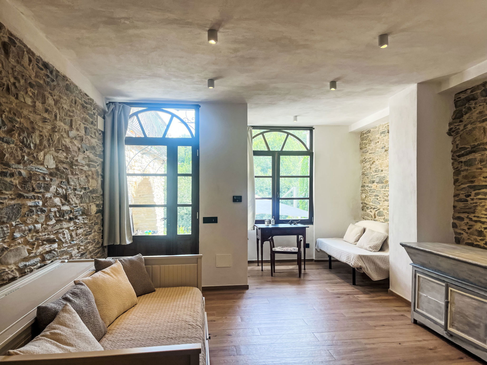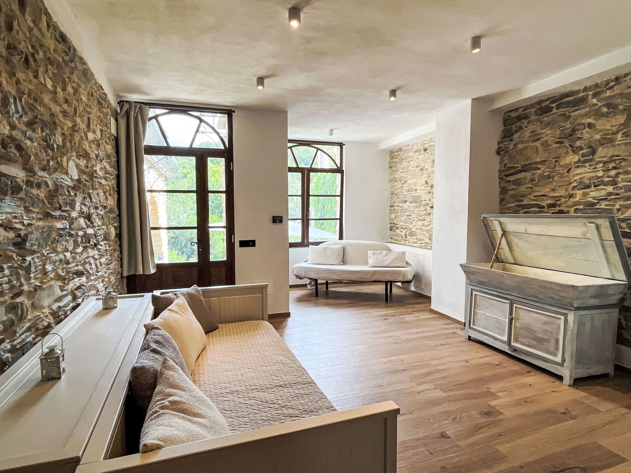 "Ca' de Baudo l'Ameican ", 7-room house 230 m2 on 2 levels. Fully renovated, rustic and tasteful furnishings: 1 room with 2 beds (80 cm), shower/WC. 1 room with 1 french bed (180 cm), shower/WC. Large lounge. Living/sleeping room with 2 beds (80 cm, length 200 cm), 1 double bed (1 x 160 cm, length 200 cm), shower/WC. Kitchen-/living room (mini-oven, oven, dishwasher, 4 gas rings, toaster, kettle, electric coffee machine) with dining table. Exit to the garden. Sep. WC. Upper floor: (exterior staircase) living room with satellite TV. Exit to the terrace. 1 room with 1 french bed (200 cm), shower/WC. 1 room with 1 french bed (160 cm), shower/WC. (ladder) gallery with 1 bed (80 cm, length 170 cm), 1 french bed (180 cm), shower/WC. Gas heating. Natural stone floors. 2 large terraces. Terrace furniture, barbecue, deck chairs (8). Beautiful panoramic view of the countryside and the resort. Facilities: washing machine, dryer, iron, children's high chair, baby cot, hair dryer. Internet (WiFi, free). Please note: maximum 2 pets/ dogs allowed. Smoke alarm, fire extinguisher. No internal connecting door between the floors. When there are less than the maximum number of guests staying at the property, not all of the bedrooms will be available for use. IT008047B5VVKGQ99M