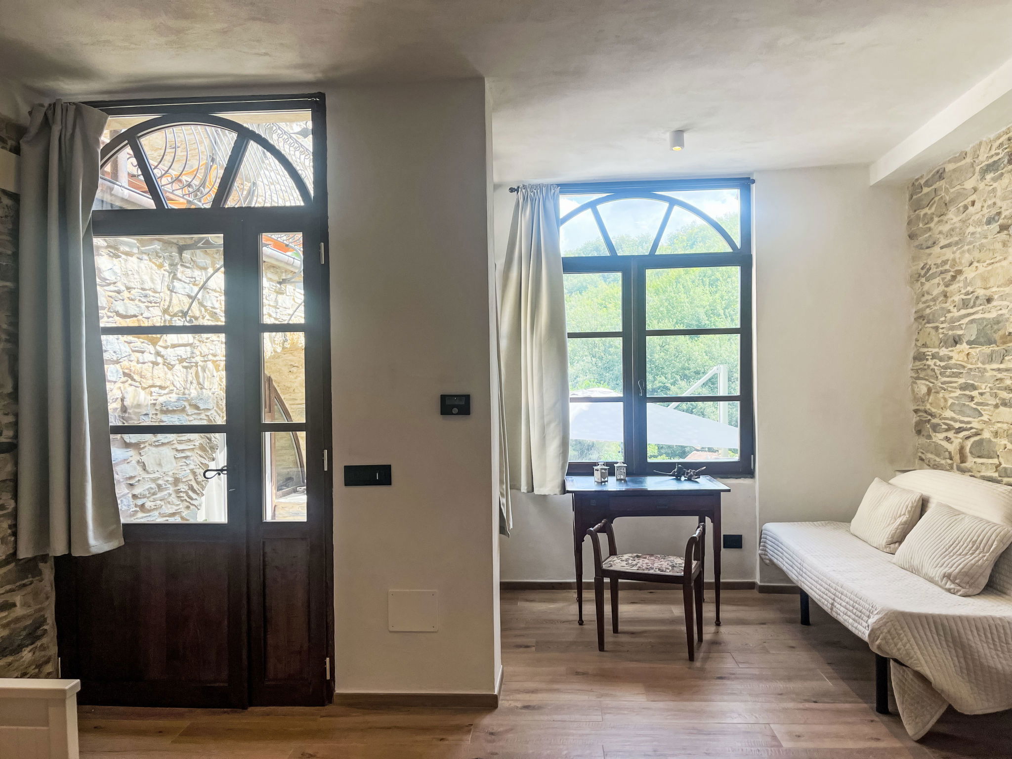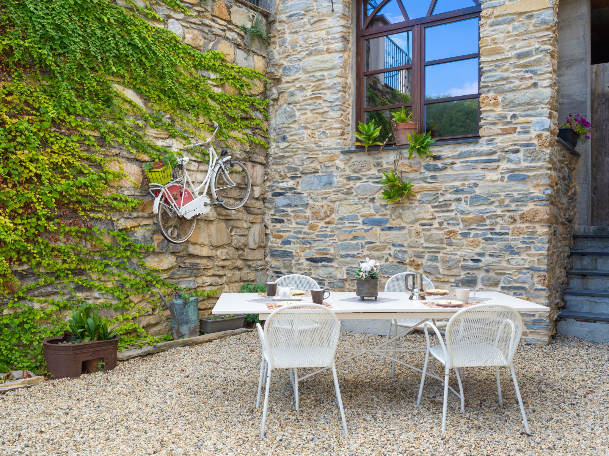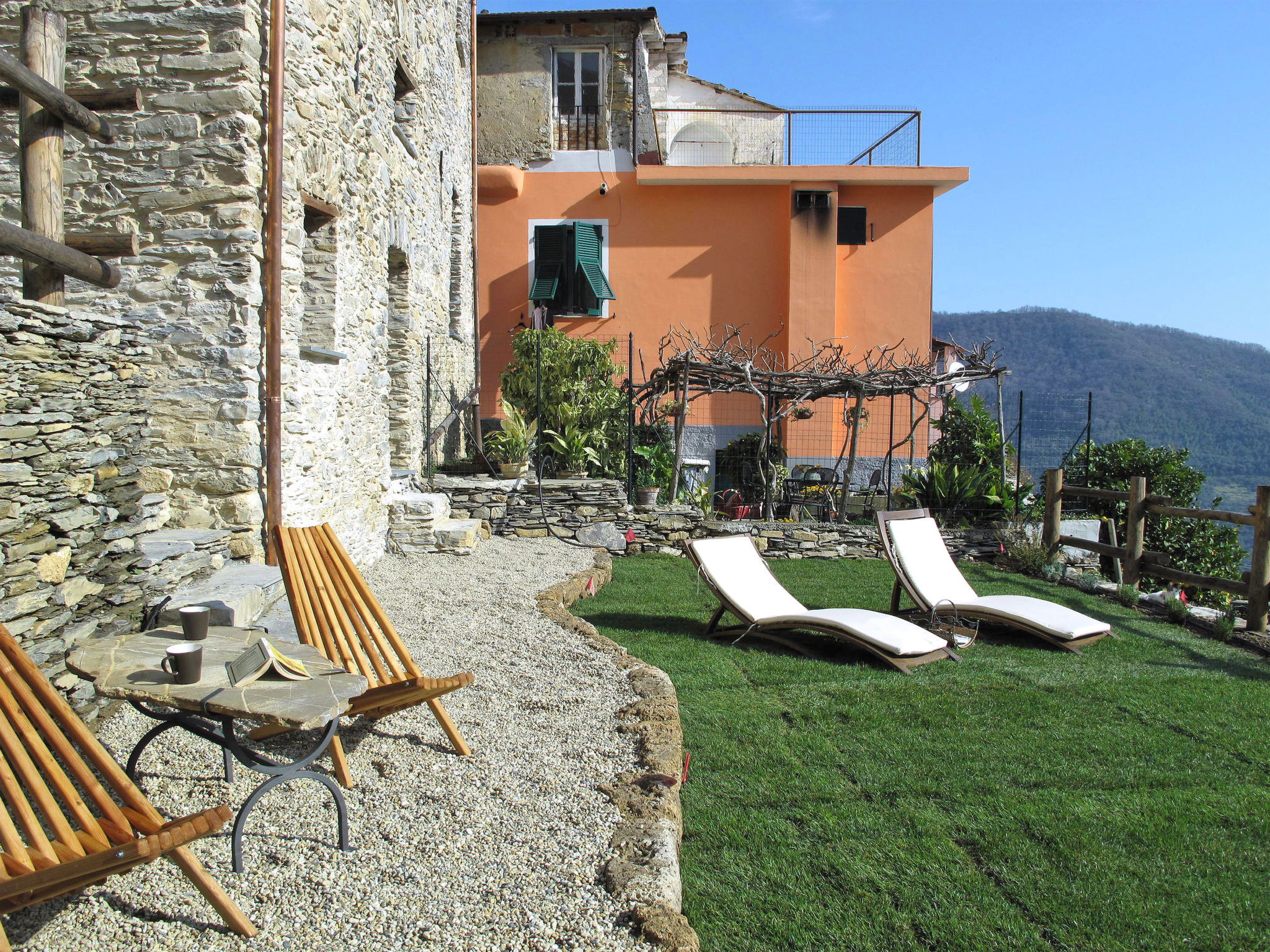 Large, beautiful, comfortable single-family house "Agriturismo Ca'de Baudo l'Ameican", 2 storeys, semi-detached. In the resort Tavole, 5 km from the centre of Prelà, 16 km from the centre of Imperia, in a sunny, elevated position, 16 km from the sea, in a pedestrian area. Private: beautiful, well-kept terraced garden, 120 m2 with lawn and wildlife garden, meadow, orchard, pond, swimming pool (8 x 4 m, depth 140 cm, seasonal availability: 15.Apr. - 15.Nov.). WC in the pool area, outdoor shower, pool house with fridge and cooking stove, boules, terrace, garden furniture, barbecue, children's playground, planted inner courtyard. In the house: lounge, table football, storage room for bicycles. 50 m footpath to the house. Public parking 50 m. Shop 4 km, grocery 5 km, supermarket 16 km, restaurant 3 km, bar 300 m, bakery 4 km, café 5 km, bicycle rental 10 km, bus stop 100 m, railway station "Imperia / Porto Maurizio" 18 km, sandy beach "Imperia" 16 km pebble beach "Borgo Prino" 16 km, shingle beach "Borgo Foce Imperia" 16 km, public bathing area 3 km, bathing lake "Laghetti". Riding stable 8 km, walking paths from the house 100 m, cycle lane 15 km. Nearby attractions: Valloria, paese delle porte dipinte 3 km, Tra i mondi Skulpturenpark Lingueglietta 22 km, Bussana Vecchio Erdbebendorf 30 km, Triora Hexendorf 55 km, Monte Carlo Monaco 65 km, San Remo 35 km. Hiking paths: Monte Faudo (1000 m) 6 km, Sentiero dei Santuari, Kapellenrundweg 100 m. Groups of teenagers on request only.
