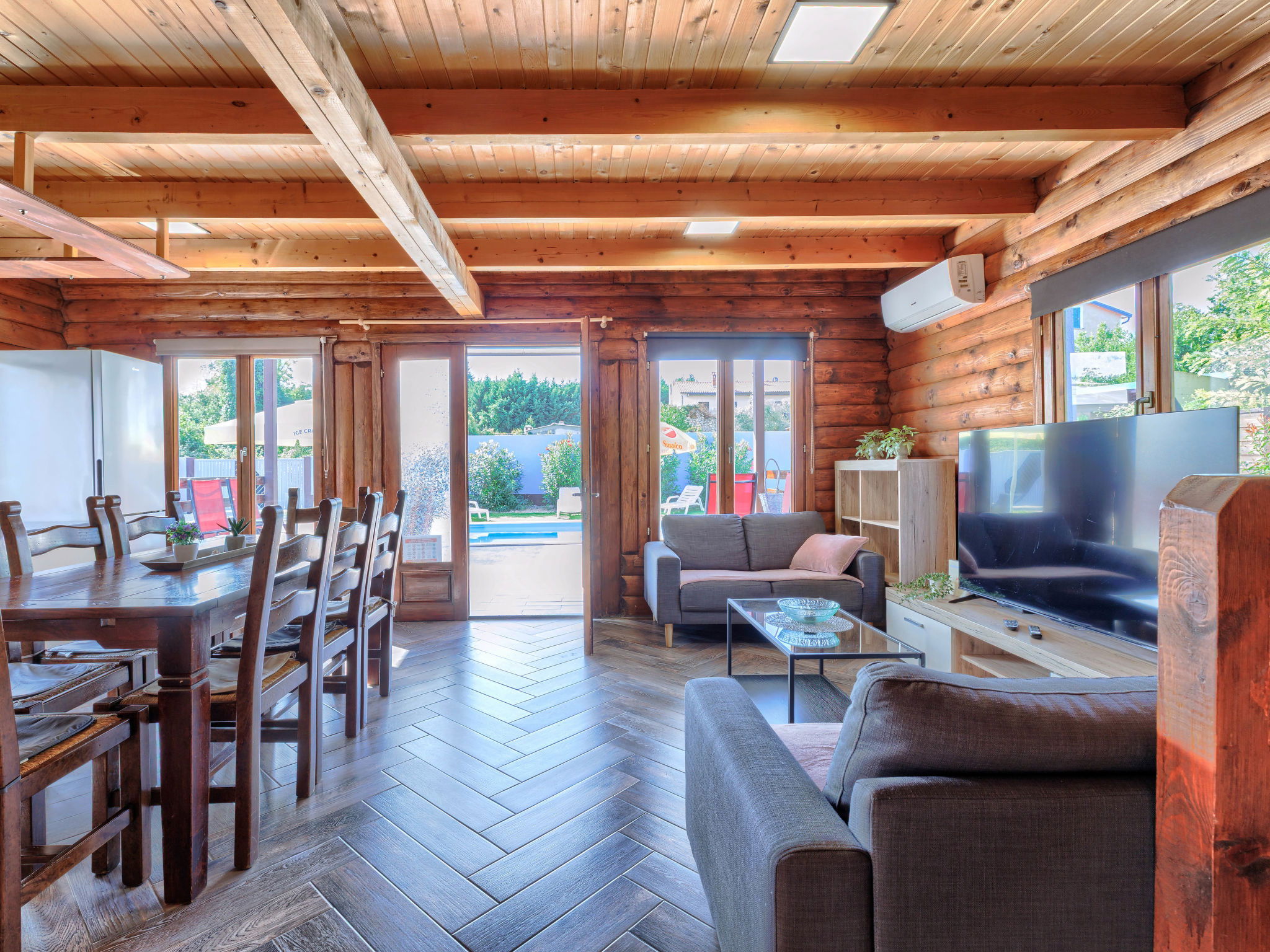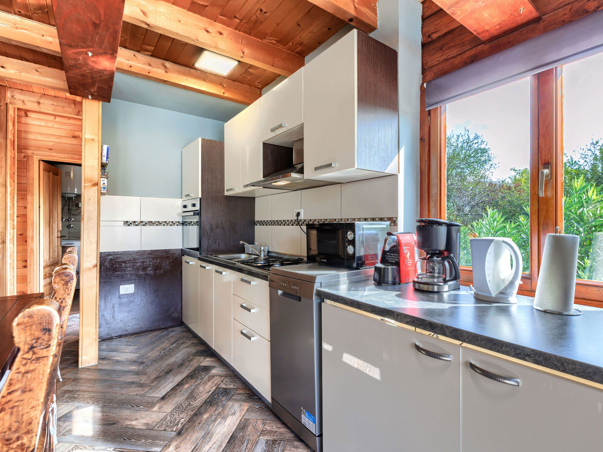 5-room house 120 m2 on 2 levels. Living/dining room with satellite TV (flat screen), wood-burning stove and air conditioning. Exit to the terrace. 1 room with 1 french bed (160 cm). Open kitchen (4 hot plates, oven, dishwasher, microwave, freezer, electric coffee machine). Shower/WC. Wood heating. Upper floor: (open staircase) entrance hall with air conditioning. 3 rooms, each room with 1 french bed (180 cm). Shower/WC. Forced-air heating. Terrace 18 m2, roofed. Terrace furniture, deck chairs, box-room. Facilities: iron, logs (free). Internet (WiFi, free). Please note: non-smoking house. Maximum 1 pet/ dog allowed. Steep stairs towards the upper floor.