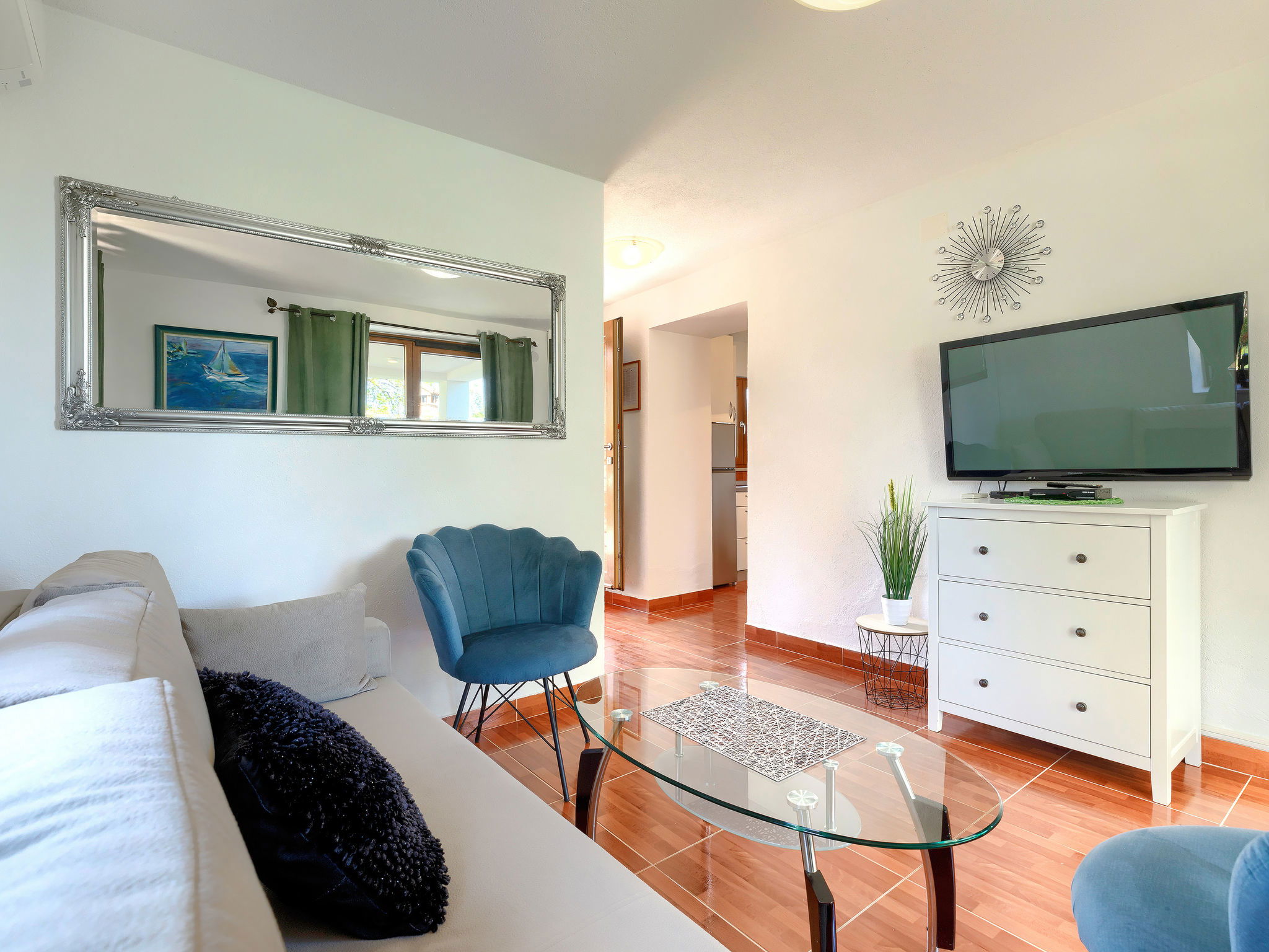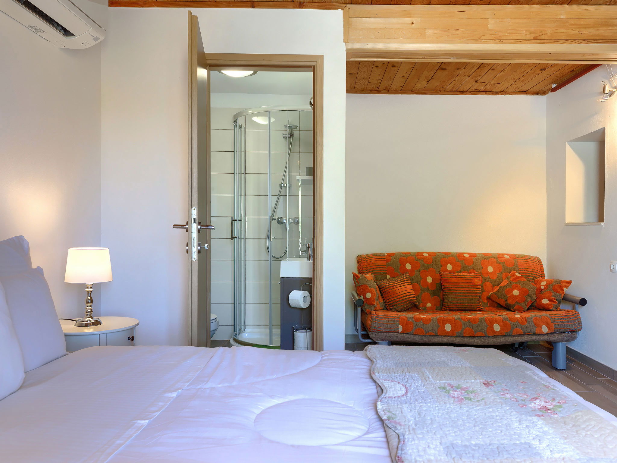 3-room house 63 m2 on 2 levels. Living room with 1 sofabed (140 cm, length 200 cm), satellite TV and air conditioning. Exit to the terrace. Dining room. Open kitchen (4 hot plates, oven, dishwasher). Shower/WC. Upper floor: (exterior staircase), 1 room with 1 french bed (160 cm, length 200 cm), shower/WC and air conditioning. Exit to the terrace. 1 room with 1 french bed (160 cm, length 200 cm). Exit to the terrace. Terrace 9 m2, terrace 5 m2. Terrace furniture. Distant view of the sea. Maximum 2 pets/ dogs allowed.