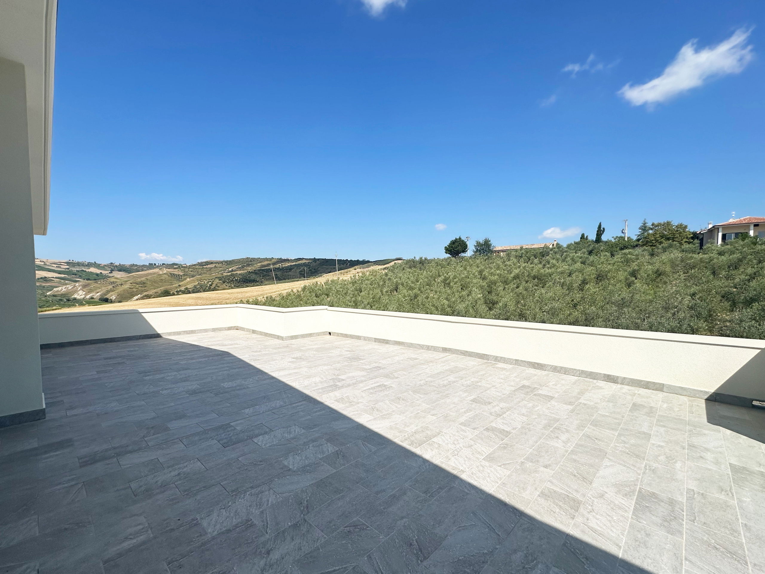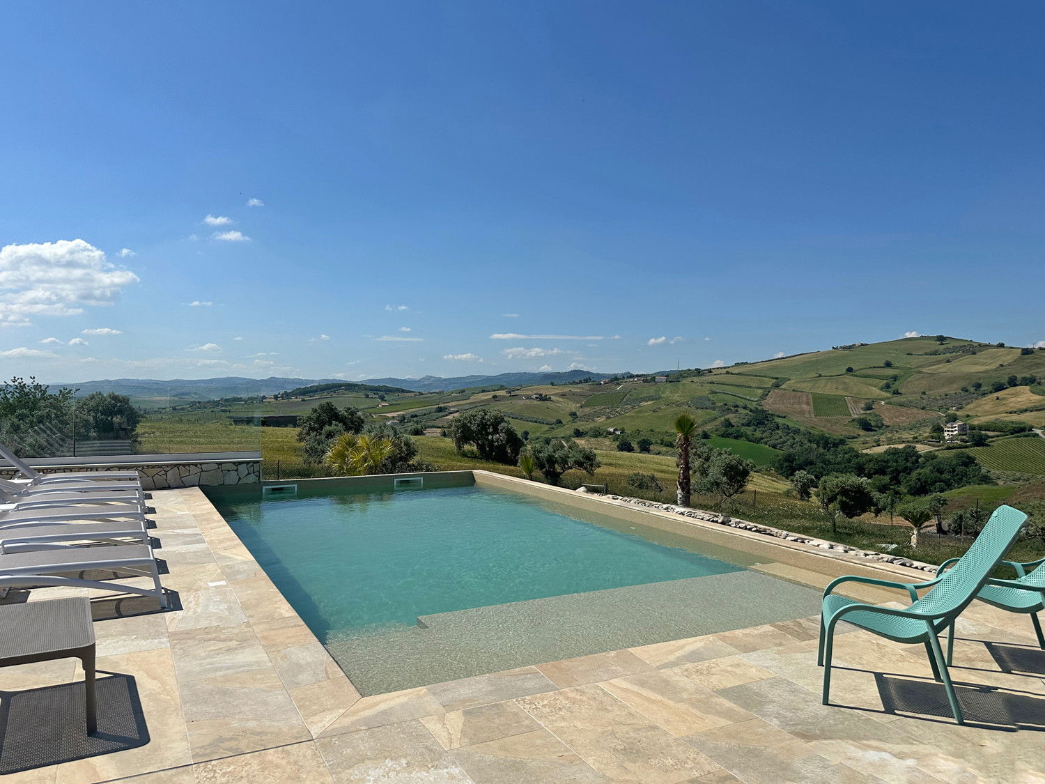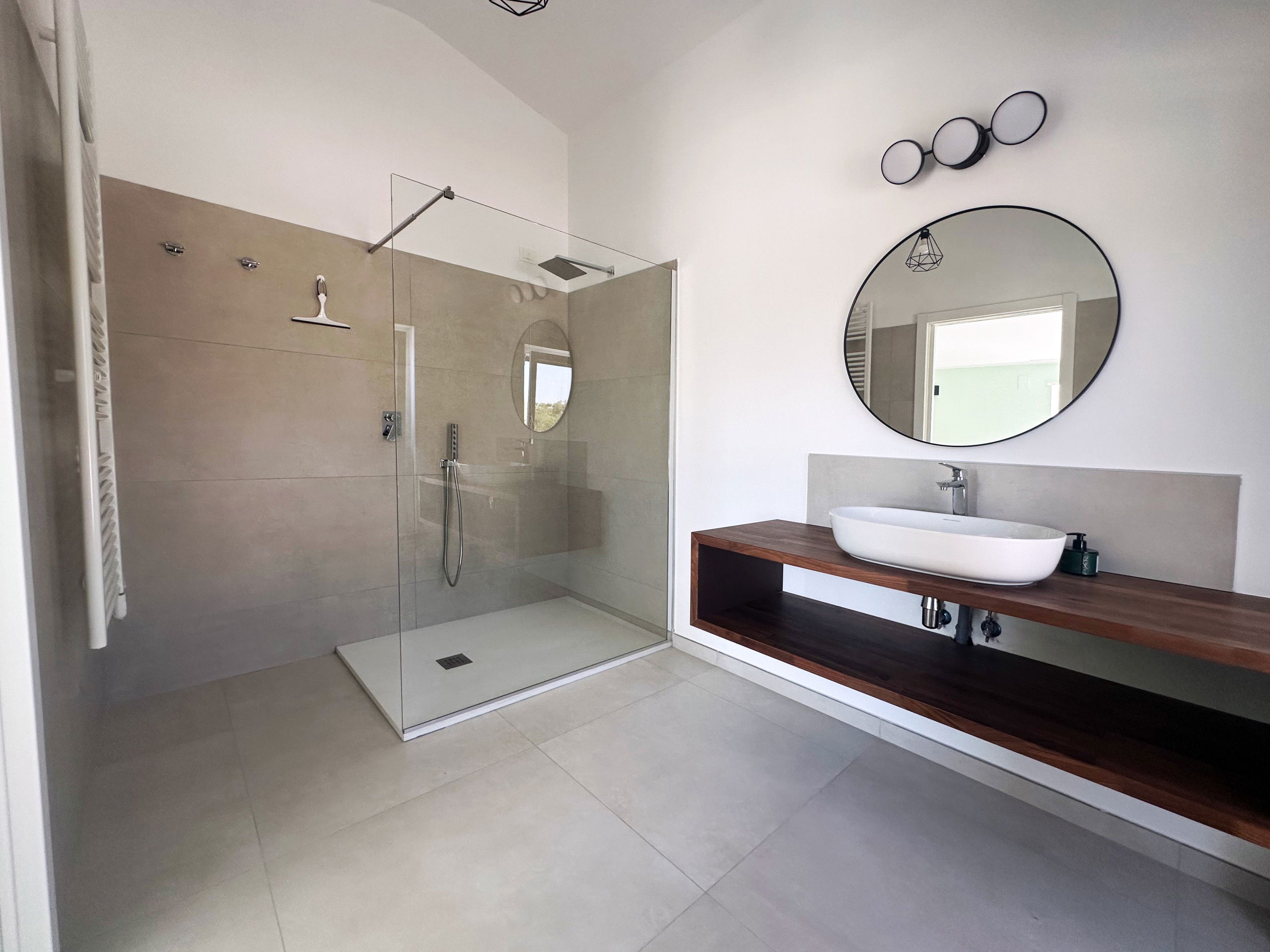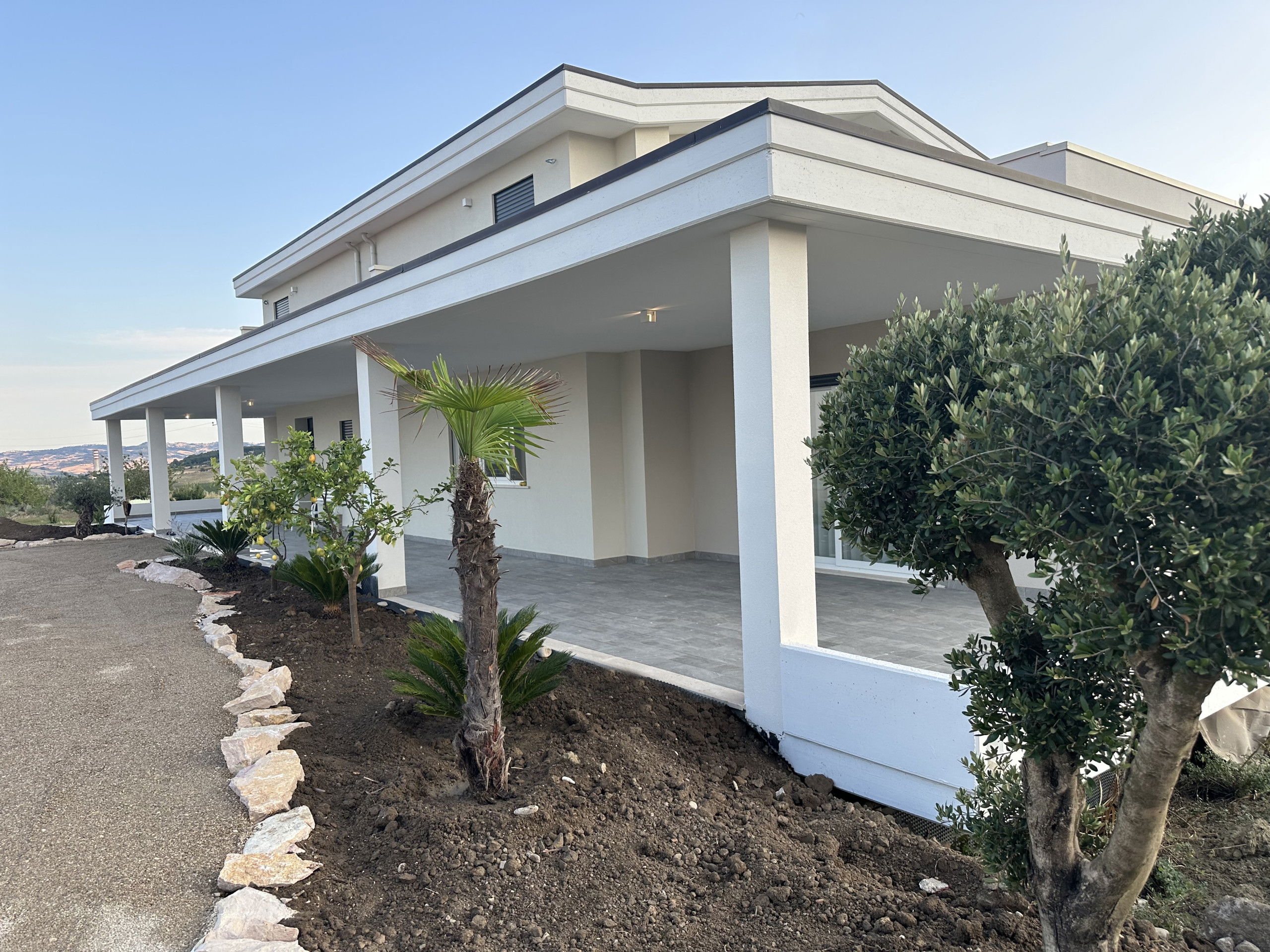 On the ground floor, you will find the living areas: an American kitchen equipped for a large family (1 fridge + 1 American fridge) with a central island and dining room, 1 living room with panoramic view, as well as a 2nd living room equipped with a library and smart TV / giant screen). The villa receives high-speed internet (Starlink). A very beautiful 50m2 panoramic terrace that accompanies the (10m/5m) infinity pool will offer you a breathtaking view of the Cupello valley on the garden side and the Sea view on the facade side. The parking is secured by an automatic gate that can accommodate 10 cars and 3 in the garage.