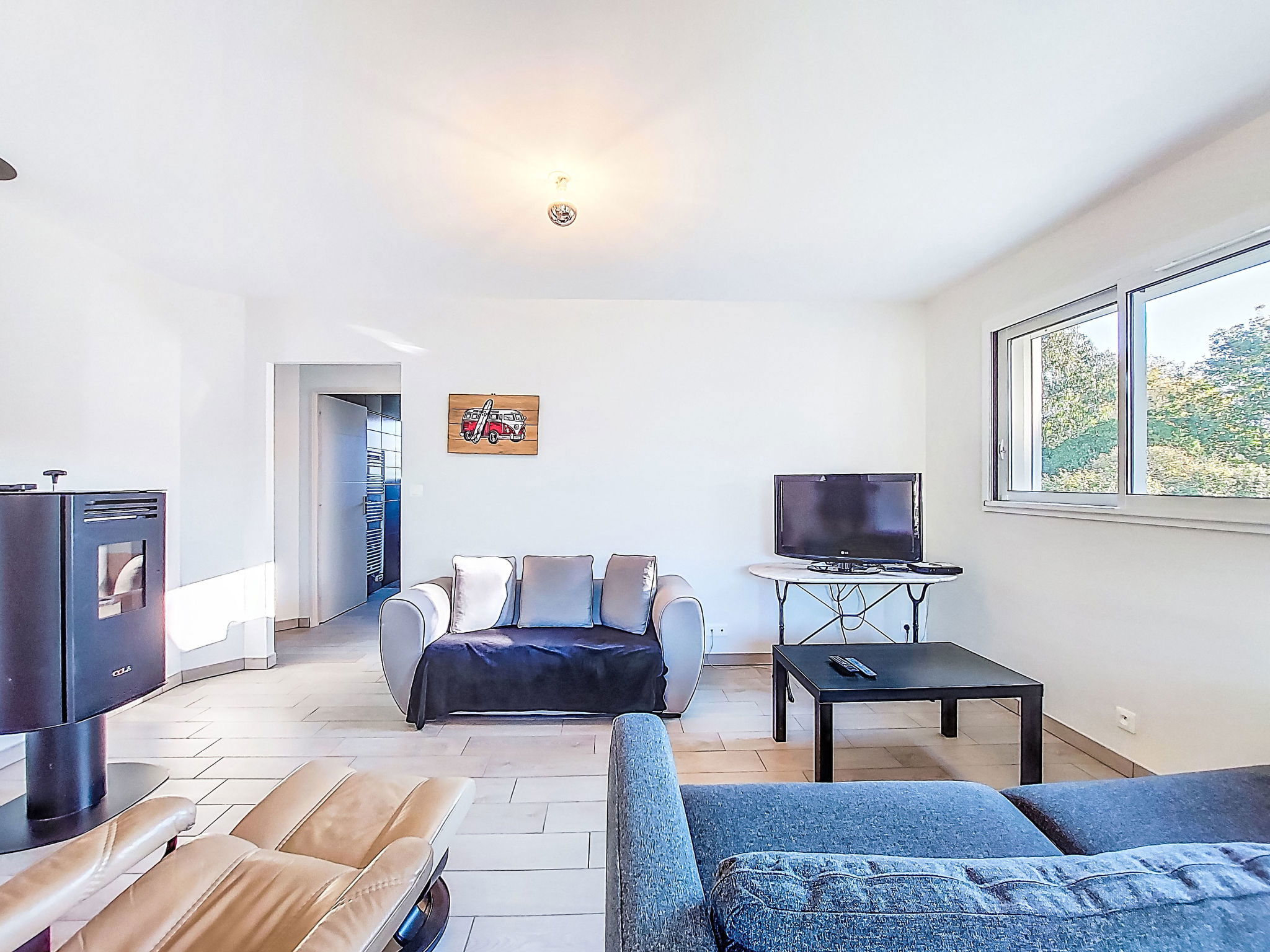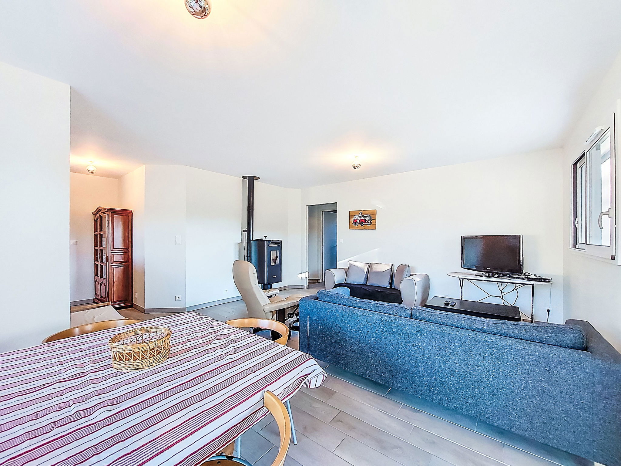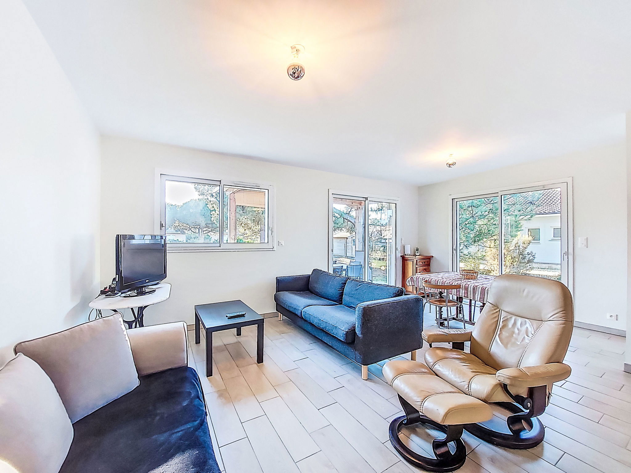 "Les Arbousiers", 4-room house 83 m2. Bright, practical furnishings: living/dining room with dining table and TV (flat screen). Exit to the terrace. 3 rooms, each room with 1 french bed (140 cm, length 190 cm). Open kitchen (oven, dishwasher, 3 induction hot plates, toaster, kettle, microwave, freezer, electric coffee machine). Shower, sep. WC. Wood heating. Terrace roofed. Terrace furniture, barbecue (portable), deck chairs. Facilities: iron. Internet (WiFi, free). Please note: non-smoking house. Maximum 1 pet/ dog allowed. Smoke alarm. Offer by a private individual according to Art. 155, IV of CGI.
